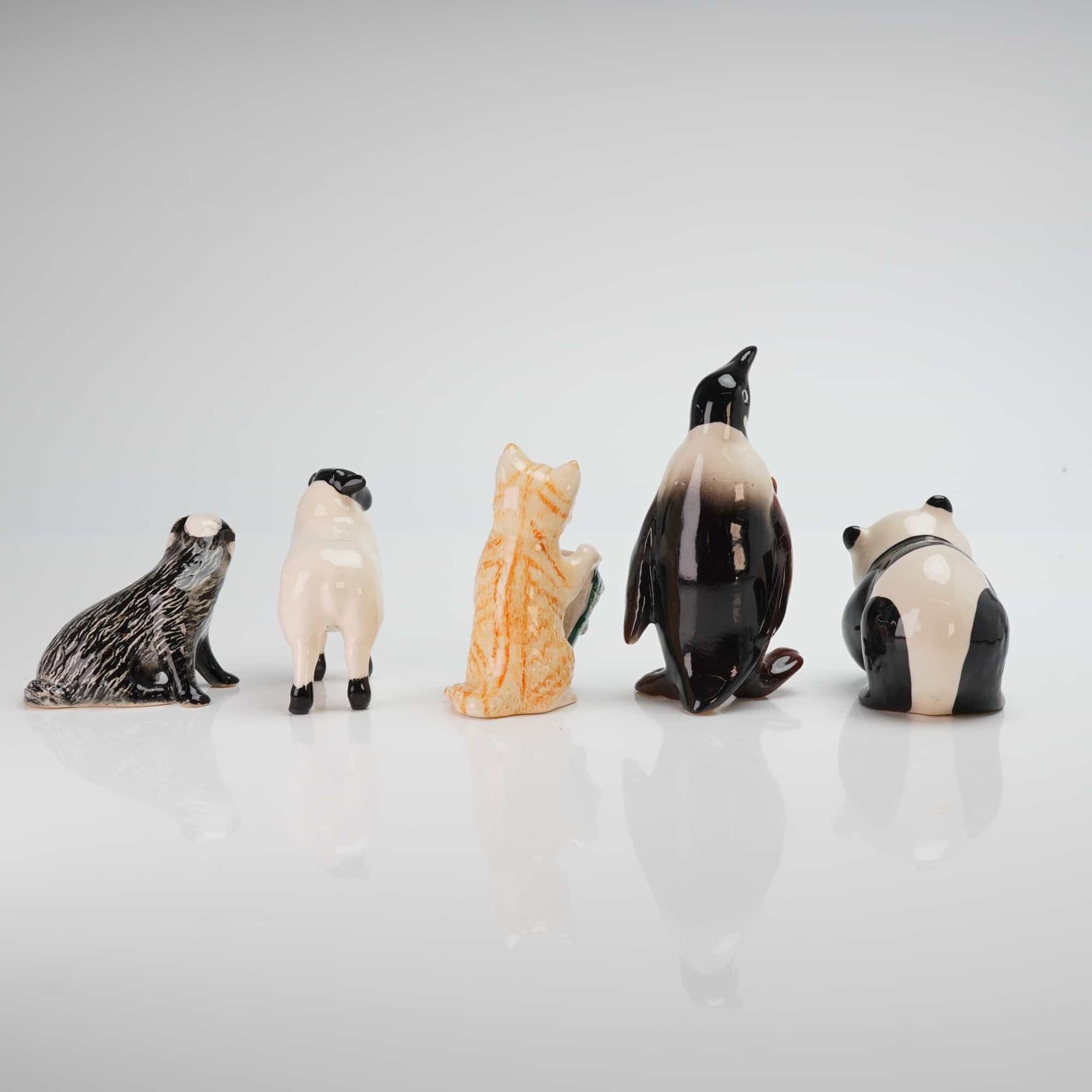 A collection of five Beswick and Royal Doulton glazed ceramic animal figurines. The group includes a badger, a sheep, a cat holding a green checkered blanket, a penguin, and a panda. Each piece is modeled in a stylized, representational manner with a high-gloss finish. The cat figure bears the Royal Doulton Made in England backstamp. The badger, penguin, and panda figurines are marked with Beswick England stamps. Measurement is for largest item.