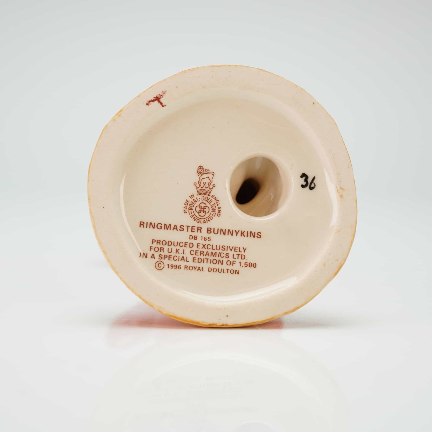 The piece depicts an anthropomorphic rabbit in traditional circus attire, featuring a red tailcoat, white waistcoat with a black bow tie, and black trousers. The figure is posed tipping a black top hat with its right hand and holding a coiled yellow whip in its left hand. The figurine is mounted on a circular, textured base with a light brown glaze. The underside is marked with the Royal Doulton lion and crown backstamp and includes the text: RINGMASTER BUNNYKINS, DB 165, PRODUCED EXCLUSIVELY FOR U.K.I. CERAMICS LTD. IN A SPECIAL EDITION OF 1,500, and 1996 ROYAL DOULTON. A handwritten number 36 and a small red potter mark are also present on the base.