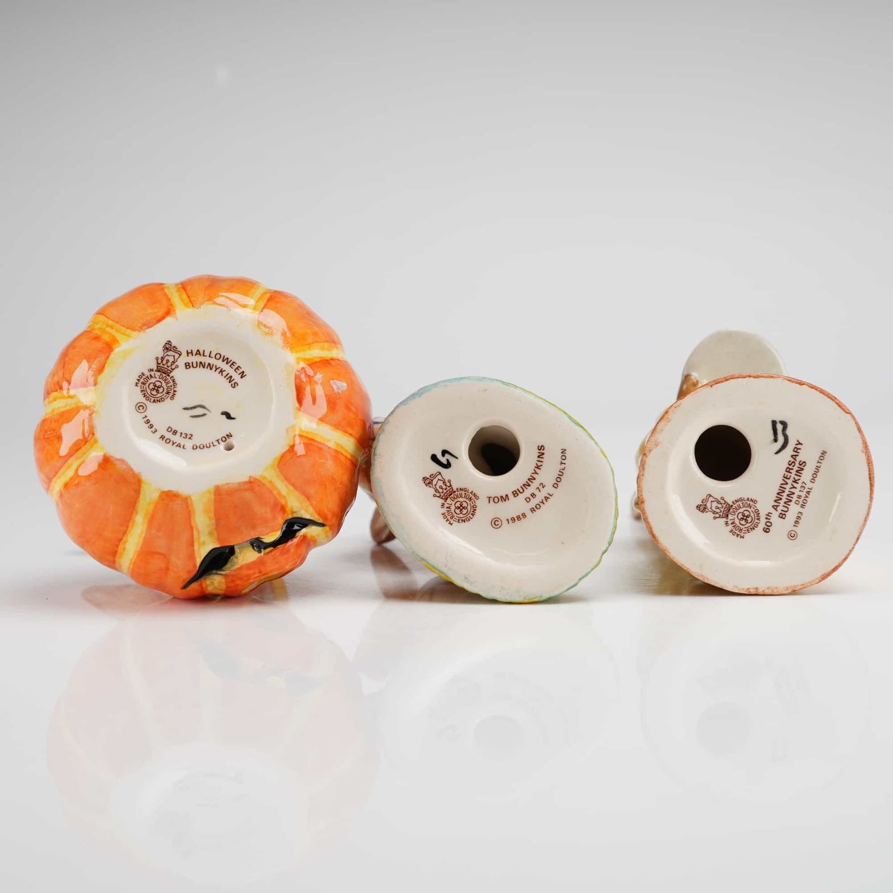 A group of five Royal Doulton Bunnykins ceramic figurines. The collection includes Tom DB72, Father DB154, Halloween D132, Cinderella DB231, and the 60th Anniversary DB137. Each figurine is hand-made and hand-decorated with a high-gloss glaze finish. The pieces feature the official Royal Doulton backstamp on the underside, with copyright dates ranging from 1988 to 2002. The characters are depicted in various costumes and poses, such as a bunny in a jack-o-lantern and others in traditional or period-style dress. Father DB154 is identified as the Bunnykins of the Year 1996, and Cinderella DB231 is an exclusive for the Royal Doulton International Collectors Club.