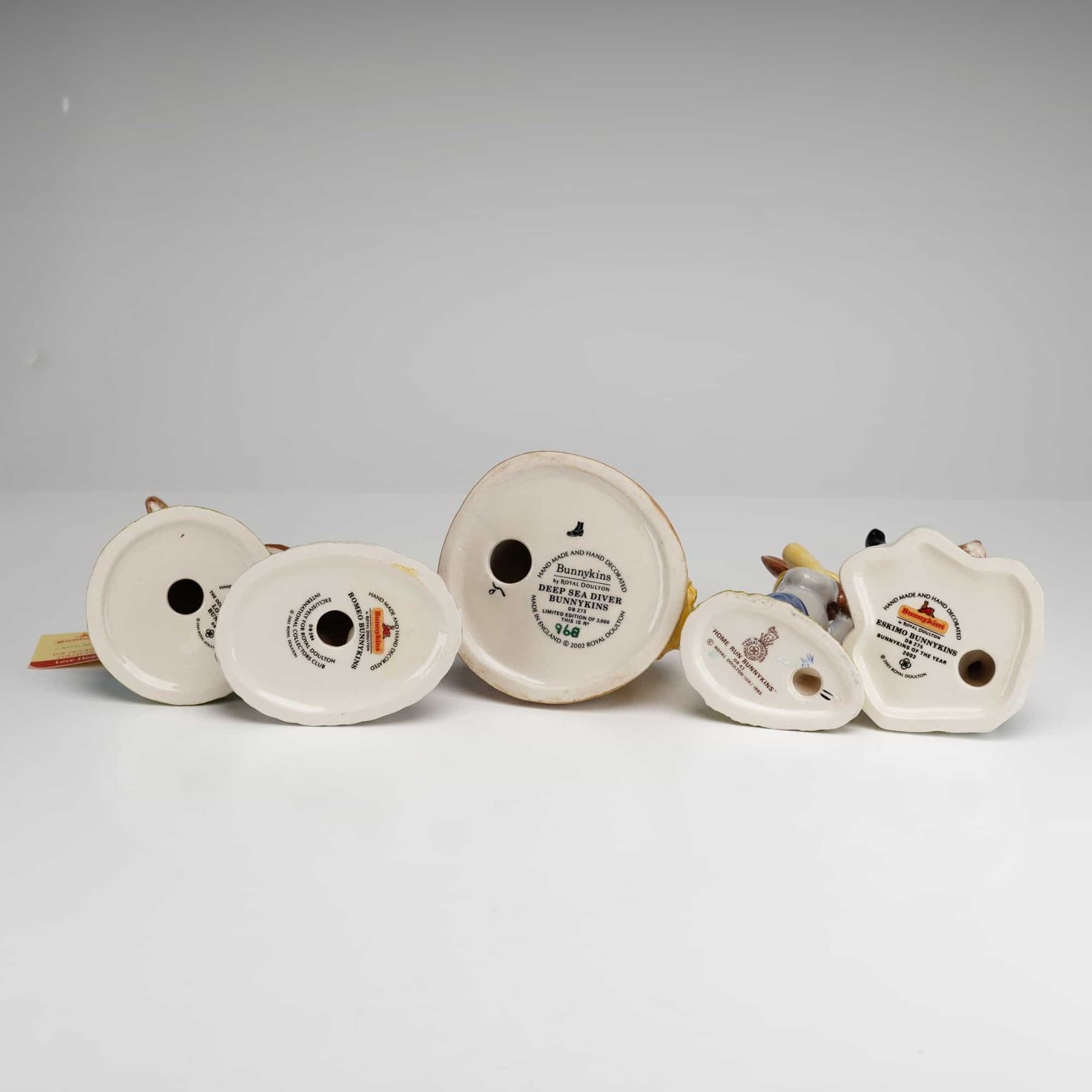 A collection of five Royal Doulton Bunnykins hand-painted ceramic figurines depicting anthropomorphic rabbit characters in various themed costumes. The group includes Home Run DB43, Deep Sea Diver DB273 numbered 968 of a limited edition of 3,000, Eskimo Bunnykins DB275 issued as the 2003 Bunnykins of the Year, Romeo DB284 created for the International Collectors Club, and Love Heart DB288 from The Occasions Collection. Each figurine features a high-gloss glaze and official Royal Doulton backstamps on the base with model names and copyright dates ranging from 1985 to 2002. Several pieces retain their original string tags.