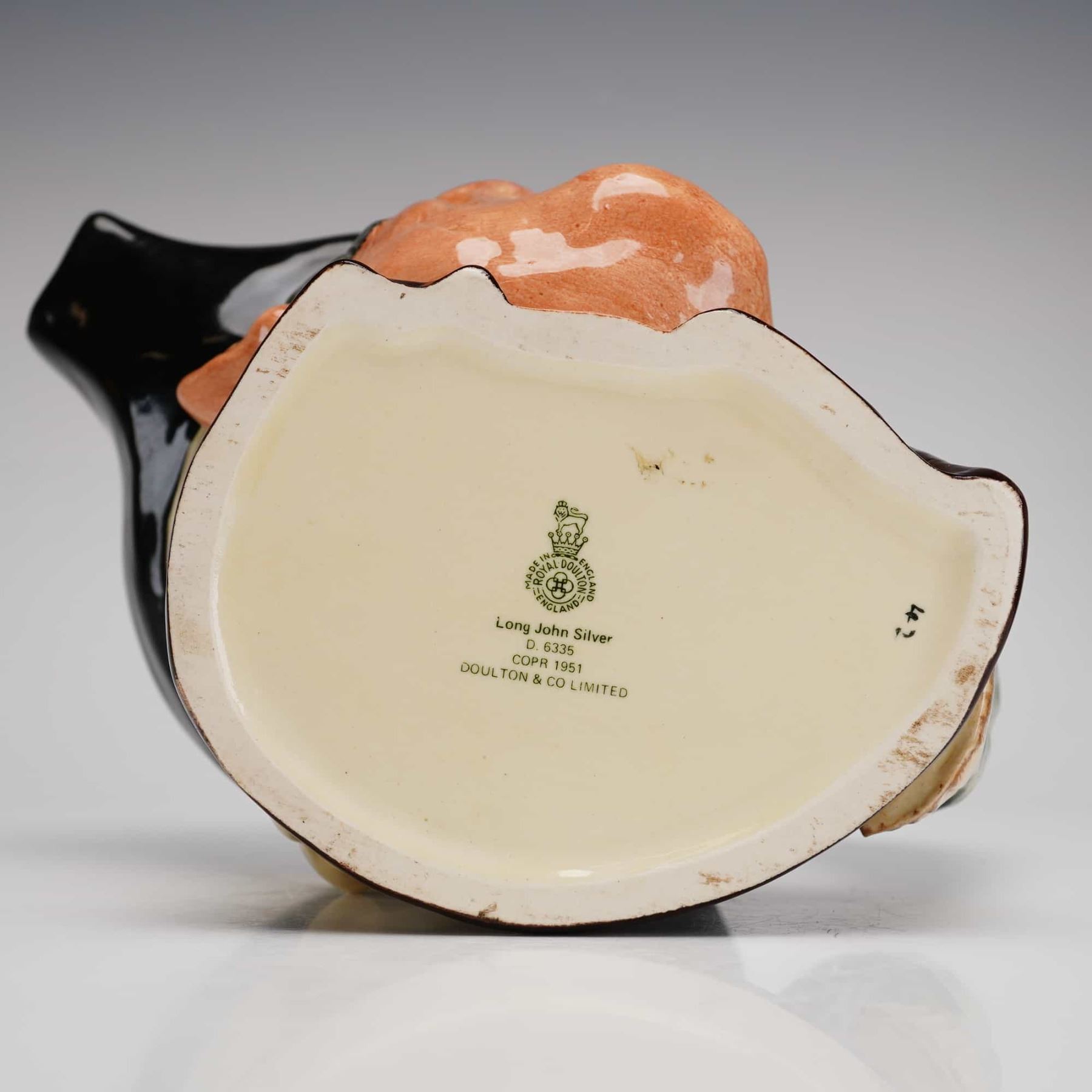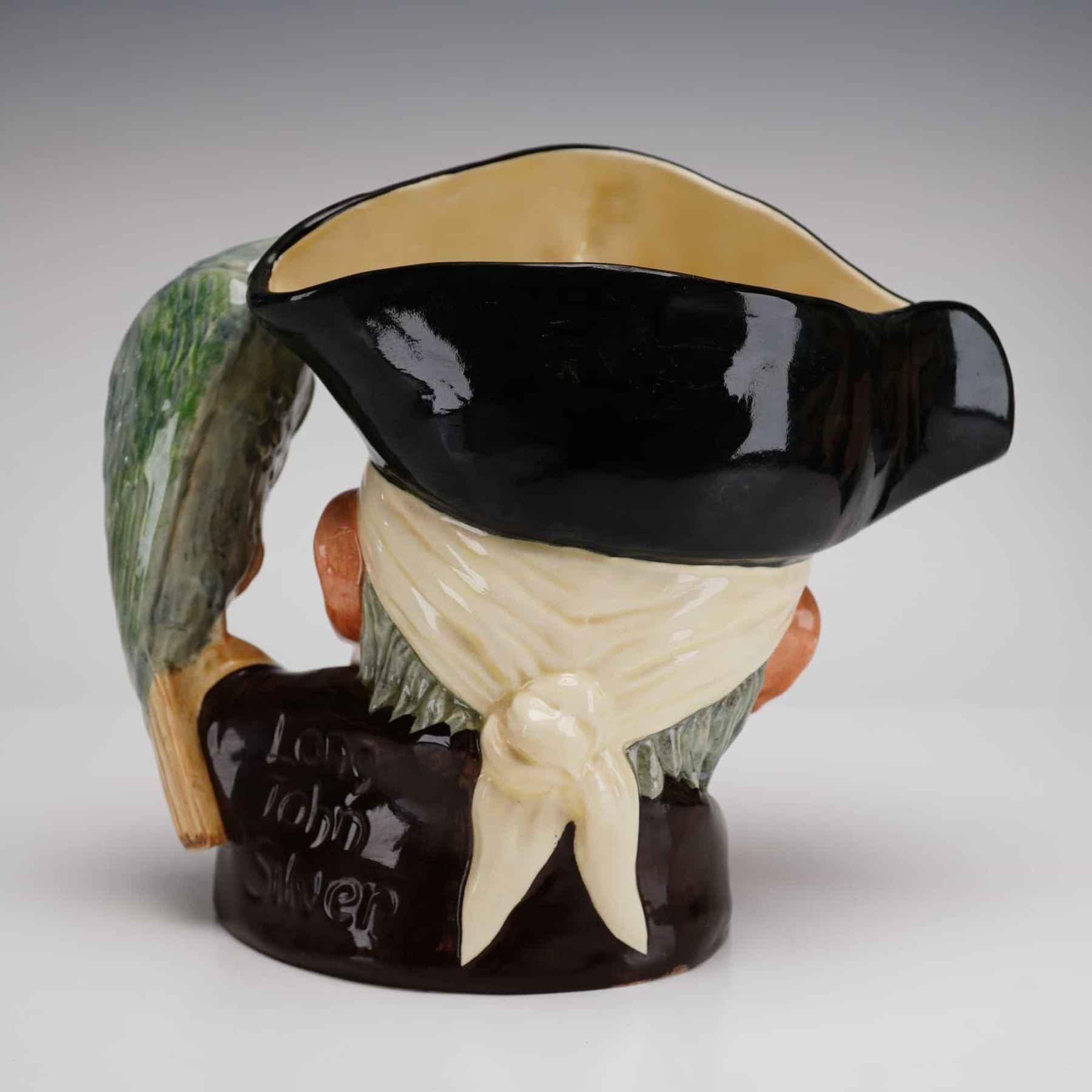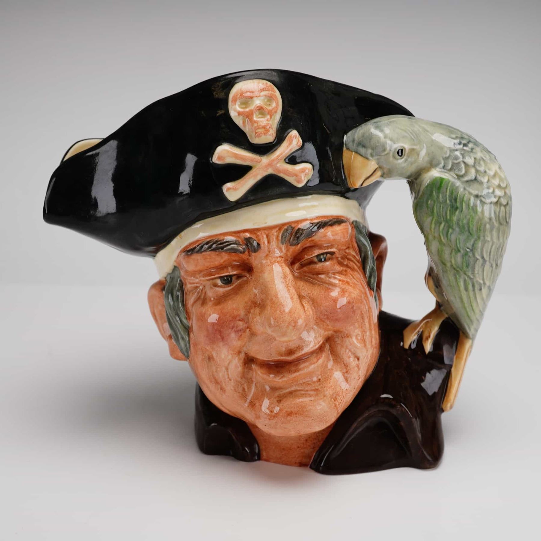 A large-sized Royal Doulton character jug titled Long John Silver, model D6335. This glazed earthenware piece was designed by Max Henk and produced from 1952 to 1998. The jug features a high-relief portrait of the famous pirate from Treasure Island, depicted with a weathered complexion and wearing a black bicorne hat with a skull and crossbones over a cream-colored bandana. The handle is intricately formed by his green and gray parrot, Captain Flint, perched upon his shoulder. The reverse of the jug features the name Long John Silver in raised relief. The piece is finished in a vibrant, hand-painted polychrome palette under a high-gloss glaze. The base features the standard Royal Doulton lion and crown backstamp in green, along with the inscriptions Long John Silver, D. 6335.