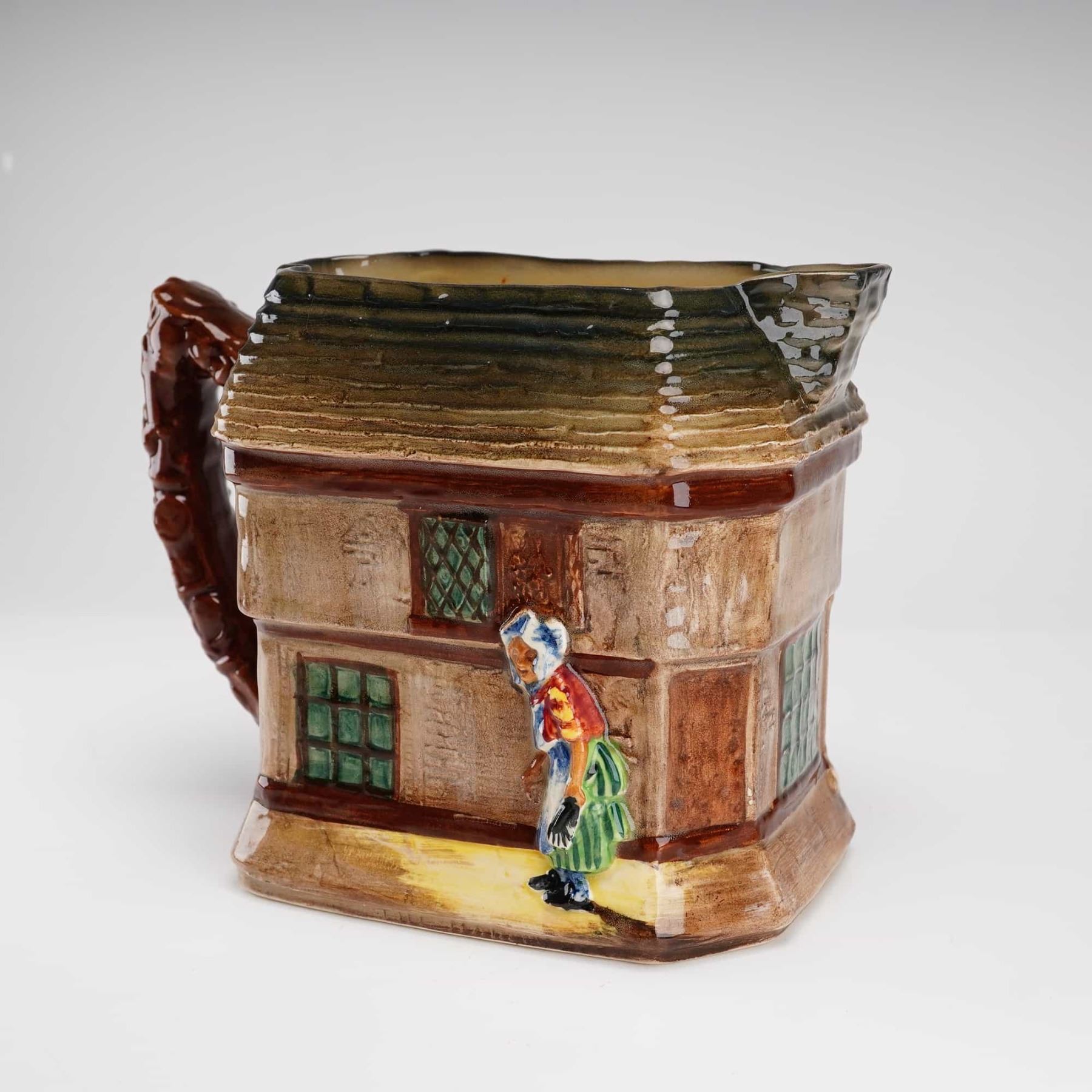 This vintage Royal Doulton Charles Dickens Series ware ceramic jug, reference D5584, is modeled in the form of a two-story thatched-roof cottage representing The Old Curiosity Shop. The glazed earthenware body features relief-molded scenes with hand-painted underglaze colors in shades of brown, green, red, and blue. The front depicts Little Nell and her grandfather, while the reverse shows a secondary character from the novel. The spout is integrated into the roofline, and the handle is modeled to resemble a gnarled tree branch. The base bears the green Royal Doulton backstamp.