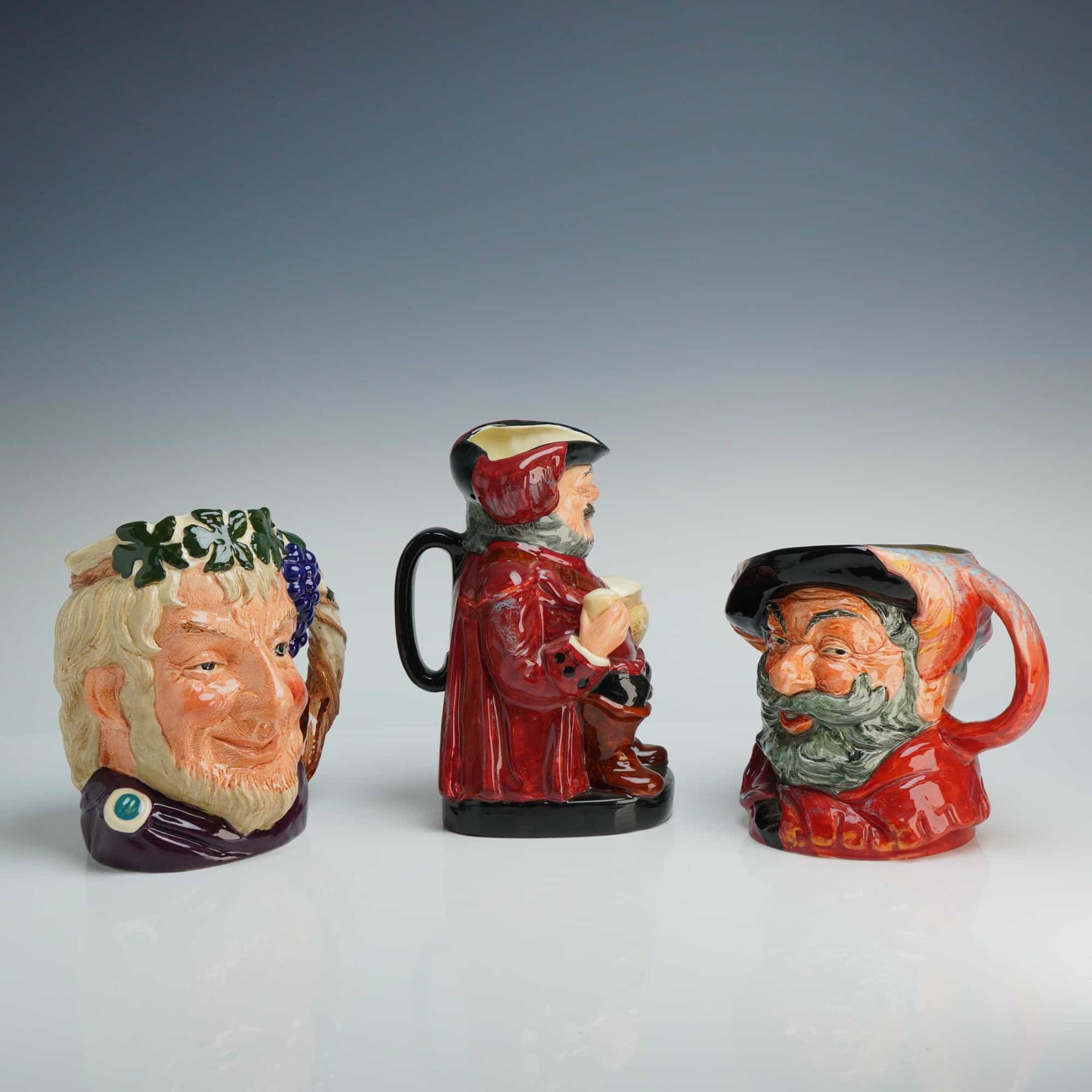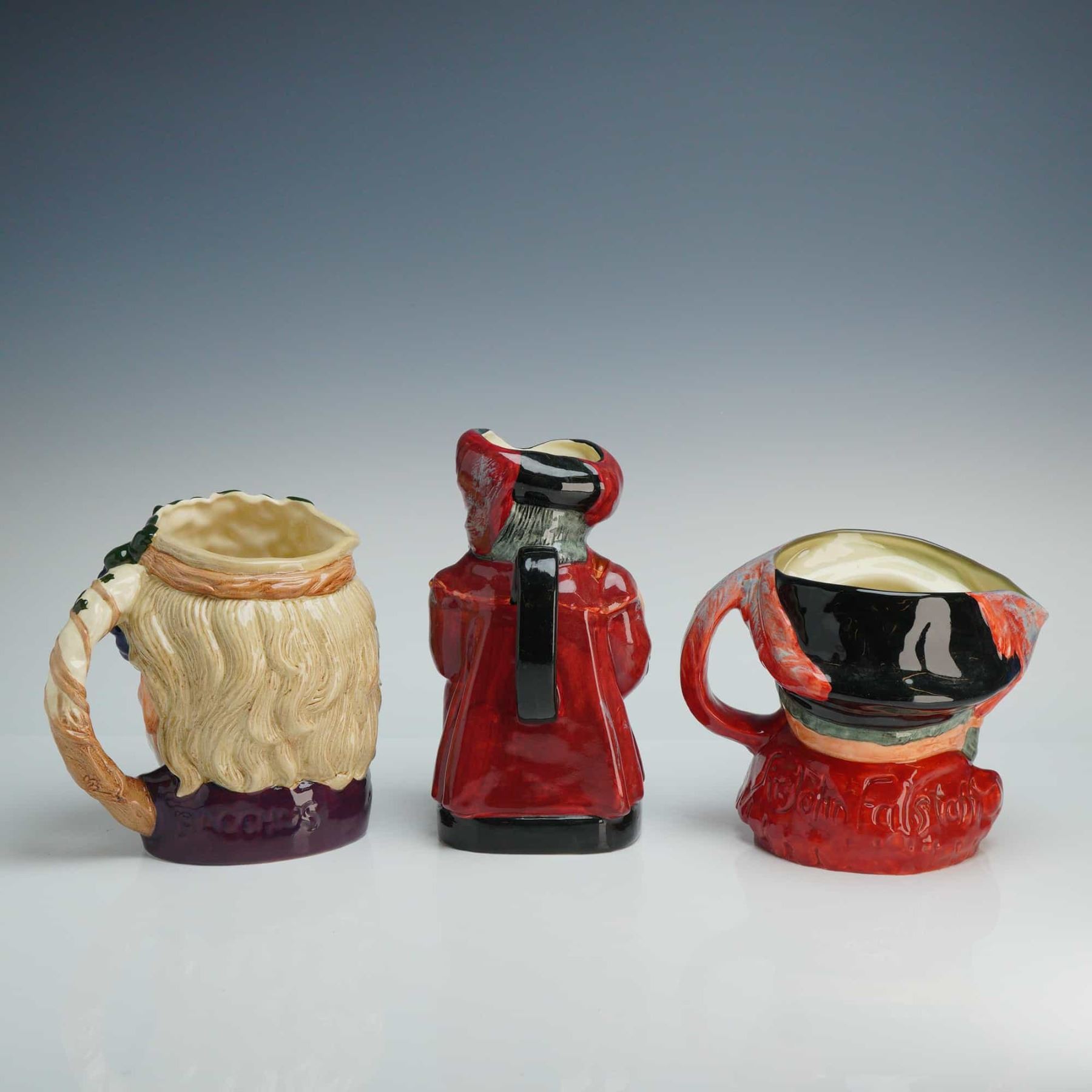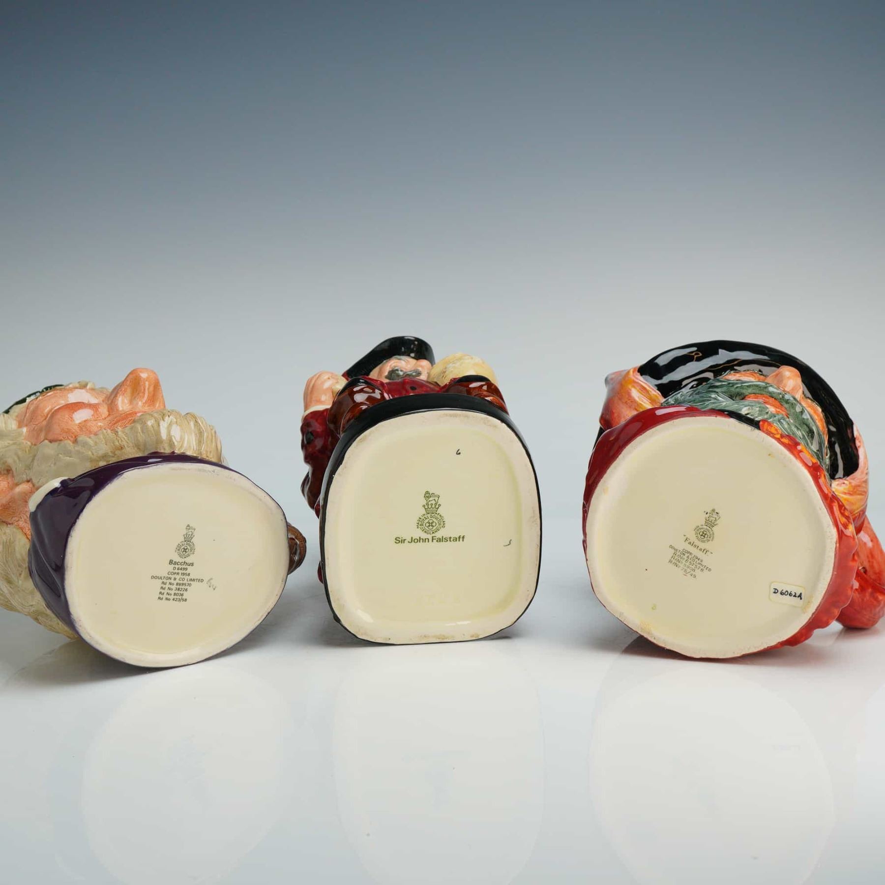 This 3pc Royal Doulton character Jugs collection includes a Bacchus character jug, a full-figure Sir John Falstaff Toby jug, and a Falstaff character jug. The Bacchus jug, model D 6499 with a 1958 copyright, features a crown of vine leaves and grapes with a wood-effect handle. The full-figure Sir John Falstaff Toby jug depicts the character seated in a red tunic holding mugs of ale. The Falstaff character jug, model D6287 with a 1949 copyright, is shown wearing a feathered hat and red garment. Each piece is finished in a high-gloss multi-colored palette. The undersides bear the Royal Doulton lion and crown backstamps, model names, and production details.