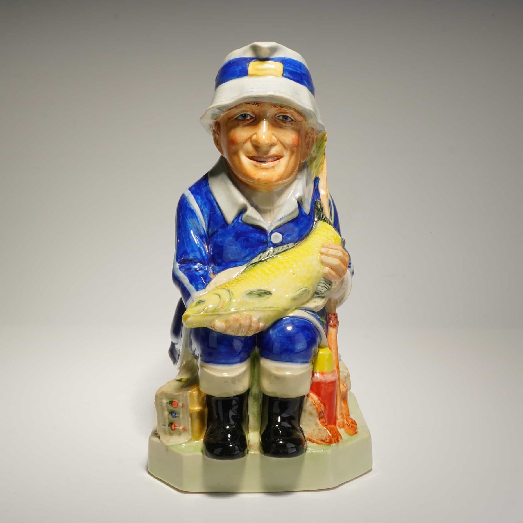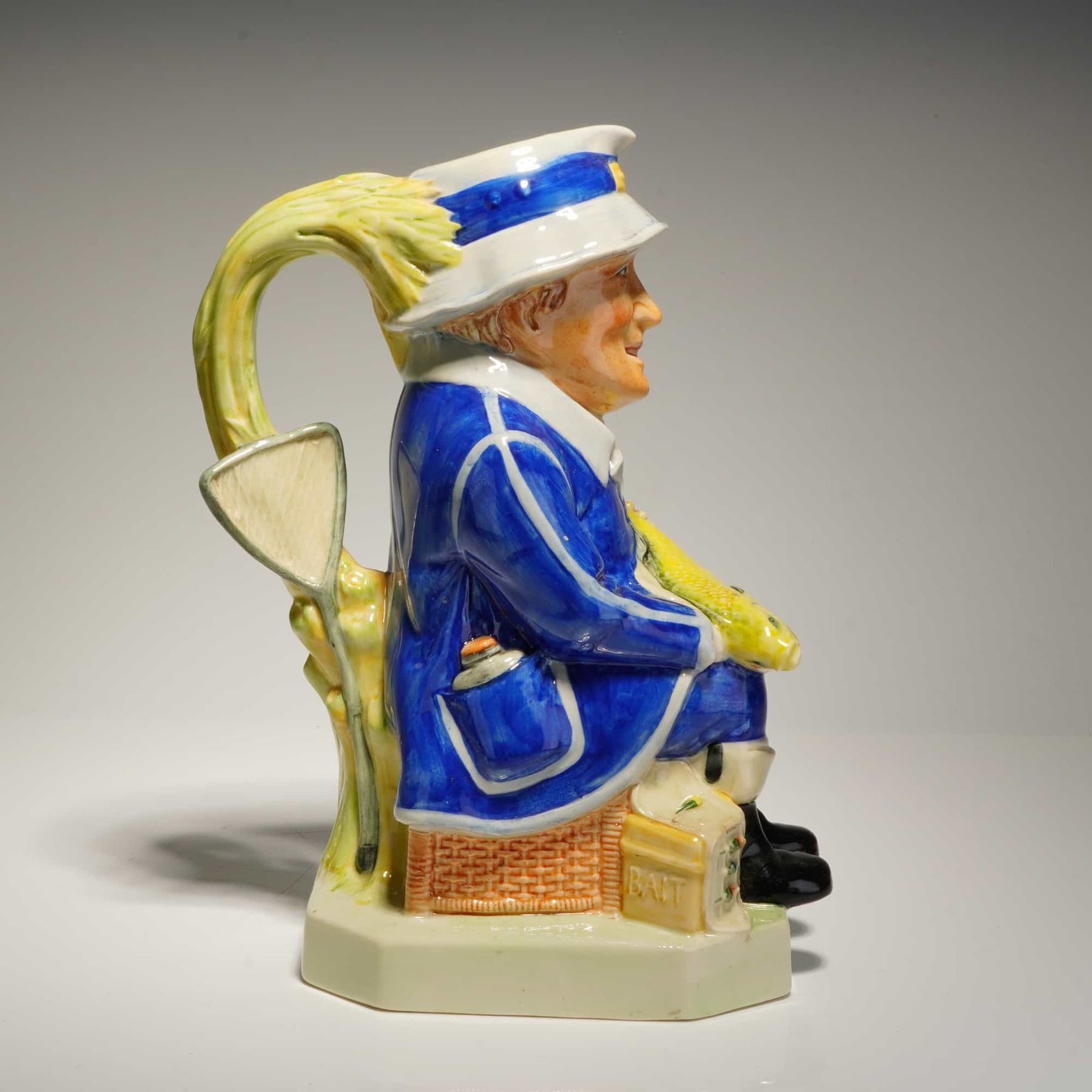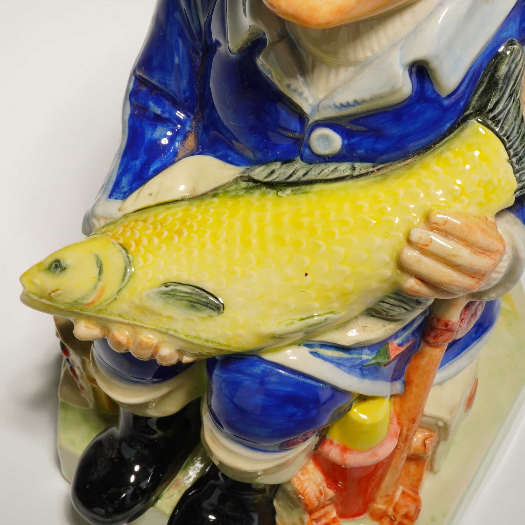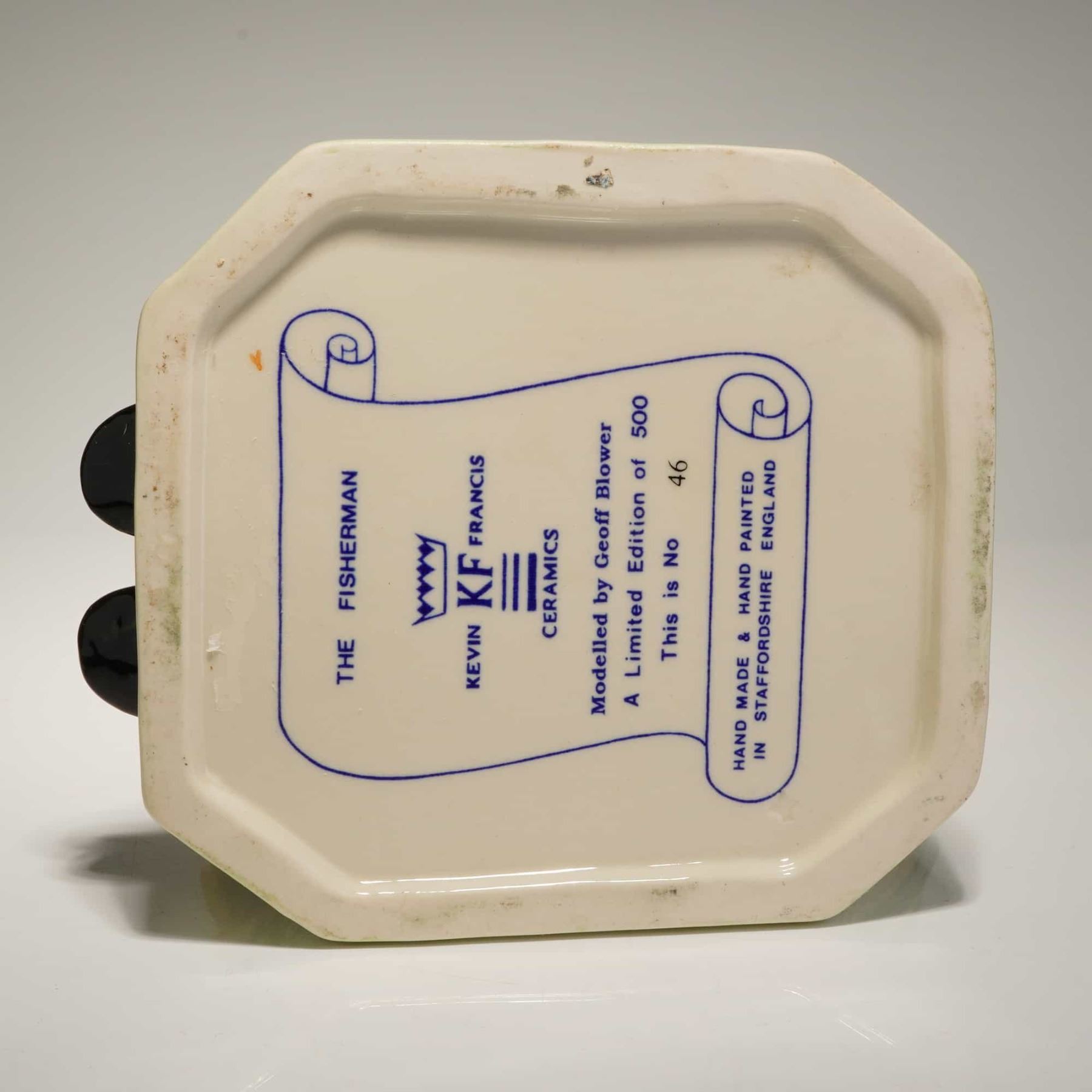 This polychrome glazed ceramic character jug, titled The Fisherman, was produced by Kevin Francis Ceramics. The piece was modeled by Geoff Blower and is handmade and hand-painted in Staffordshire, England. The jug depicts a seated figure in a blue jacket and a white-and-blue hat holding a large yellow fish across his lap. The figure is seated upon a woven basket next to a box marked BAIT and a red thermos. The handle is composed of a green and yellow botanical element and a fishing net. The underside of the base features a blue transfer-print mark identifying the maker, the modeler, and the limited-edition status. This specific piece is numbered 46 from a limited edition of 500. COA included - not shown in photos.