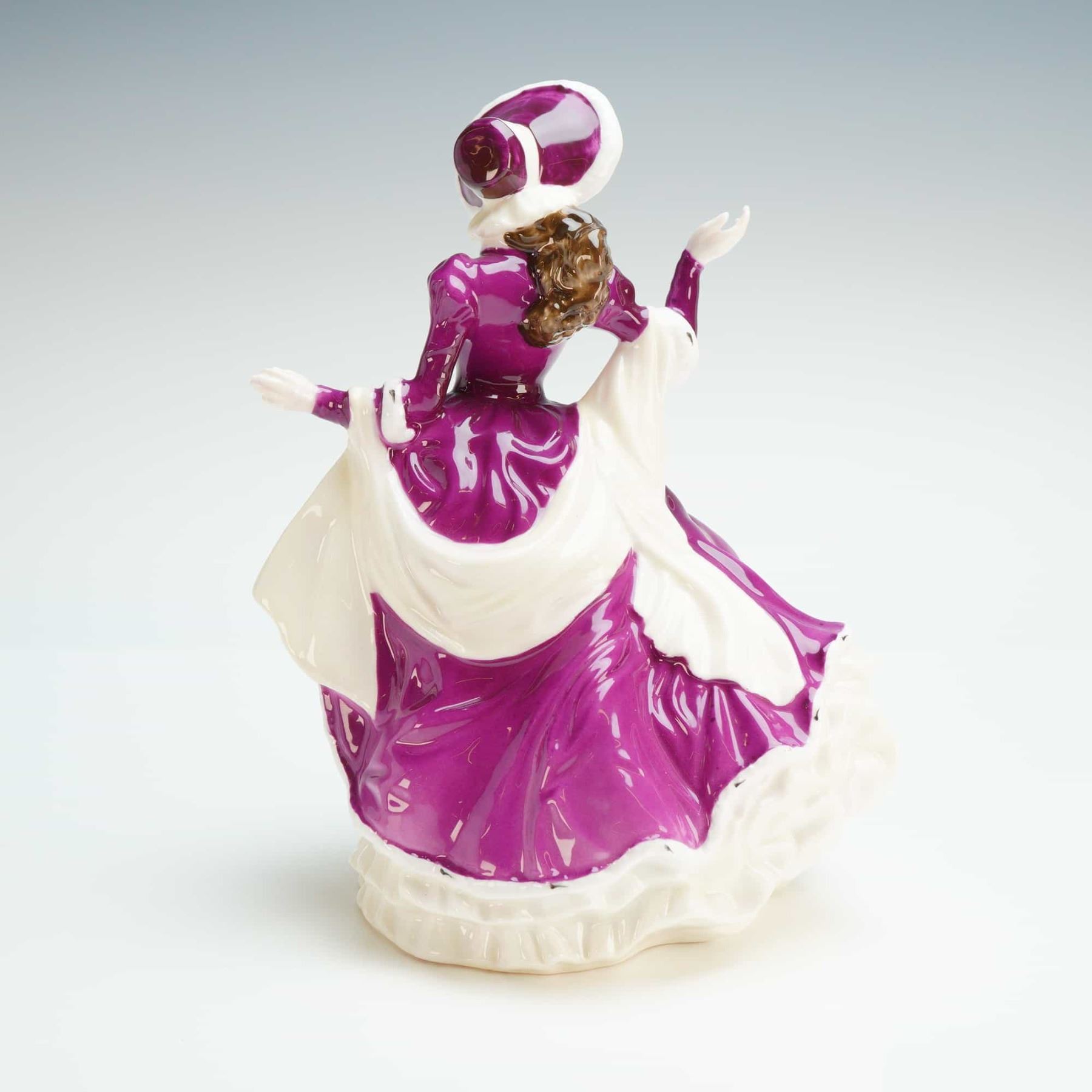 A Royal Doulton designed by Valerie Annand. This piece is part of the Royal Doulton Classics collection and is hand-made and hand-decorated in England. The figure is depicted in Victorian-style attire, featuring a deep purple coat with white trim and a matching wide-brimmed hat, paired with a voluminous, multi-tiered ruffled white skirt. The entire piece is finished in a high-gloss glaze. The underside bears the official Royal Doulton Classics backstamp, including the title, HN number, designer attribution, and a 2003 copyright date.