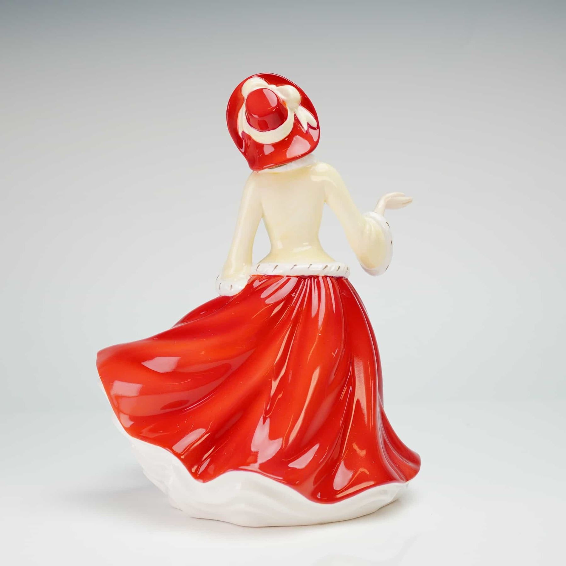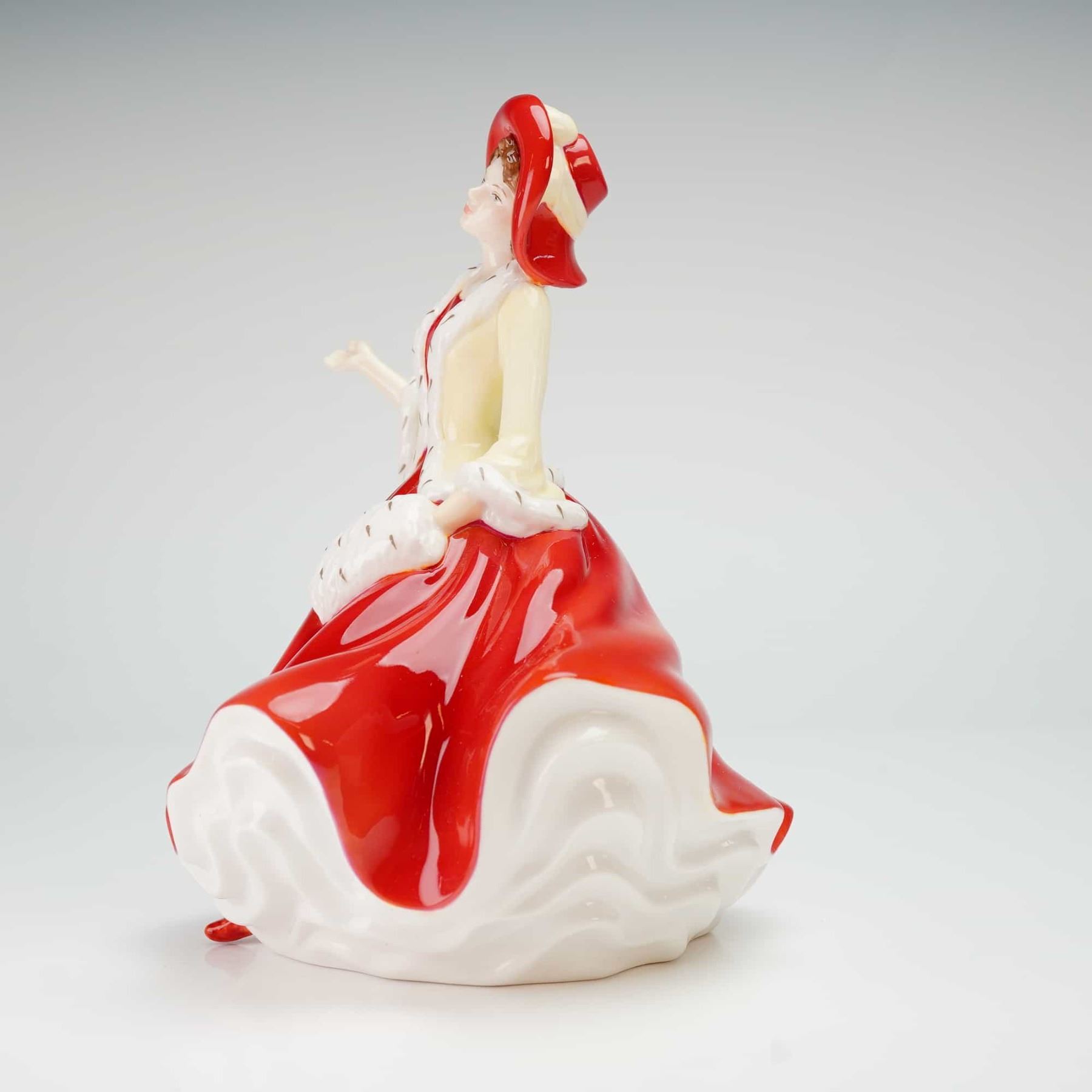 This hand-decorated piece was modeled by Nada Pedley and depicts a woman in a winter ensemble featuring a red gown with a scalloped white border, a cream color jacket with white faux-fur trim, a matching spotted muff, and a large red hat. The figure is finished with a high-gloss glaze. The base features the Royal Doulton lion crown backstamp, identifying it as part of the Pretty Ladies series, designed in England and manufactured in Thailand. The item is accompanied by its original cream color presentation box and official documentation.