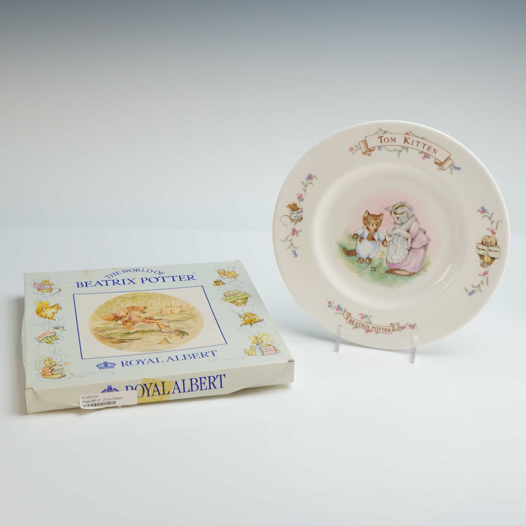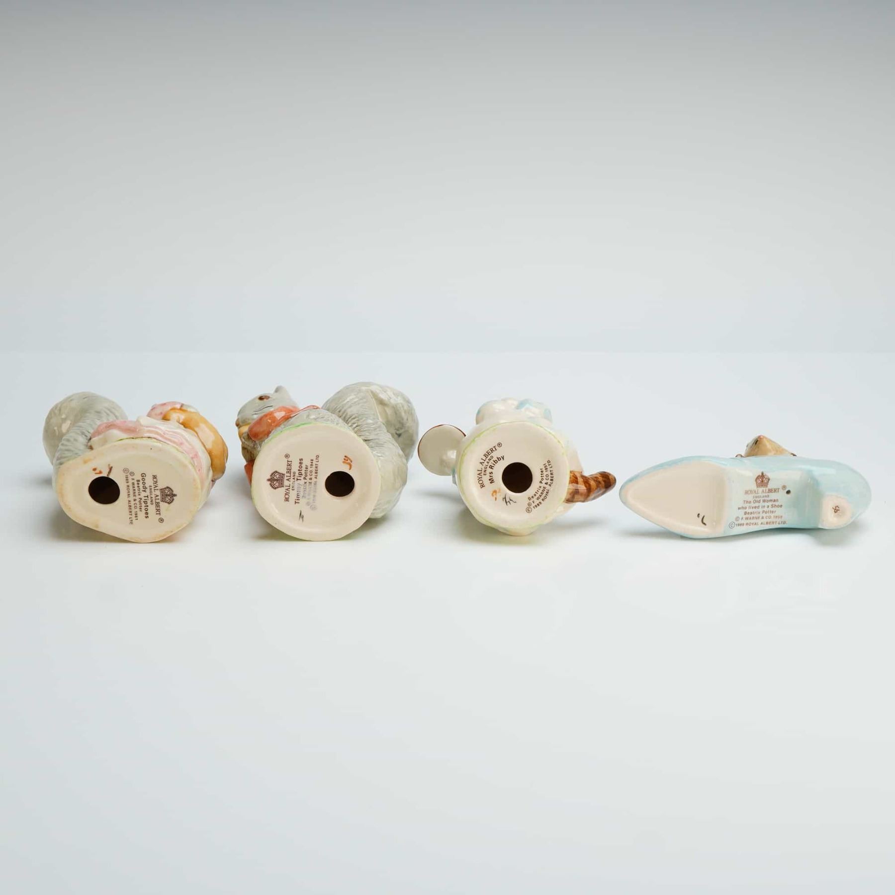 A 5-piece collection of Royal Albert bone china from The World of Beatrix Potter series, comprising one decorative plate and four hand-painted character figurines. The plate, titled Tom Kitten, features a central color illustration of the character and is accompanied by its original printed presentation box. The group of figurines includes the characters Timmy Tiptoes, Goody Tiptoes, Mrs. Ribby, and The Old Woman who lived in a Shoe. Each piece is marked on the base with the Royal Albert England backstamp and copyright information for F. Warne and Co.