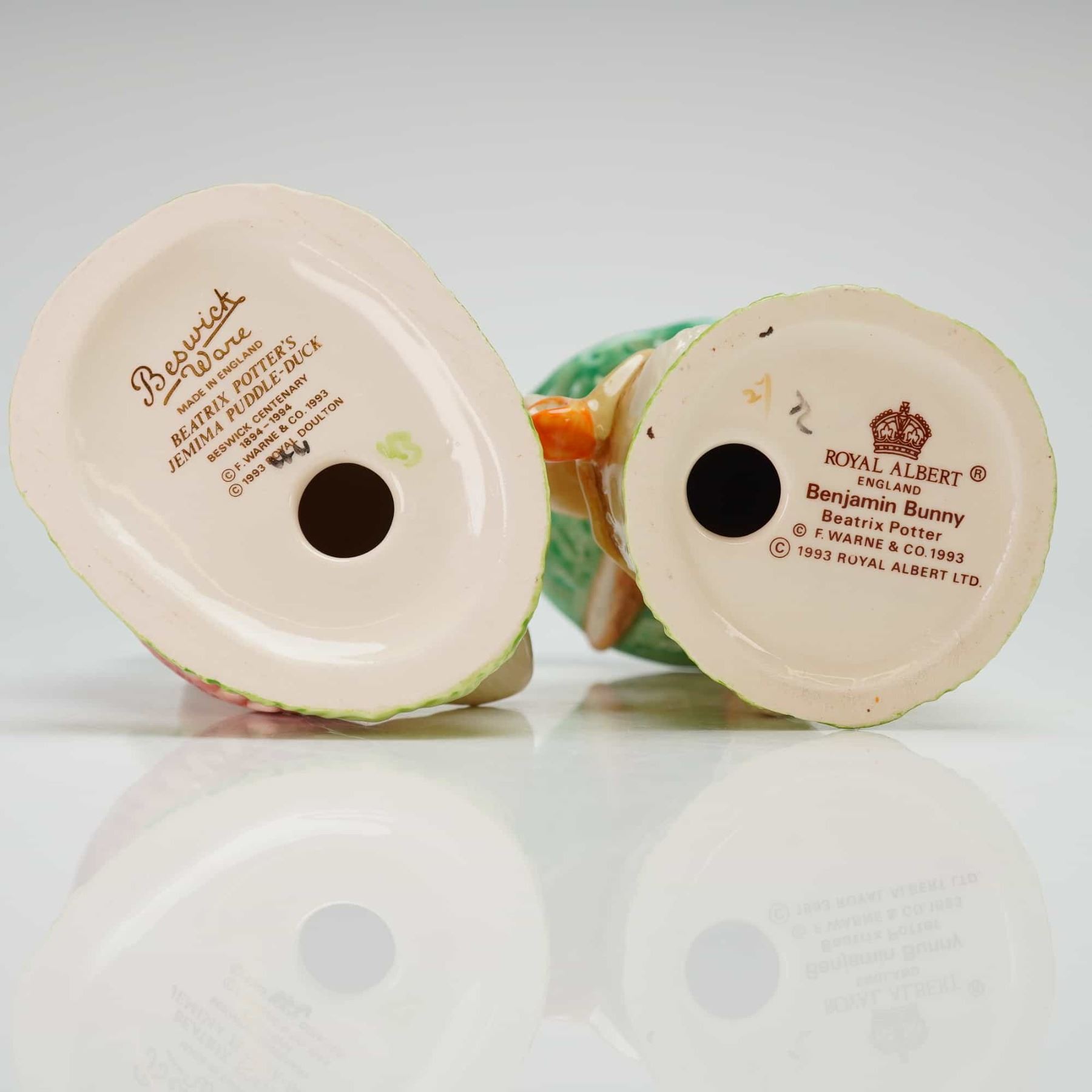 A 2pc collection of glazed ceramic figurines based on the characters of Beatrix Potter, featuring Royal Doulton Jemima Puddle Duck and Royal Albert Benjamin Benny. The Jemima Puddle Duck figure is marked with a Beswick Ware backstamp and identified as a Beswick Centenary 1894-1994 commemorative piece, carrying 1993 copyright marks for F. Warne and Co. and Royal Doulton. The figure is modeled wearing a blue bonnet and a pink patterned shawl. The Benjamin Benny figure bears a Royal Albert backstamp with 1993 copyright marks for F. Warne and Co. and Royal Albert Ltd. This character is depicted in a large green tam-o-shanter and a tan jacket while holding a pair of slippers. Both figurines are finished with a high-gloss glaze and exhibit vibrant colors.