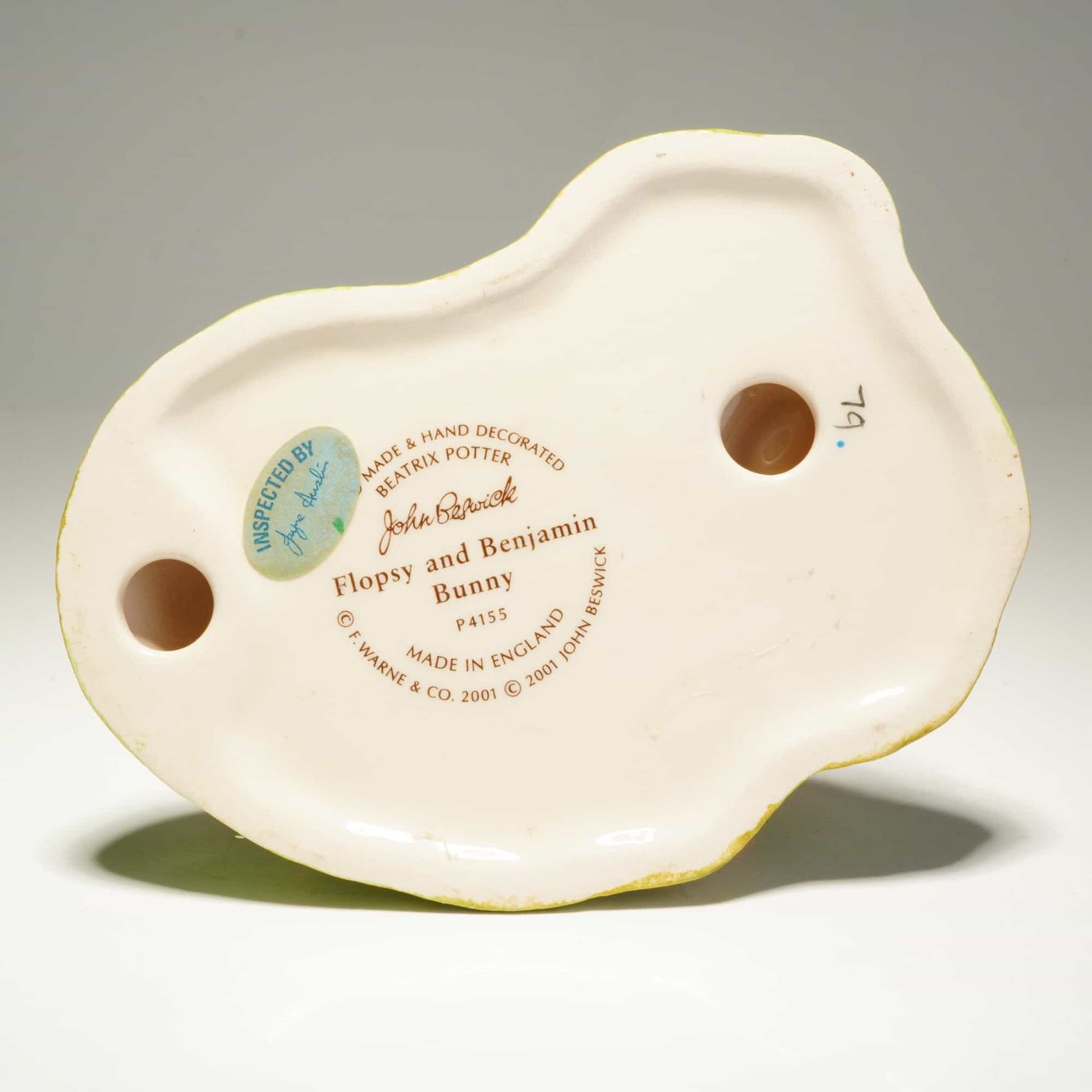 This John Beswick glazed ceramic figurine, titled Flopsy and Benjamin Bunny, is part of the Beatrix Potter collection. The piece depicts two anthropomorphic rabbits positioned on a green, grassy-style base. One figure is dressed in a blue frock and carries a red bag, while the other is dressed in a coral-colored jacket and holds a yellow wicker basket. The underside features a printed backstamp identifying the item as model number P4155, Made in England, with a copyright date of 2001 for both F. Warne and Co. and John Beswick. The base also retains an original Inspected By quality control sticker signed by Jayne Austin and a handwritten numerical mark.