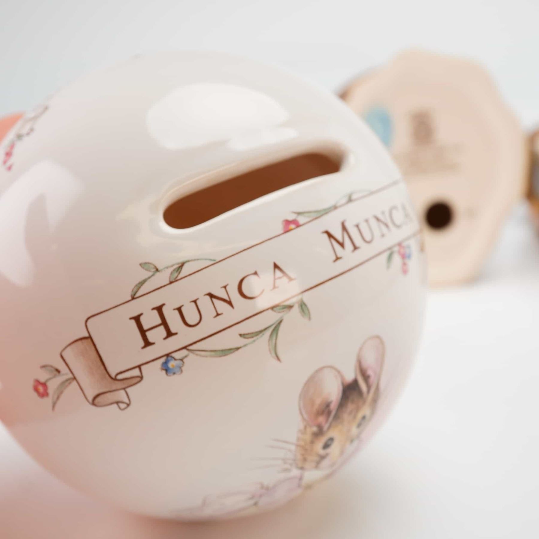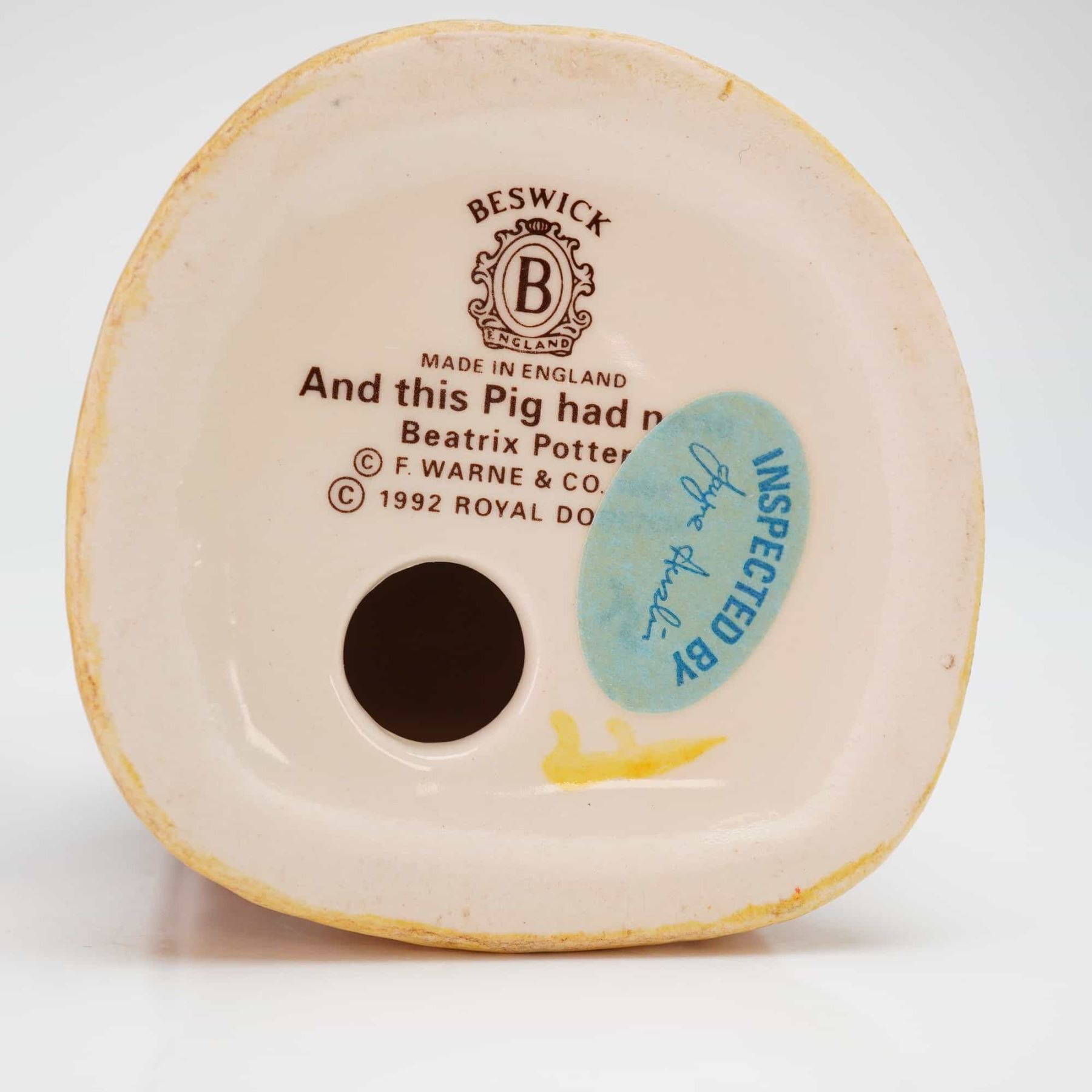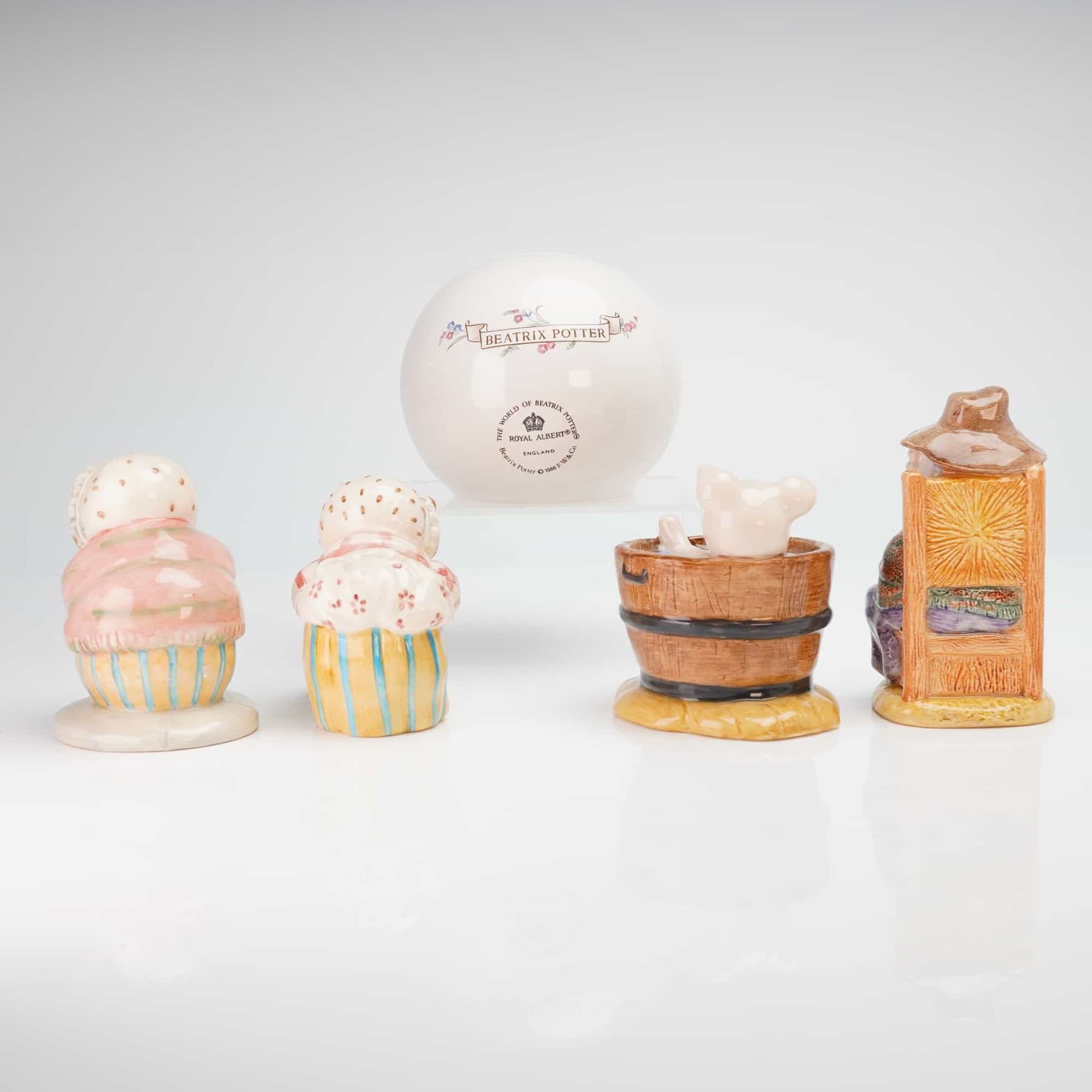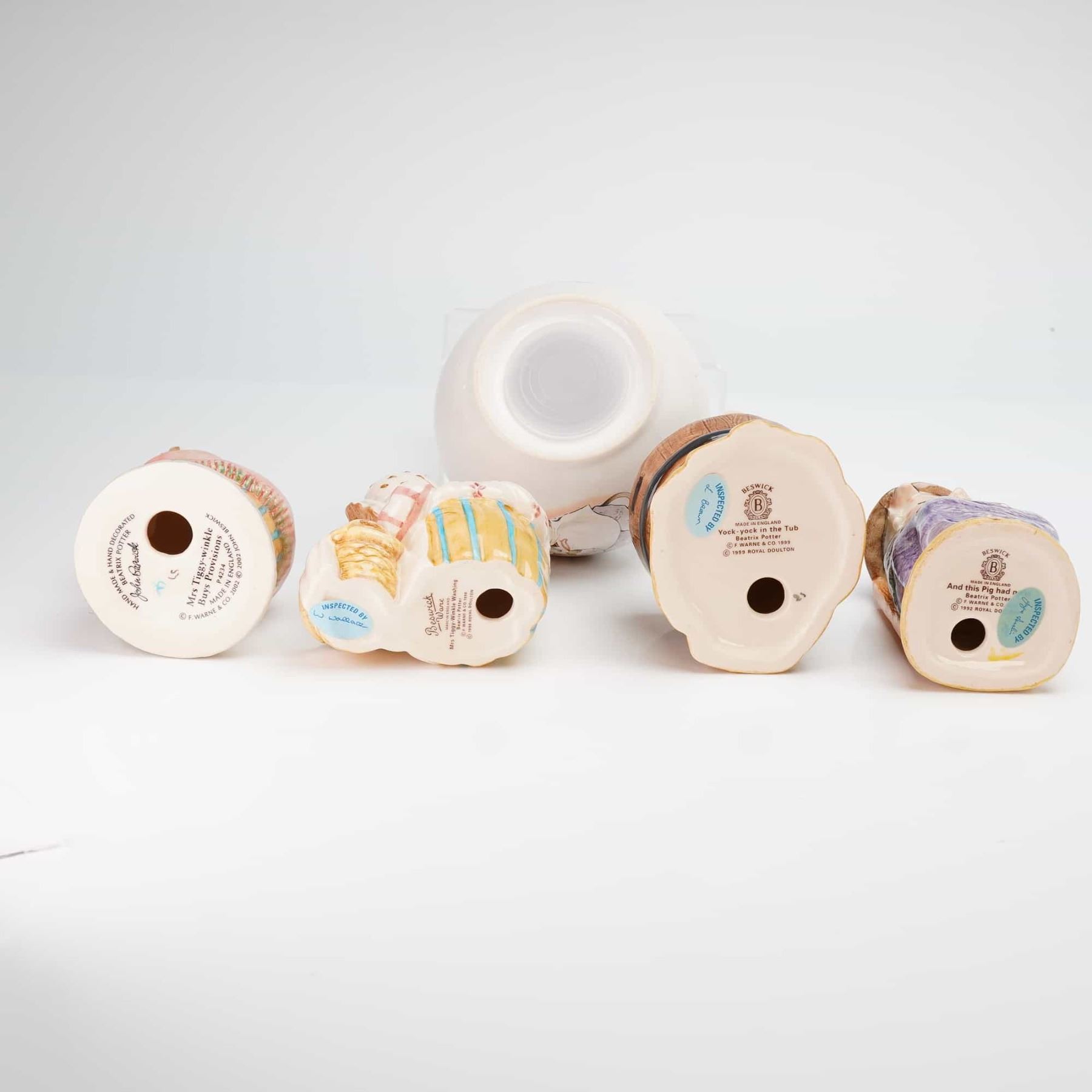 This 5pc Beatrix Potter set consists of four figurines produced by the Beswick pottery works under the ownership of Royal Doulton and one bank by Royal Doulton. The glazed ceramic items are hand-painted and represent various anthropomorphic characters including Mrs. Tiggy-Winkle, Hunca Munca, and pigs from the classic tales. Specific figurine titles include Mrs. Tiggy-Winkle Buys Provisions, Mrs. Tiggy-Winkle Washing, Yock-yock in the Tub, and And this Pig had none. The spherical bank is decorated with Hunca Munca and bears the Royal Albert mark. All pieces feature official markings on the base, including manufacturer logos, character titles, copyright dates from 1988 to 2002, and Made in England stamps.