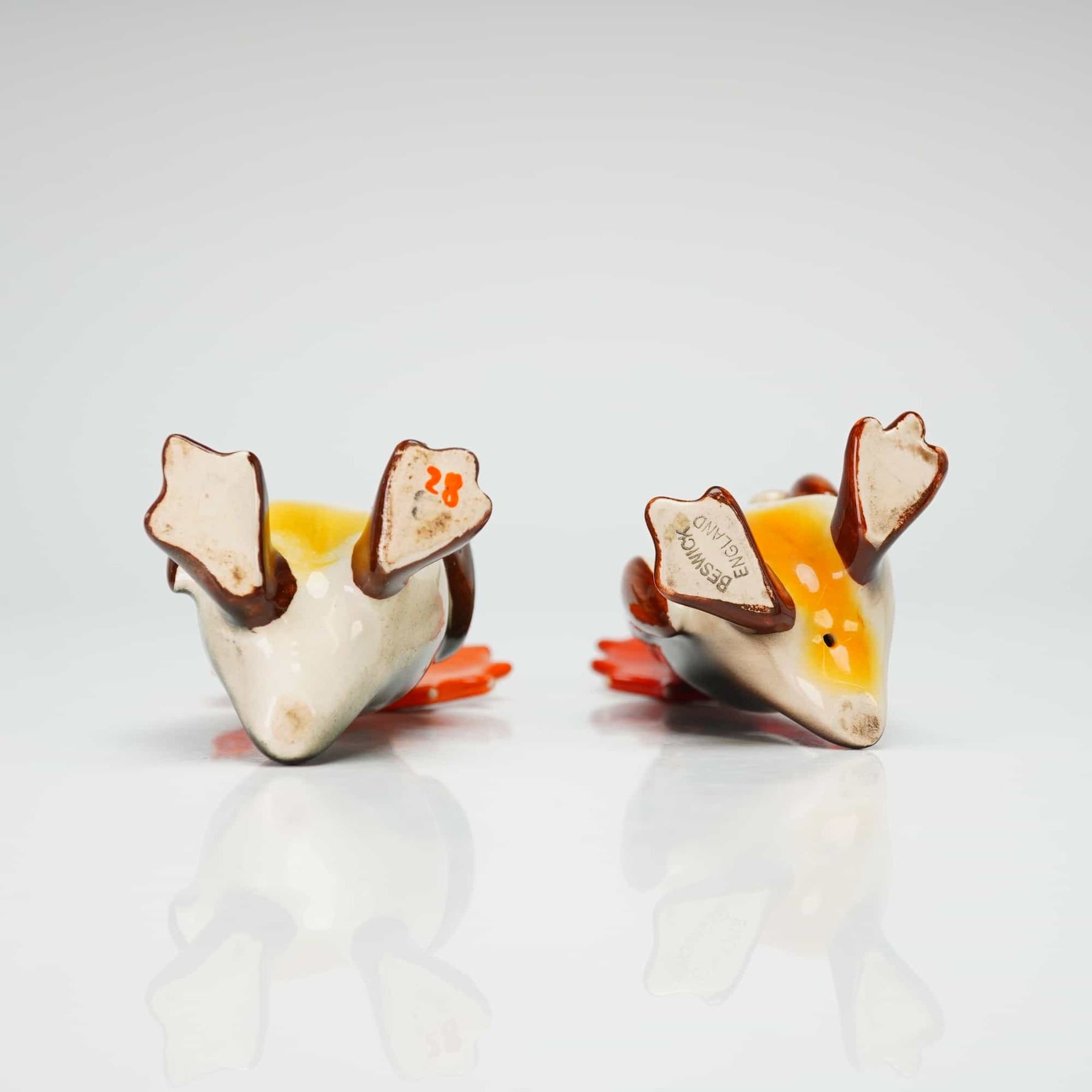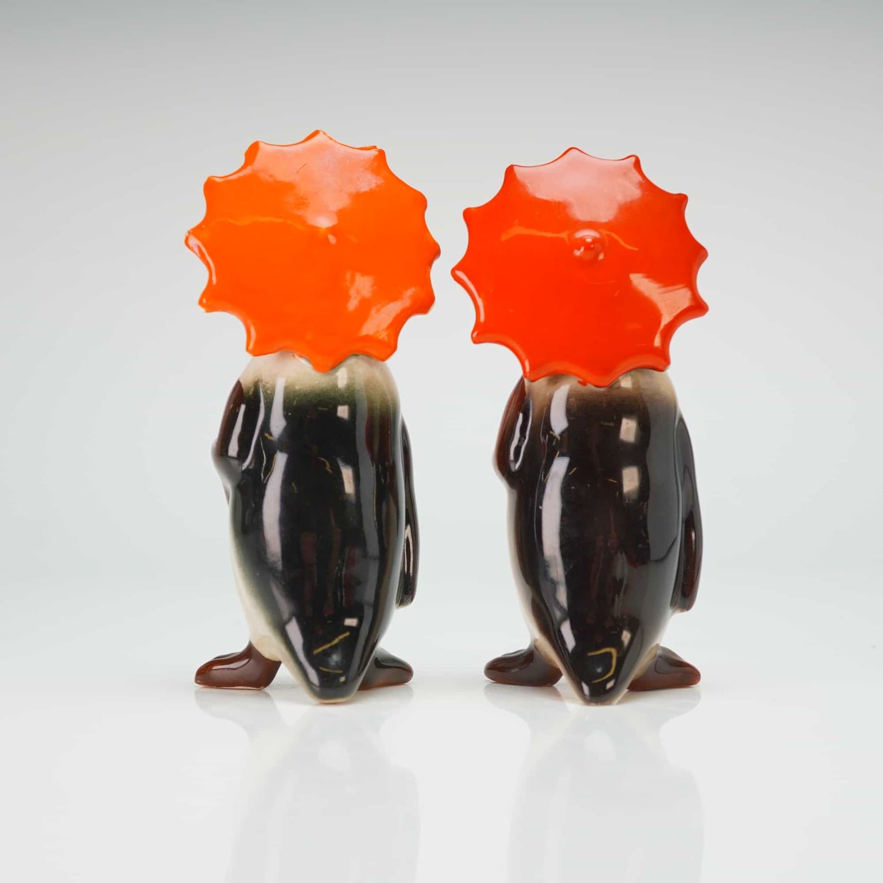 Each anthropomorphic figure is depicted standing upright and holding a bright orange umbrella with a hook handle. The figurines are finished in a glossy glaze with characteristic black and white plumage, accented by yellow and orange highlights on the chest and beak. The underside of one figure is impressed with the BESWICK ENGLAND maker mark.