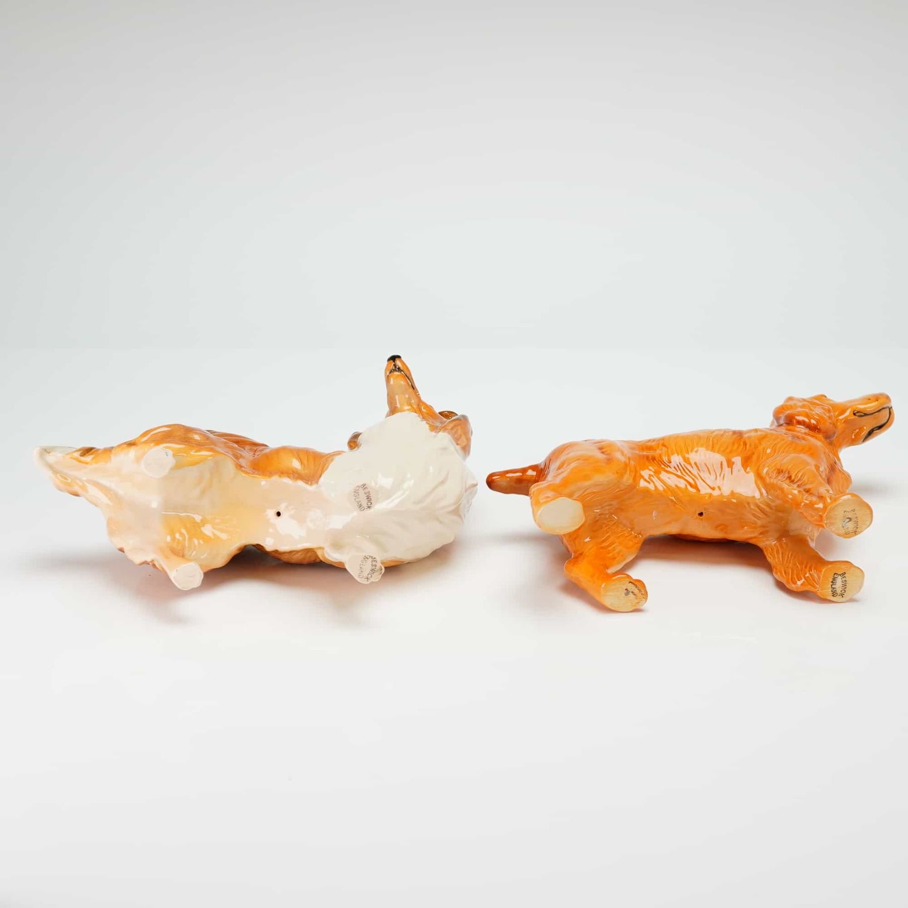 Both figurines are rendered in a realistic style with a high-gloss finish. The Collie features characteristic ginger and white markings with dark highlights on the ears and face, while the Spaniel is finished in a uniform golden-brown glaze. Both pieces exhibit fine molded detail and naturalistic proportions. The circular BESWICK ENGLAND maker mark is stamped on the underside of the paws of both items.