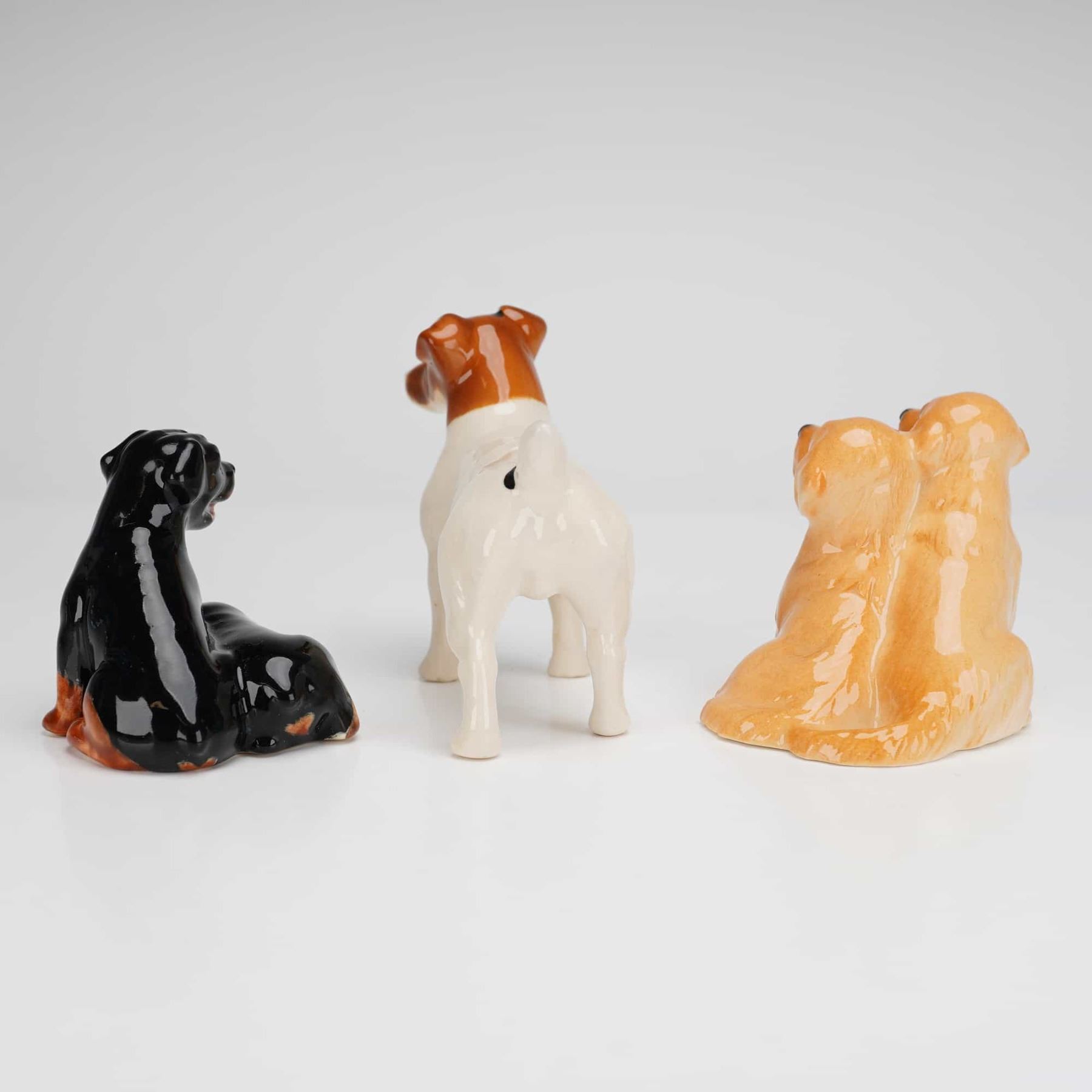 A trio of bone china dog figurines produced by Beswick, England. The collection features three distinct groupings finished in a high-gloss glaze. The first group depicts two black and tan Rottweilers, with one in a seated position and the other reclining. The second figure is a standing Jack Russell Terrier rendered in white with brown facial markings. The third group consists of two seated golden-colored puppies. Each piece bears the Beswick England maker mark stamped on the underside. The Rottweiler figurine includes a numeric 20 mark, and the golden puppy group retains a blue circular paper label reading Inspected By. Weight includes all items. Measurement is for largest item.