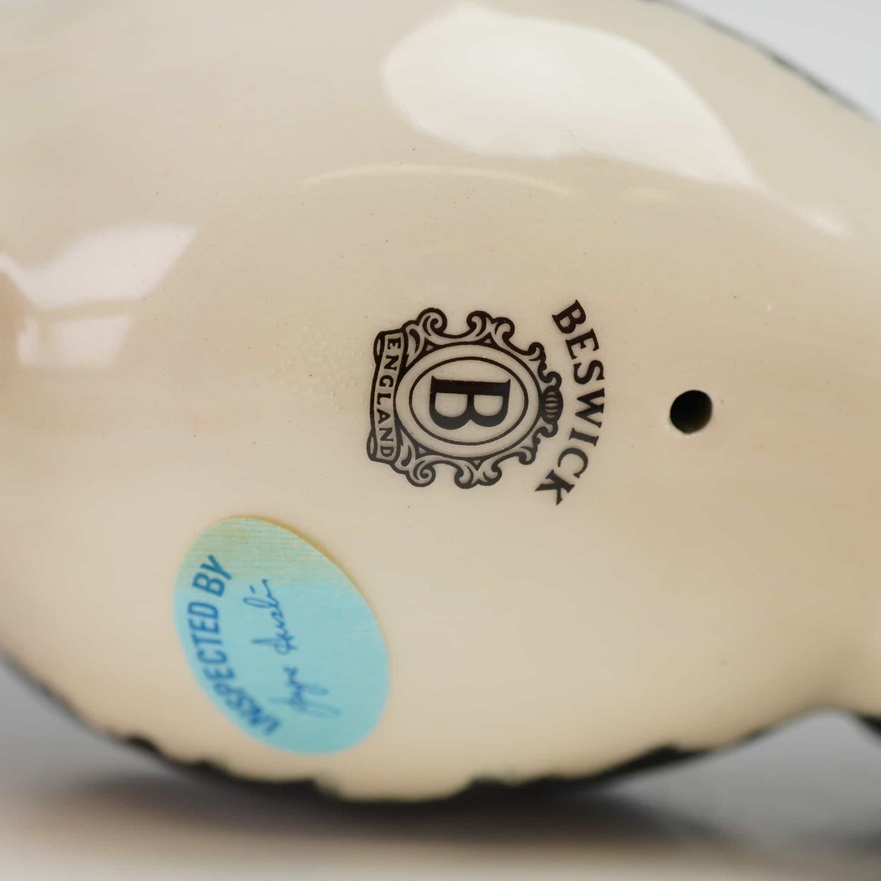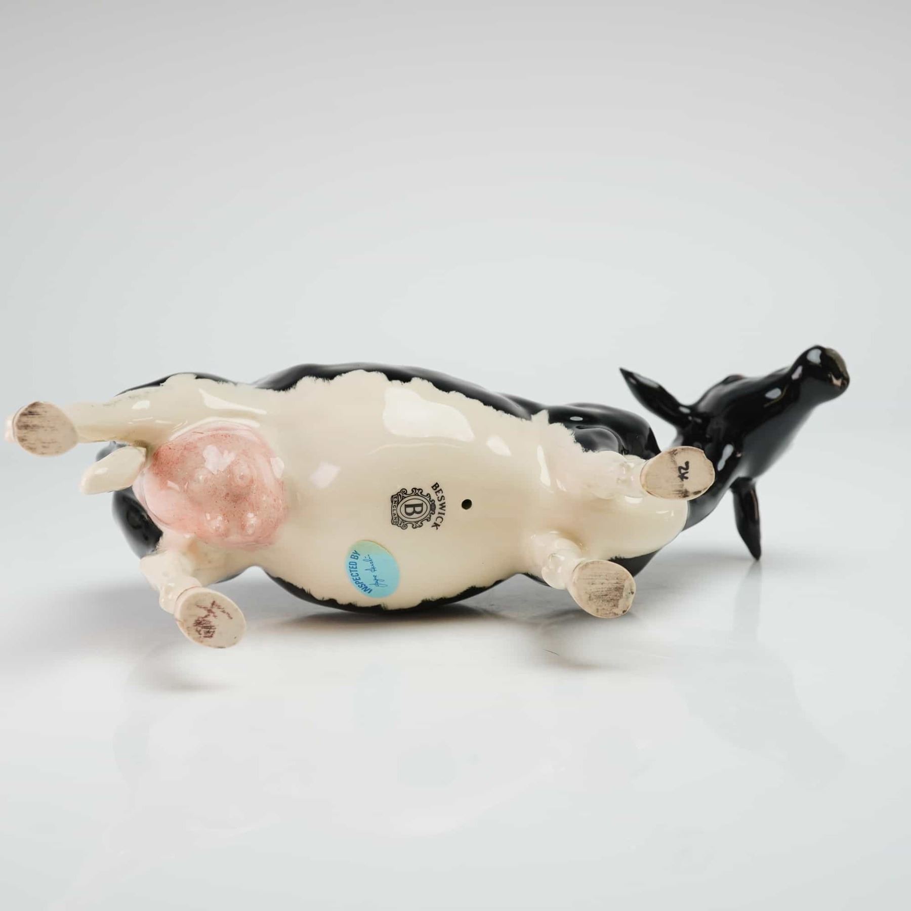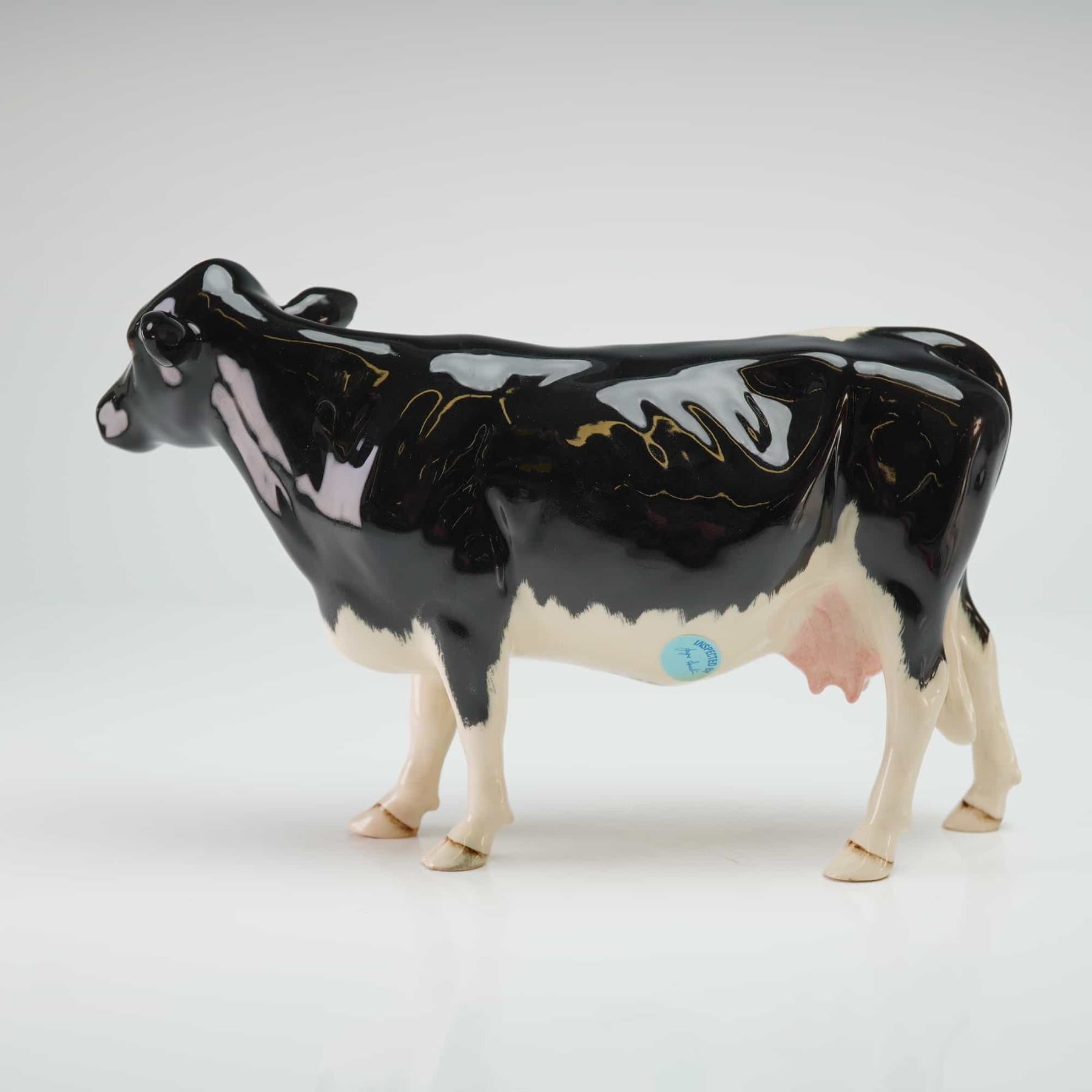 This Beswick figurine depicts a Friesian dairy cow, identified as the model Champion Claybury Leegwater. The ceramic piece is naturalistically modeled in a standing posture and finished with a high-gloss glaze. The decoration features characteristic black and white markings with a pink udder. The underside of the figurine bears the circular Beswick England maker mark with a central B logo and a circular blue quality control sticker that reads Inspected By.
