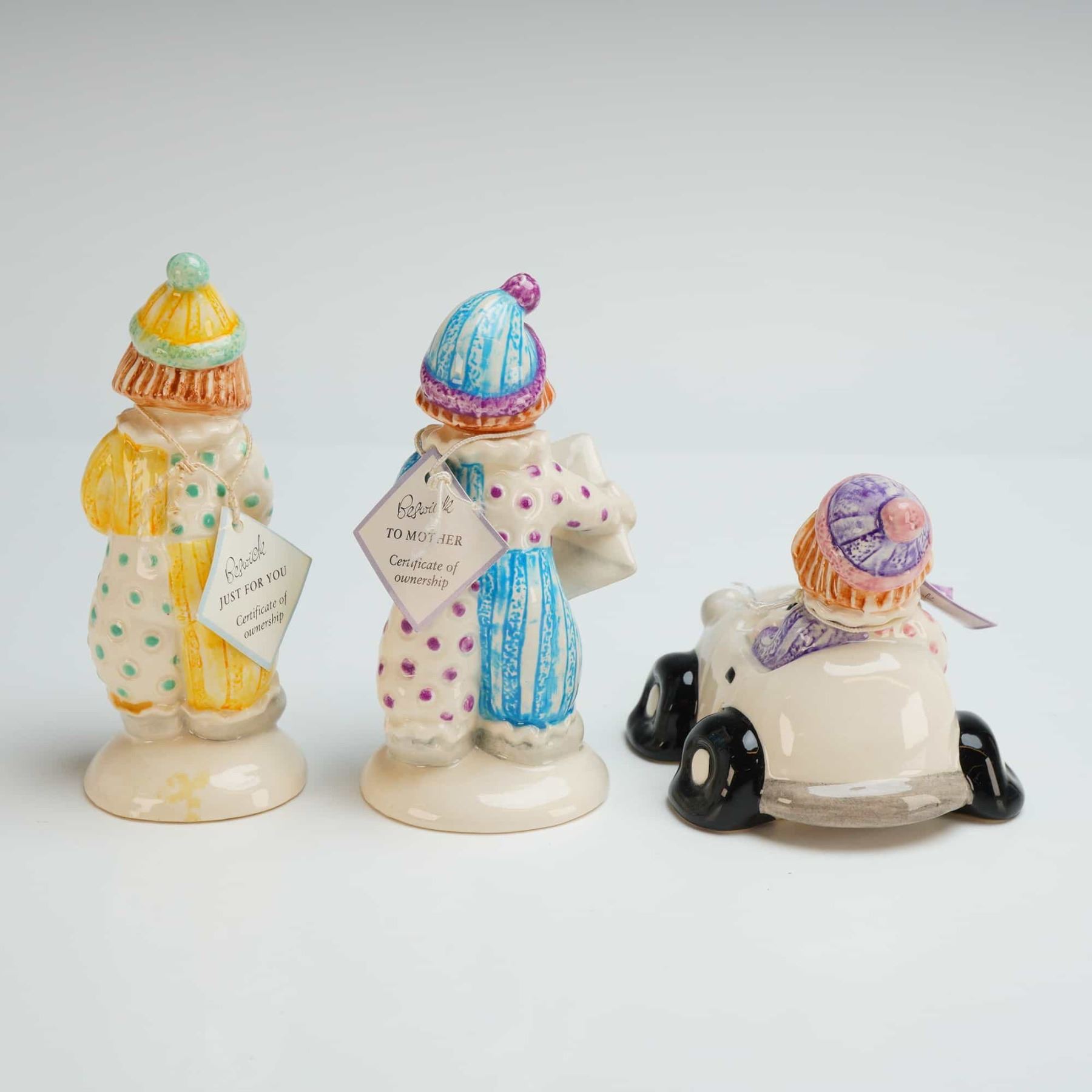 Consisting of the Just for You LL11 model, featuring a standing clown in yellow and white patterned attire holding a gift; the To Mother LL5 model, depicting a standing clown in blue and white patterned attire holding a To Mum sign; and the Passed LL7 model, showing a clown driving a white car with a license plate reading PA 55ED. Each figurine is made of glazed ceramic and bears the Beswick England crest and respective model number on the underside. Original Little Lovables paper certificates of ownership tags are attached to each piece.