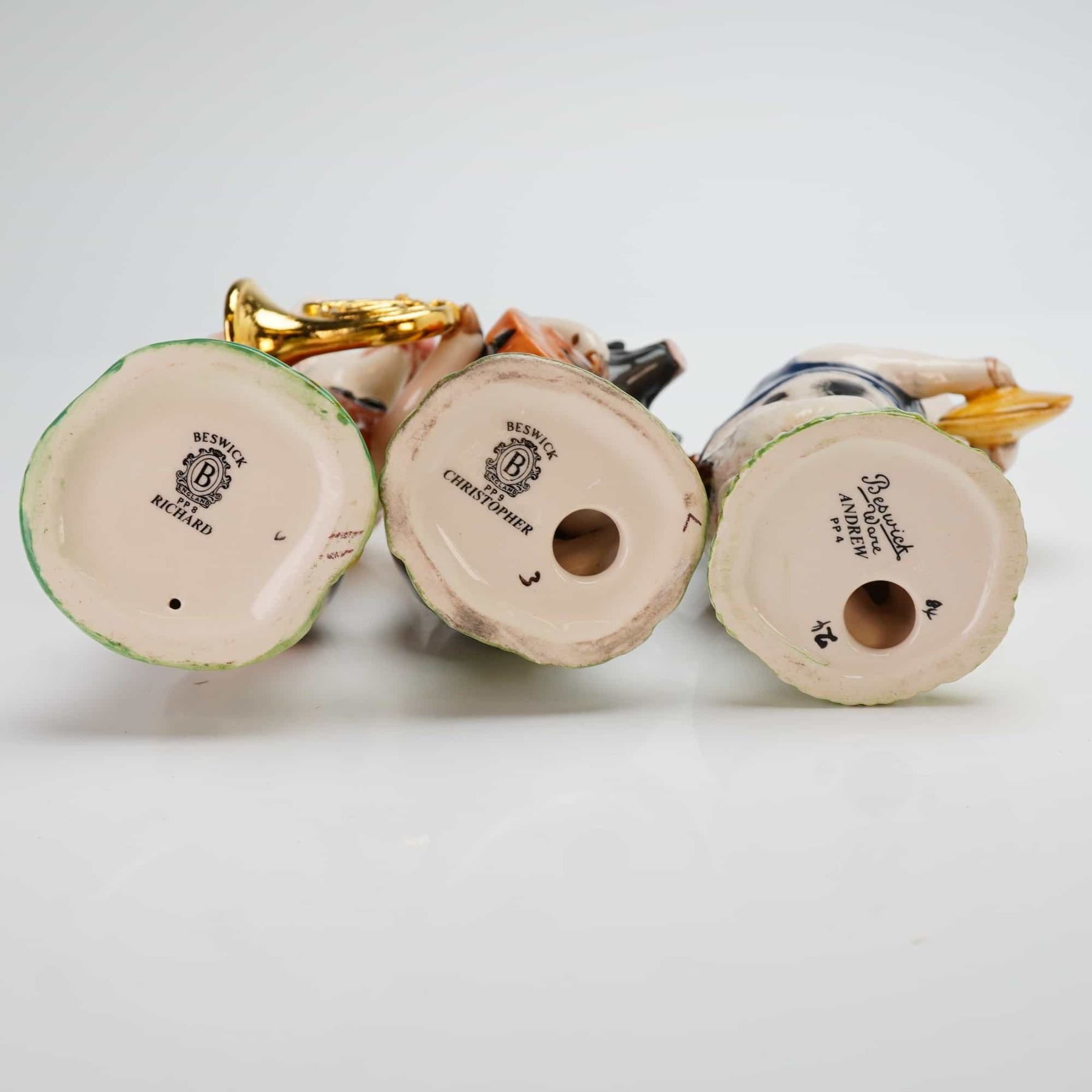 A collection of three Beswick porcelain figurines from the Pig Promenade band series, featuring pigs playing instruments. The set includes Richard (PP8) with a gold-colored French horn, Christopher (PP9) with a guitar, and Andrew (PP4) with cymbals. Each figure is crafted from glazed porcelain and depicted standing upright on a textured green base. The characters are dressed in colorful waistcoats with black bow ties and feature hand-painted coat patterns including spotted and solid tones. The undersides of the bases bear the Beswick England or Beswick Ware circular backstamps along with the respective character name and model number.