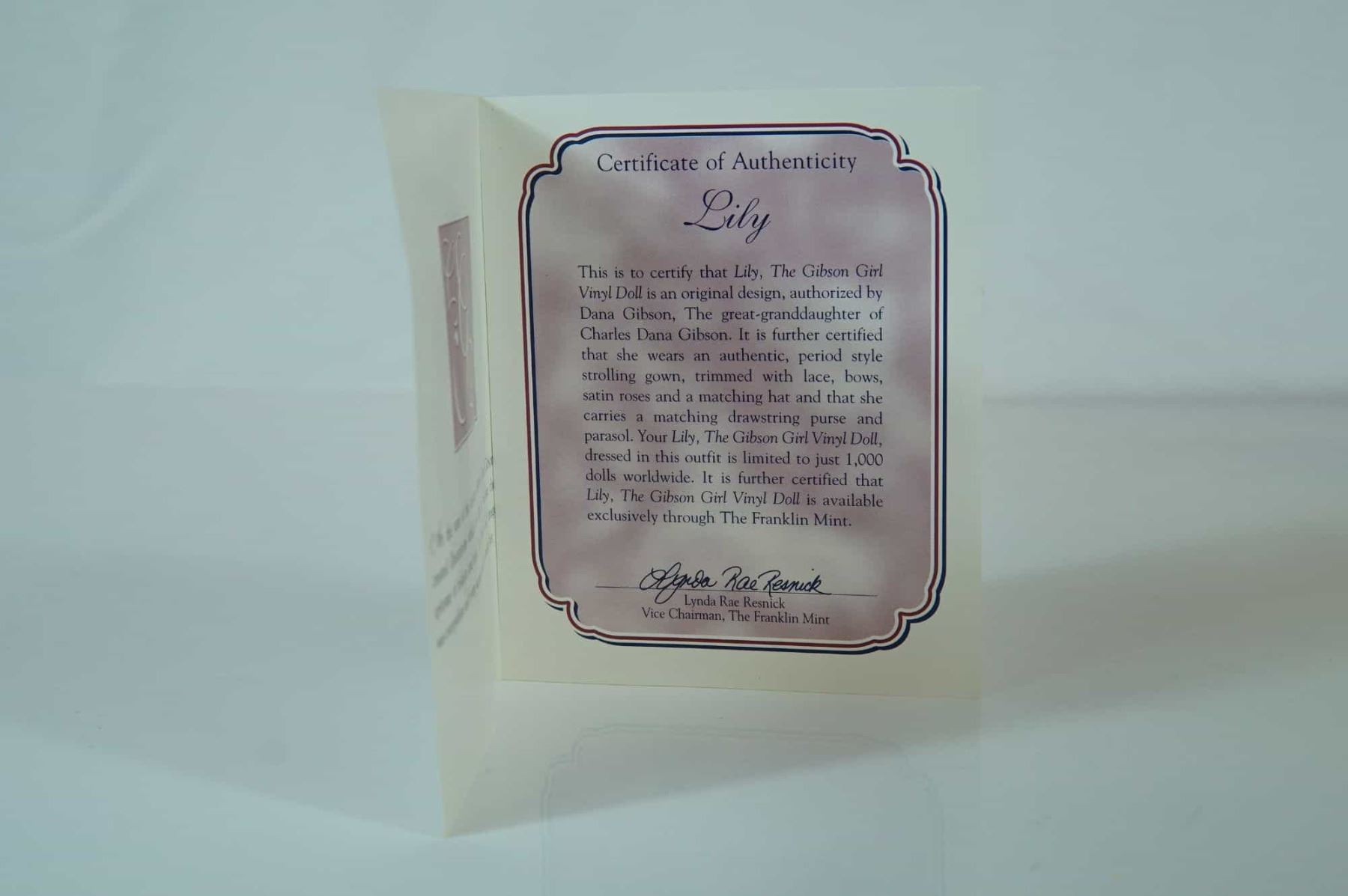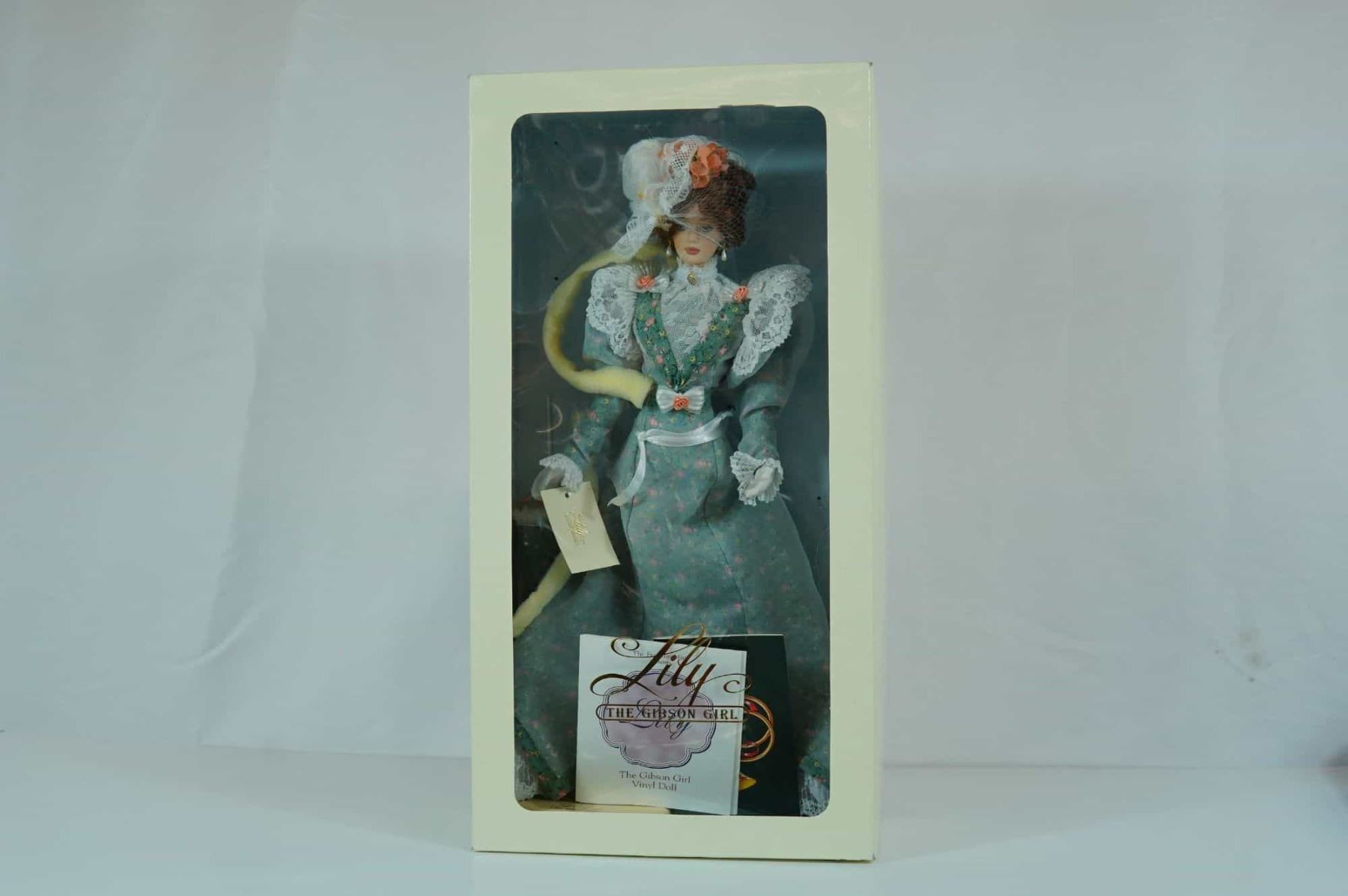A limited edition vinyl fashion doll manufactured by The Franklin Mint, titled Lily, The Gibson Girl. This doll is part of a limited edition of 1,000 dolls worldwide. The doll features a brunette styled wig and fixed inset eyes. She is dressed in her original period-style ensemble consisting of a green floral-patterned strolling gown with an oversized white lace collar, lace cuffs, and peach satin rose accents. The outfit is completed with a matching wide-brimmed lace hat featuring a veil and orange floral trim. Per the included Certificate of Authenticity, the doll also comes with a matching drawstring purse and a parasol. Documentation includes the original Certificate of Authenticity authorized by Dana Gibson and signed by Lynda Rae Resnick, as well as an informational booklet. Height approximately 18 inches.