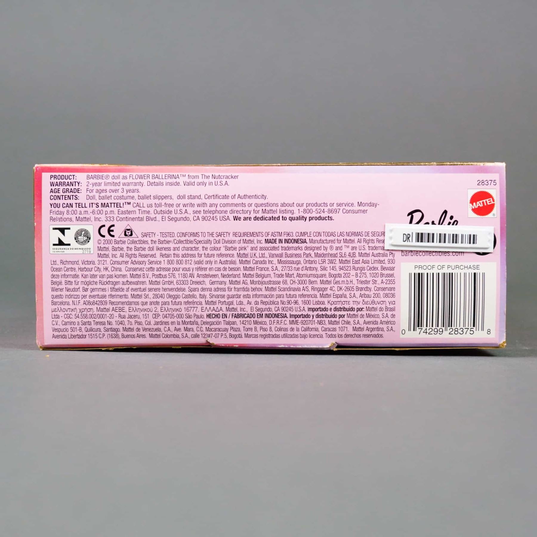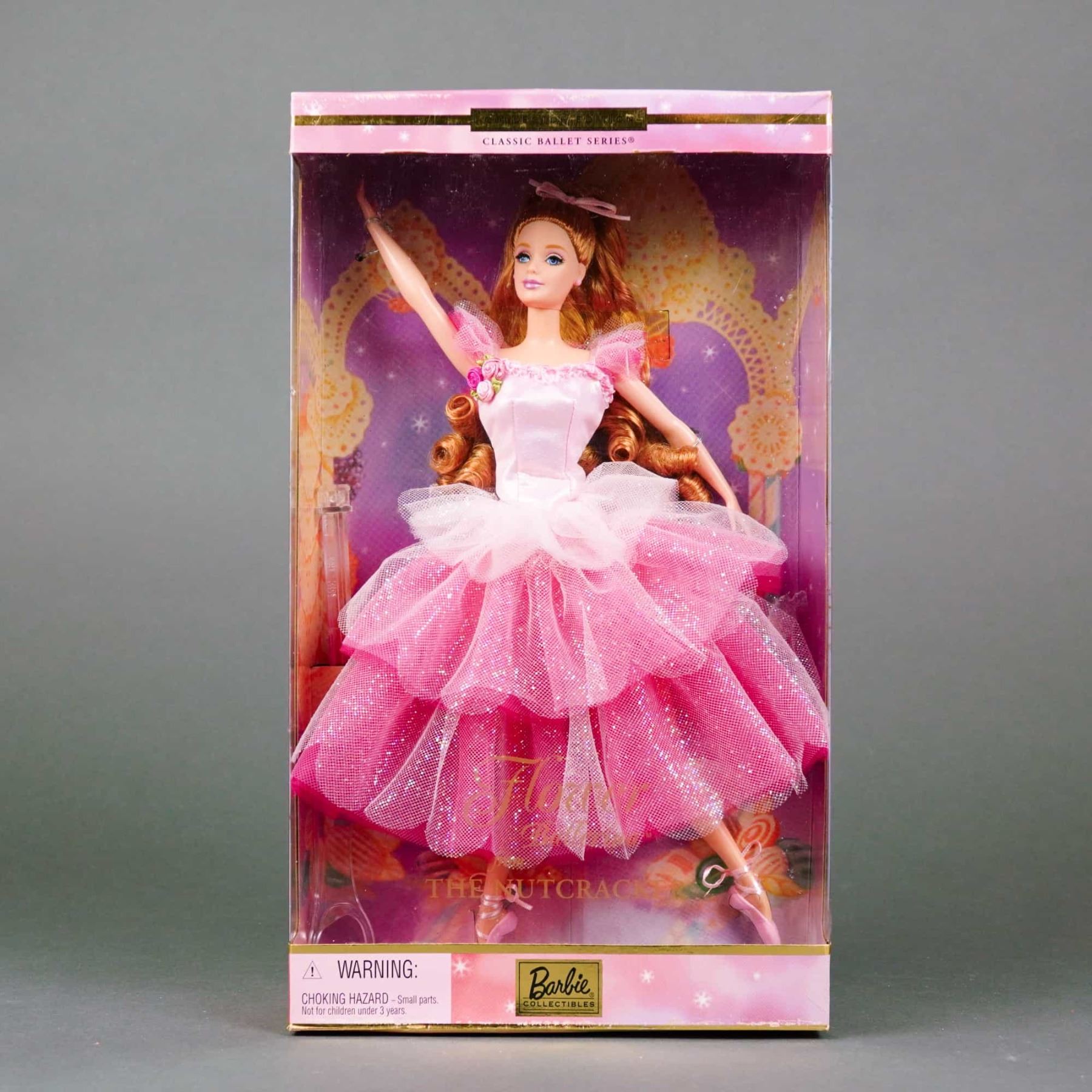 Manufactured by Mattel as part of the Classic Ballet Series (Product No. 28375), this vinyl collectible doll represents the Flower Ballerina from The Nutcracker. The doll features rooted strawberry-blonde synthetic hair styled in long waves with a hair bow and fixed painted blue eyes with detailed eyelashes. She is dressed in her original costume, which includes a pink satin bodice accented with fabric roses, a multi-layered tutu of pink and rose tulle with a glitter finish, and pink satin ballet slippers. The item is marked with a 2000 copyright and includes a doll stand and a Certificate of Authenticity within the packaging. 11.5 inches.