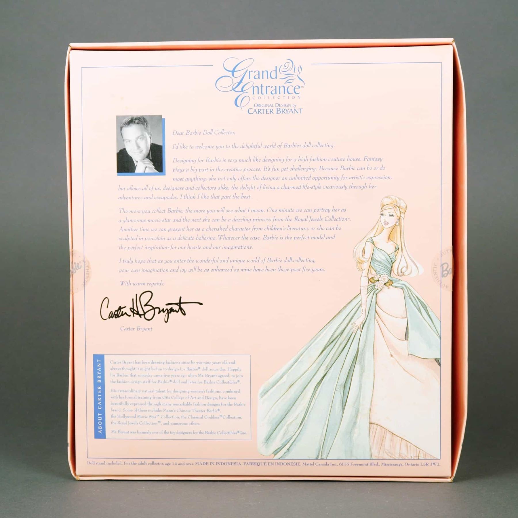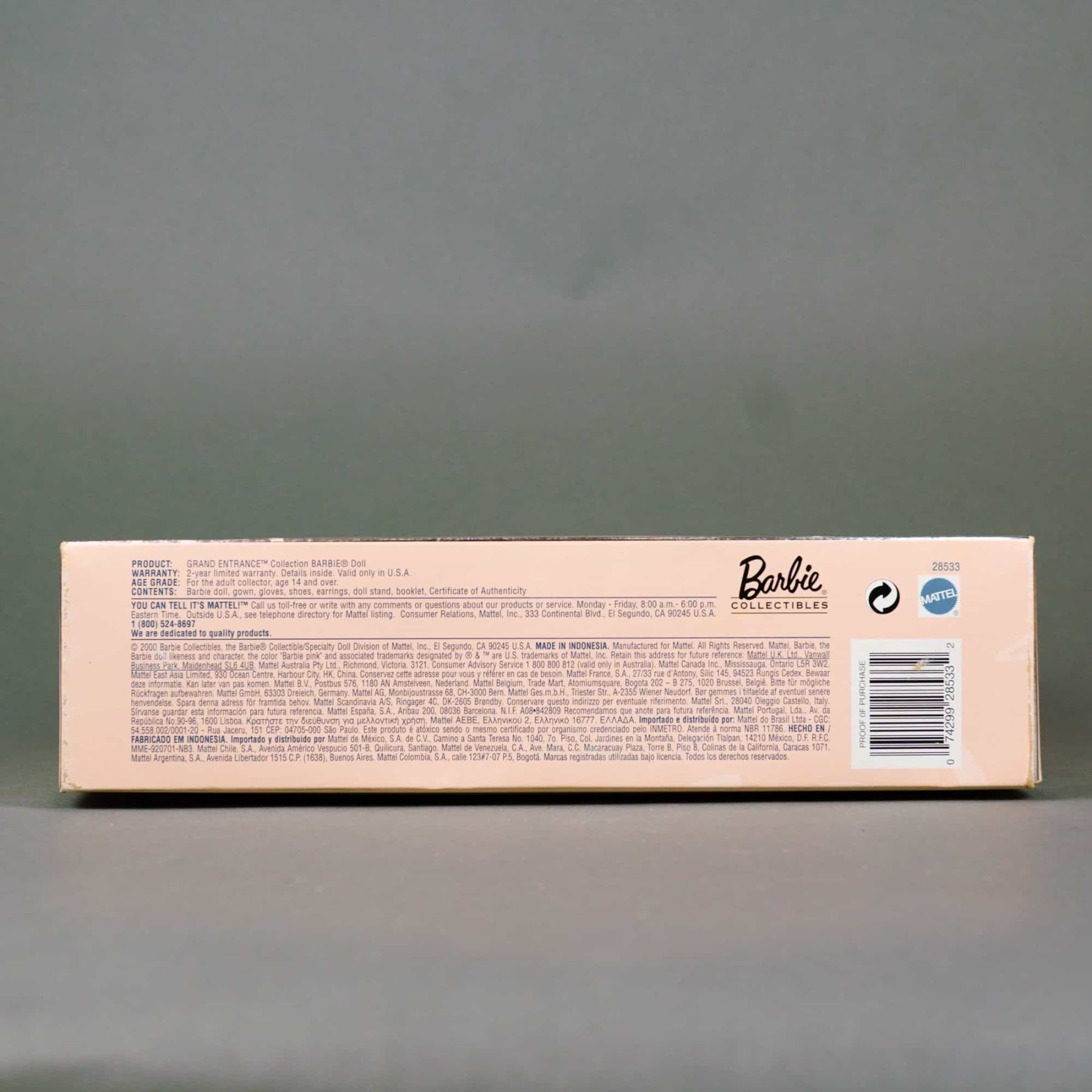 Produced by Mattel under the Barbie Collectibles division, this vinyl fashion doll is the first in the Grand Entrance Collection, designed by Carter Bryant. The doll features a jointed vinyl body with a rooted blonde synthetic hair updo and painted blue stationary eyes with long, painted eyelashes. She wears her original teal and cream satin-style ballgown with a draped bodice, oversized bow, and floral bouquet at the waist. Accessories include white opera-length gloves, pearl-like stud earrings, and original shoes. The set is complete in the original packaging with a doll stand, Guide to Collecting booklet, and Certificate of Authenticity. The box is marked © 2000 Barbie Collectibles, the Barbie Collectible/Specialty Doll Division of Mattel, Inc. and MADE IN INDONESIA. Height approximately 11.5 inches.