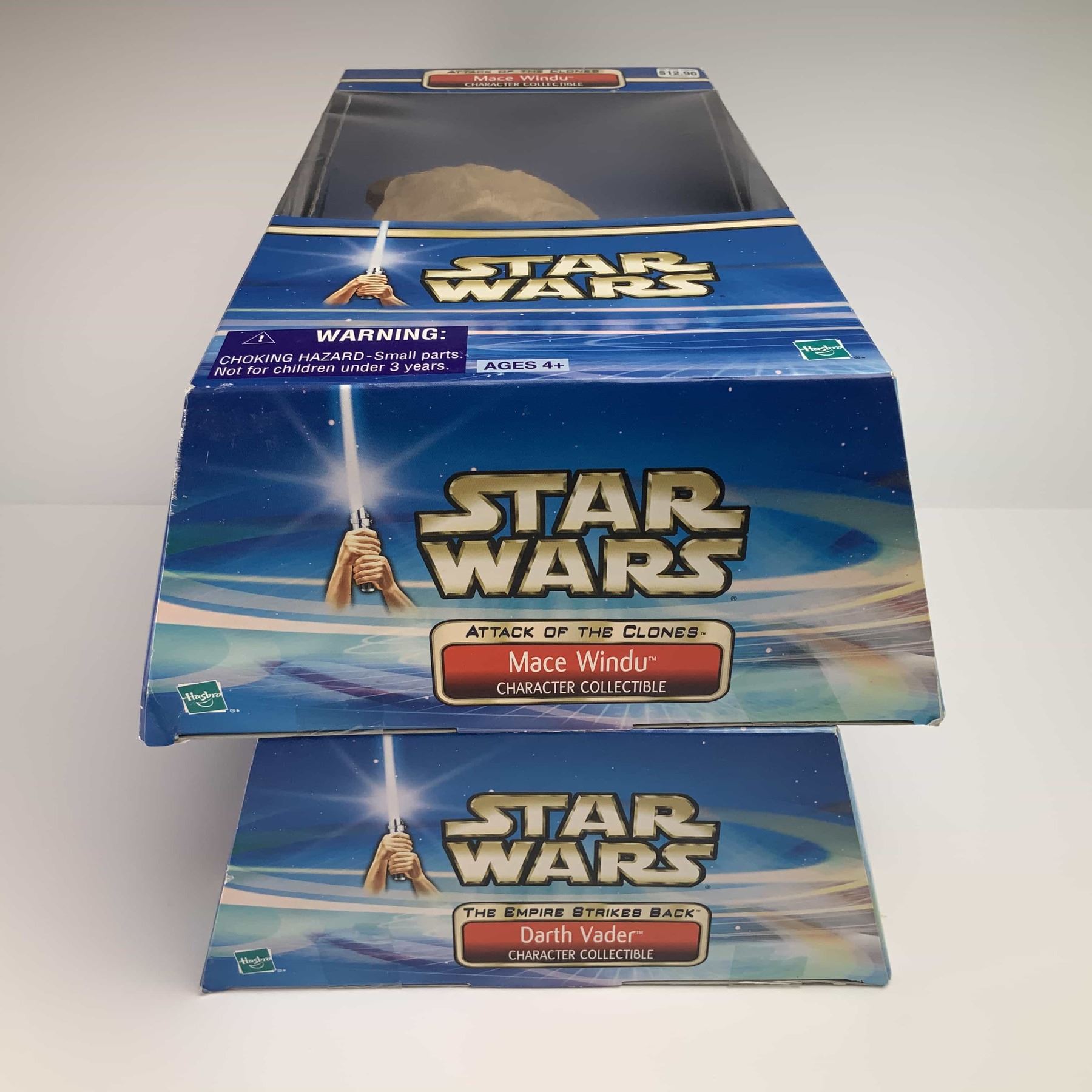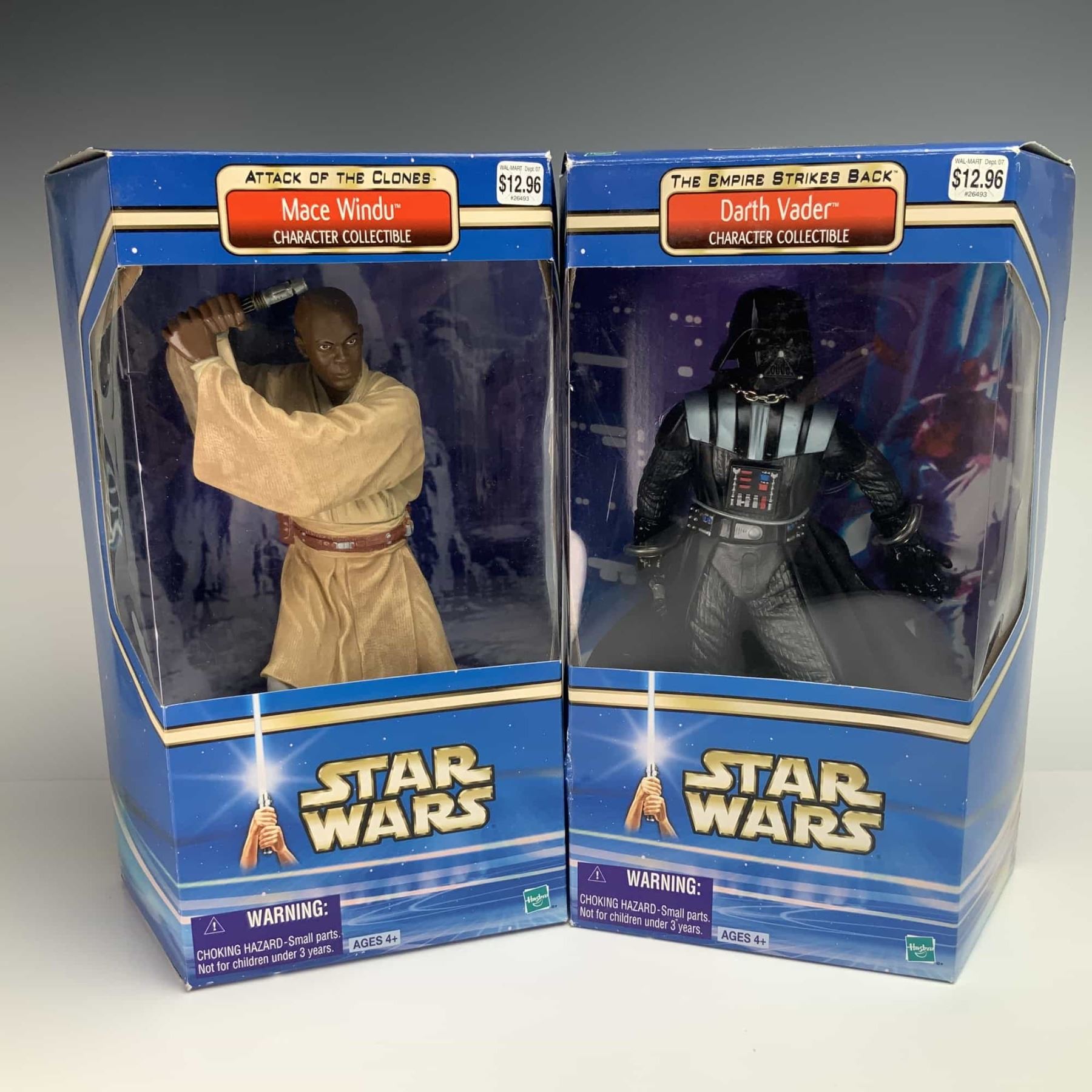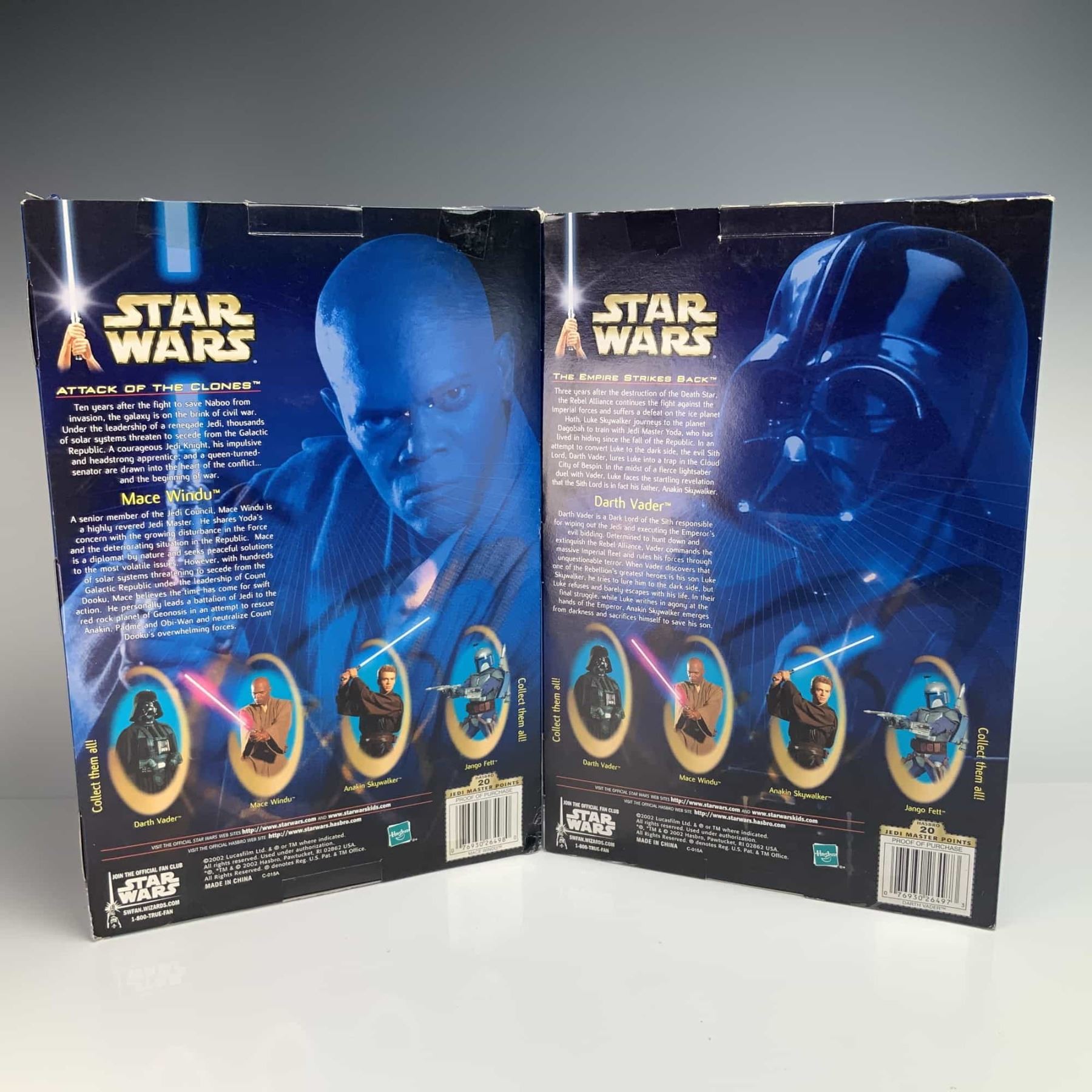 This lot consists of 2pc Star Wars action figures produced by Hasbro as part of the Character Collectible series. The figures are constructed of molded plastic and are presented in their original retail window box packaging. The first figure depicts Mace Windu from Star Wars: Attack of the Clones, featuring the likeness of Samuel L. Jackson in Jedi robes with a lightsaber hilt. The second figure depicts Darth Vader from Star Wars: The Empire Strikes Back in his signature black armor and cape. Both boxes retain original Walmart retail price stickers of $12.96. The reverse of the packaging for both items includes the Hasbro logo and copyright information: ©2002 Lucasfilm Ltd. & ® or TM where indicated... ©, TM & © 2002 Hasbro, Pawtucket, RI 02862 USA... MADE IN CHINA C-015A. Barcodes are 0 76930 26498 0 for Mace Windu and 0 76930 26497 3 for Darth Vader.