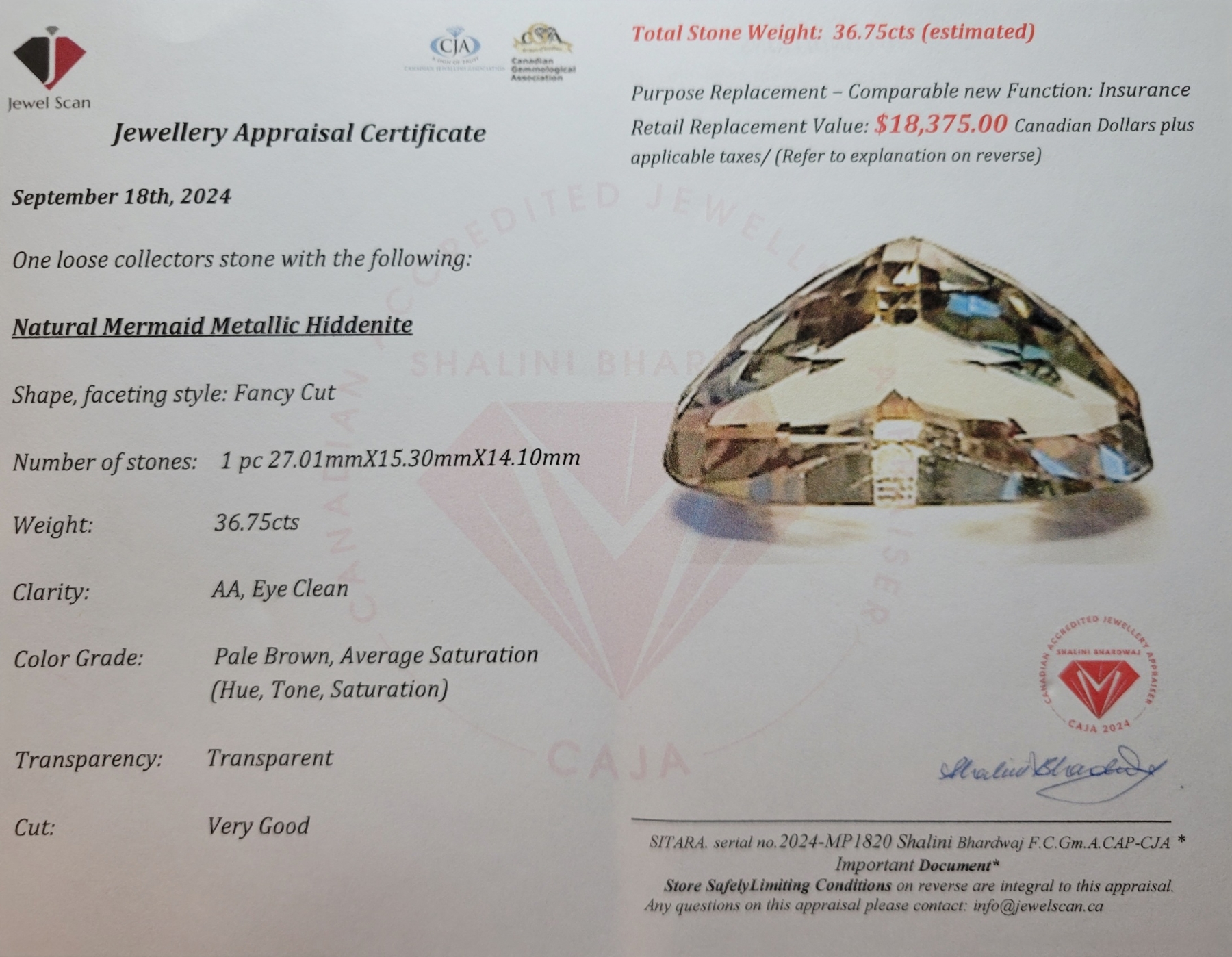 36.75 ct Certified Metallic Green Hiddenite gemstone ($18,375 Appraisal)