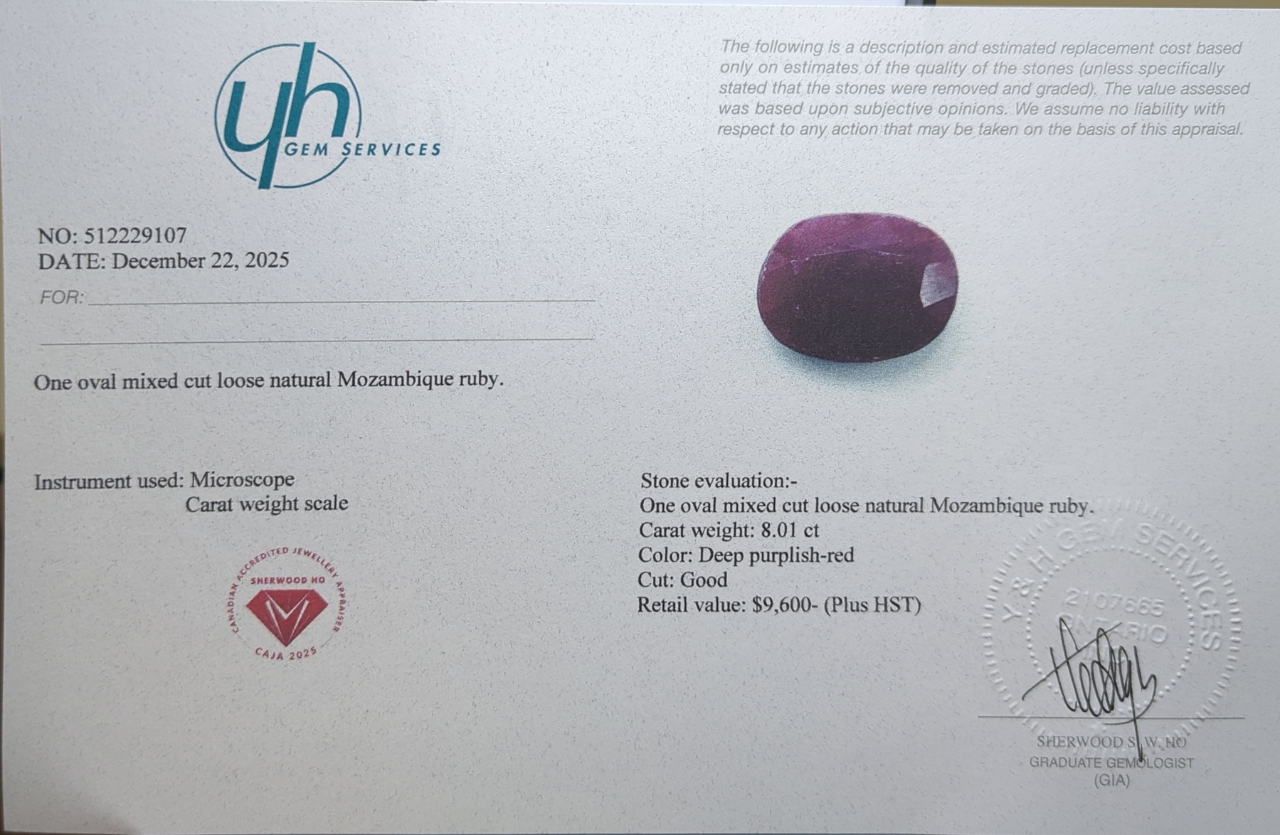 8.01 ct Certified Untreated Ruby gemstone ($9,600 Appraisal)