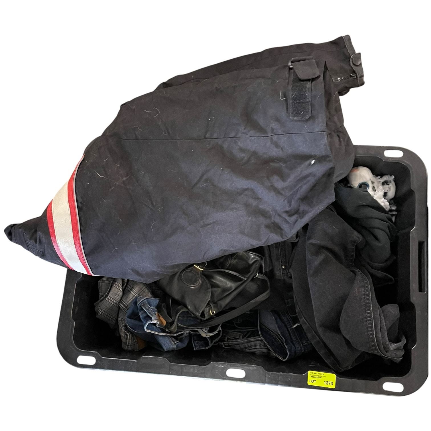 Container Filled with Assorted Jeans and a Motorcycle Jacket
