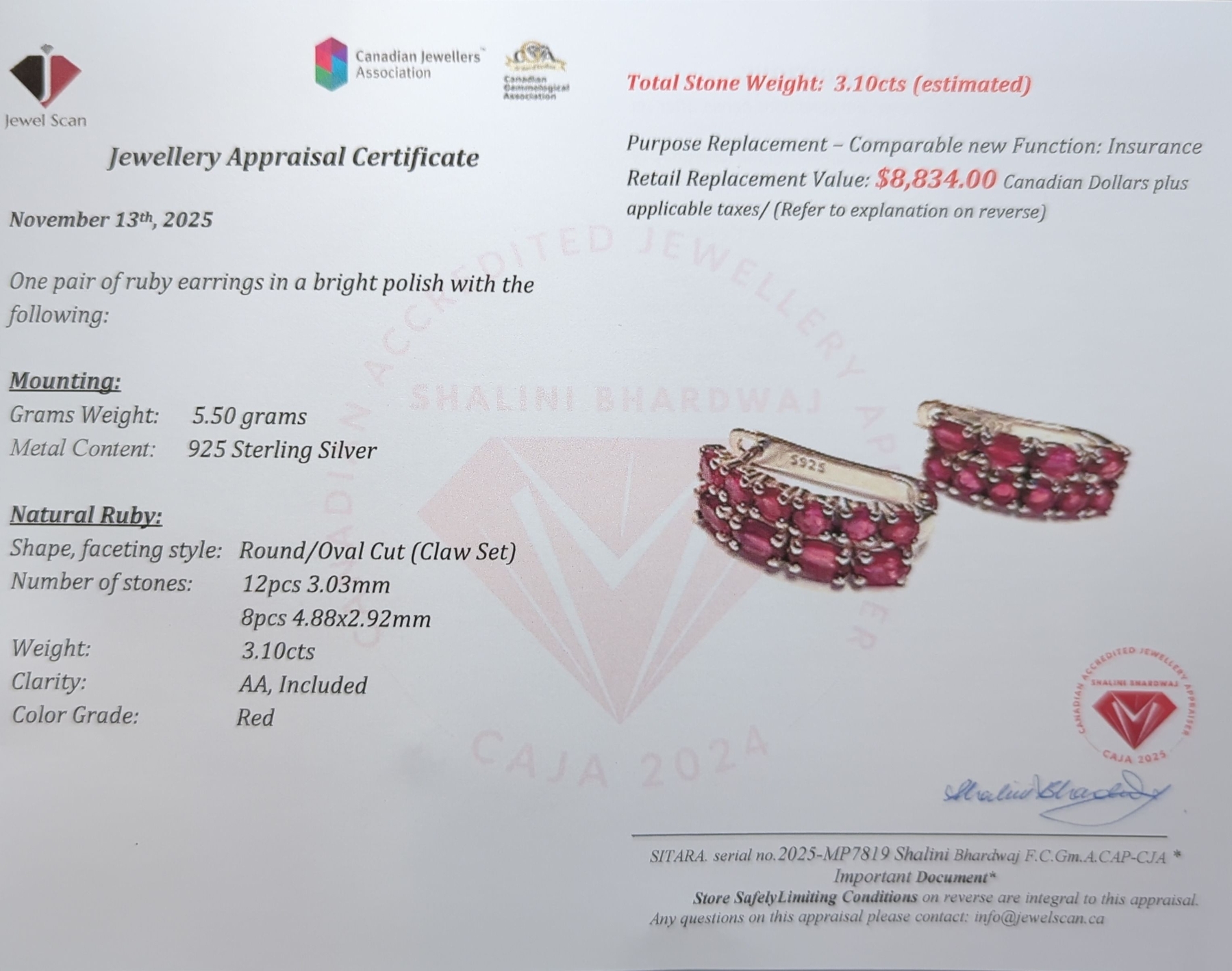 Lot 31 Silver Ruby gemstone Earrings 5.5 ct Certified ($8,834 Appraisal)