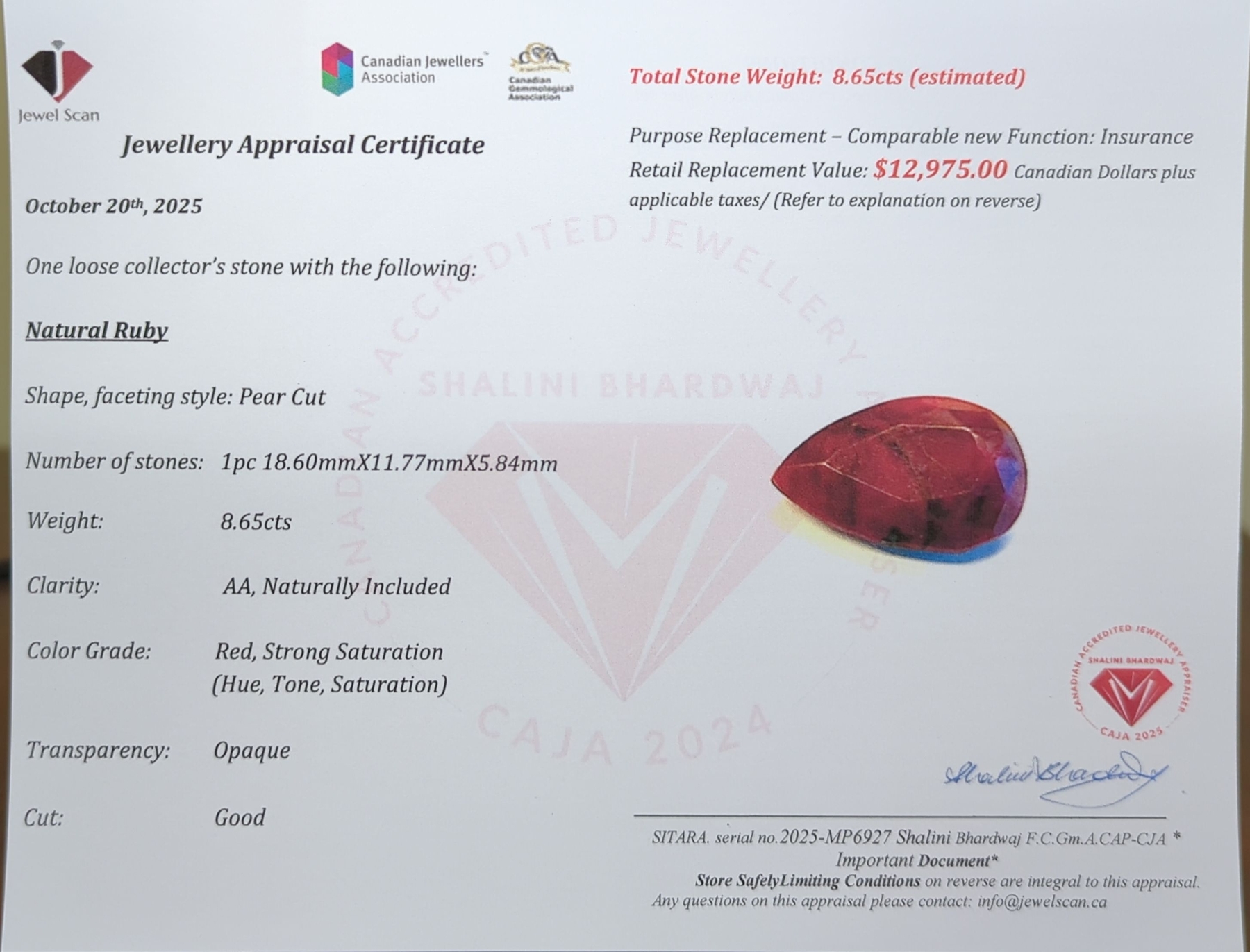 8.65 ct Certified Ruby gemstone Value ($12,975 Appraisal)