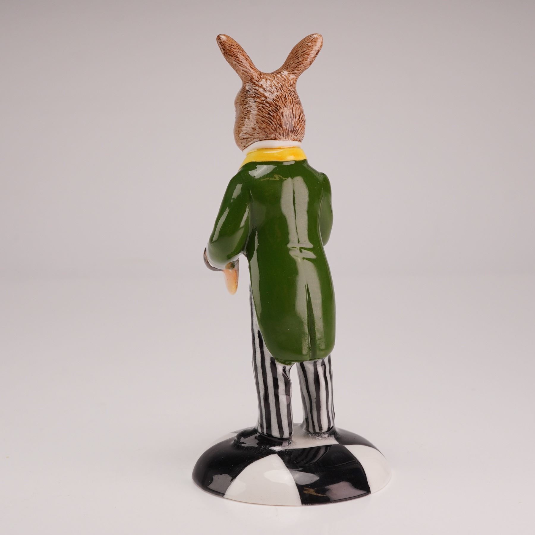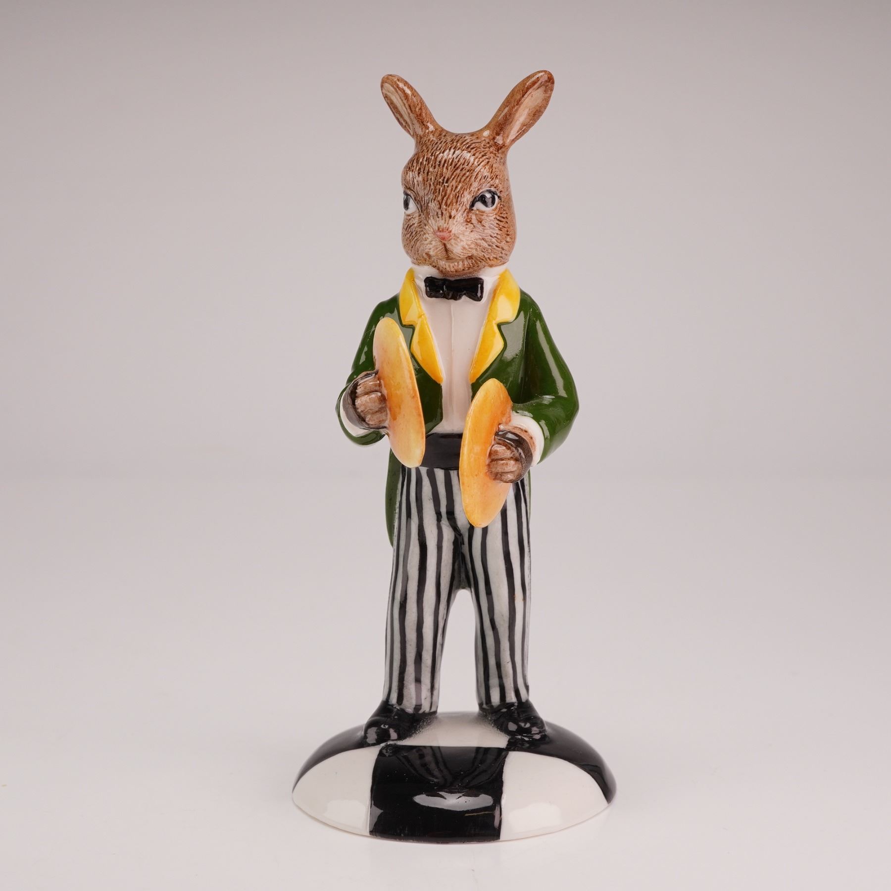 The rabbit is depicted standing and playing two yellow cymbals. The figure is dressed in a formal ensemble consisting of a dark green tailcoat with yellow lapels, a white shirt, a black bow tie, and trousers with vertical black and white stripes. The rabbit features realistic fur texture on the head and ears. The figure stands on a circular base decorated with a black and white segmented pattern. The base is marked with the Royal Doulton backstamp Prototype Only.