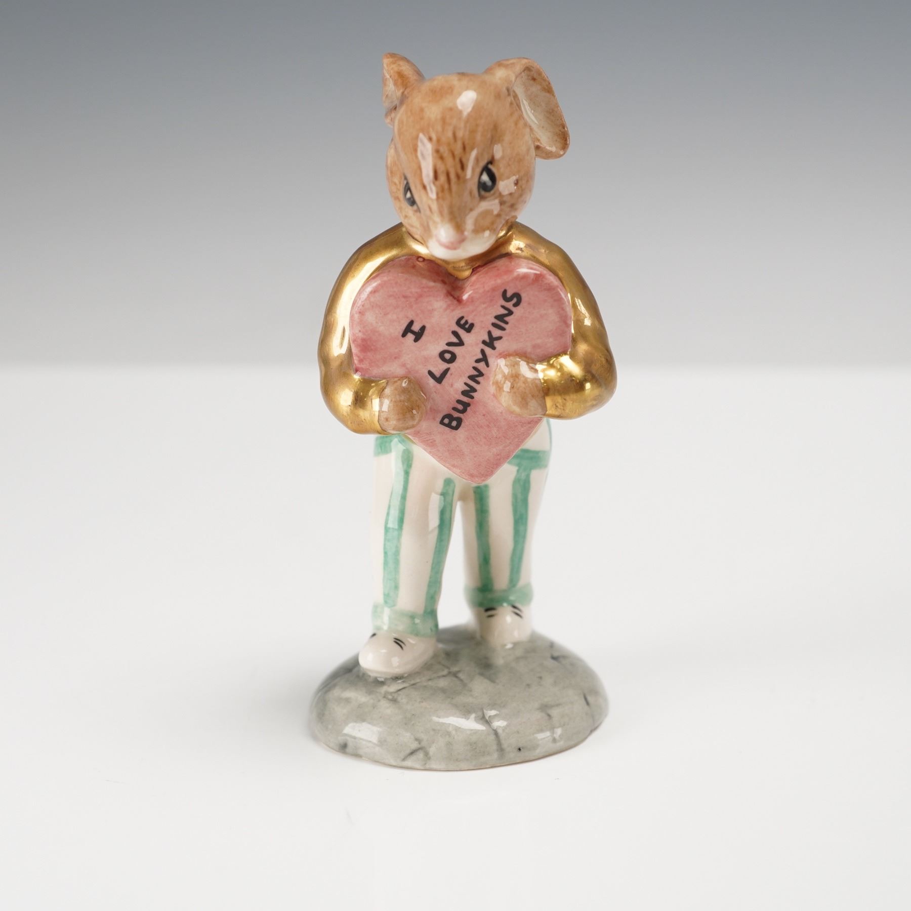 Hand-made and hand-decorated porcelain figure depicting a Bunnykins character wearing a gold-colored shirt and green-and-white striped trousers, holding a pink heart inscribed with I Love Bunnykins. Produced exclusively for UK International Ceramics Ltd as part of a limited edition in a special gold colorway. The underside bears the Royal Doulton backstamp.