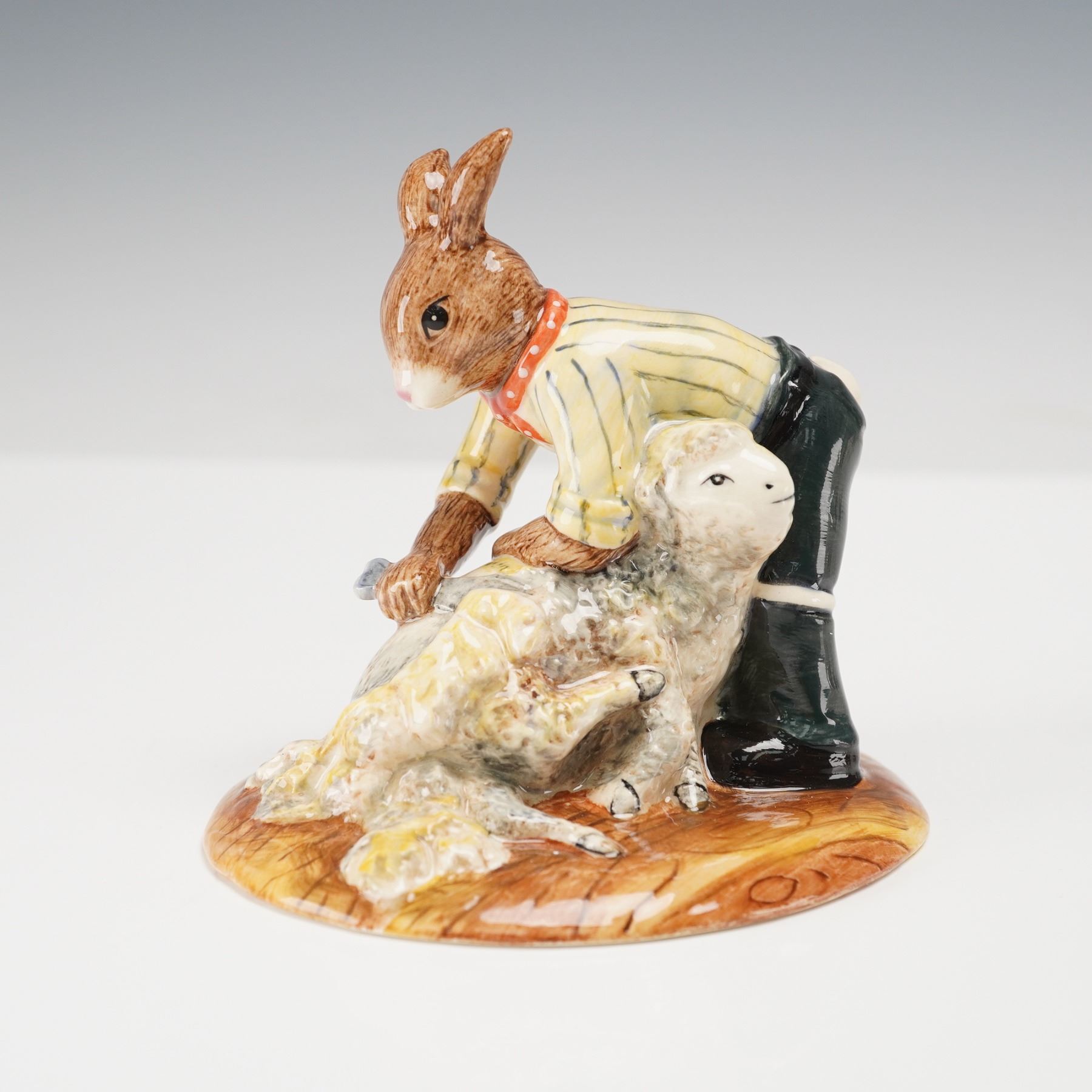 Depicting a rabbit wearing a striped yellow shirt and dark trousers while shearing a sheep. The hand-painted ceramic figure displays fine detailing such as a red polka-dotted neckerchief, textured fleece, and a wood-grain effect base. The underside bears the Royal Doulton backstamp along with the PROTOTYPE mark.