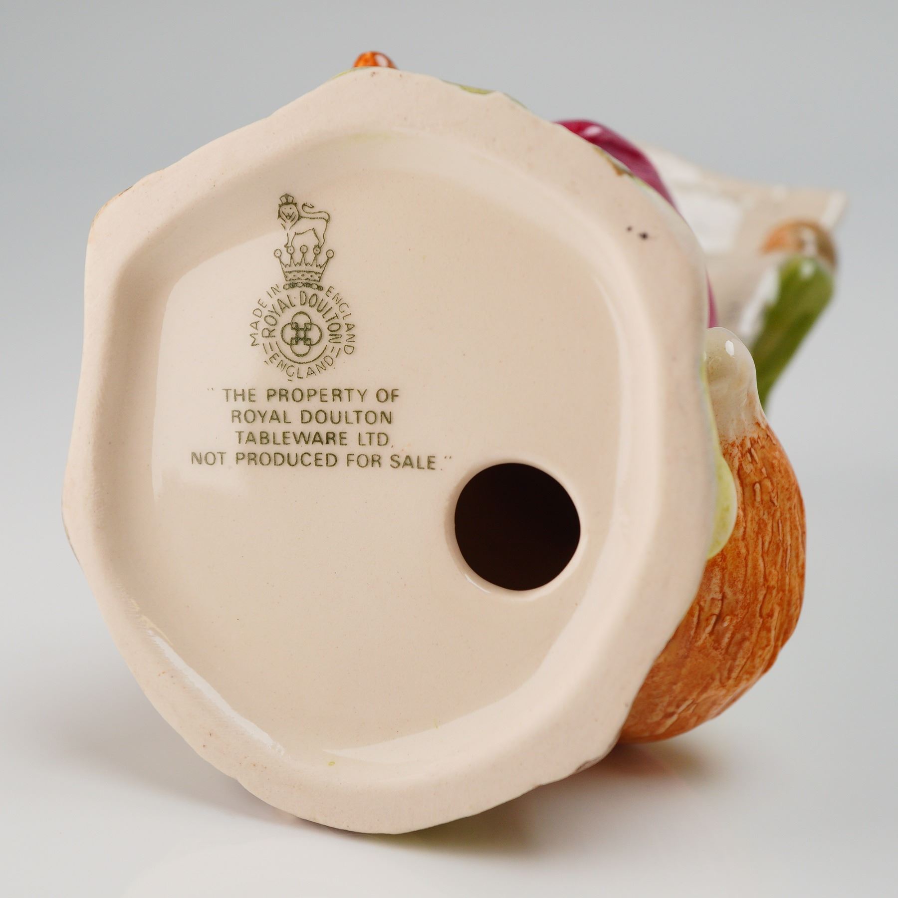 A single glazed ceramic figurine manufactured by Royal Doulton, identified as the Beatrix Potter character Foxy Reading Country News. The anthropomorphic fox figurine is depicted seated on a tree stump, wearing a green coat and magenta breeches while holding and reading a newspaper. The piece is finished in bright polychrome glazes, highlighting the naturalistic colors of the fox fur and detailed base elements. The underside of the figurine features the Royal Doulton crown backstamp with the circular text "MADE IN ROYAL DOULTON ENGLAND." Below the crown, the piece is stamped with the text: "THE PROPERTY OF ROYAL DOULTON TABLEWARE LTD. NOT PRODUCED FOR SALE."