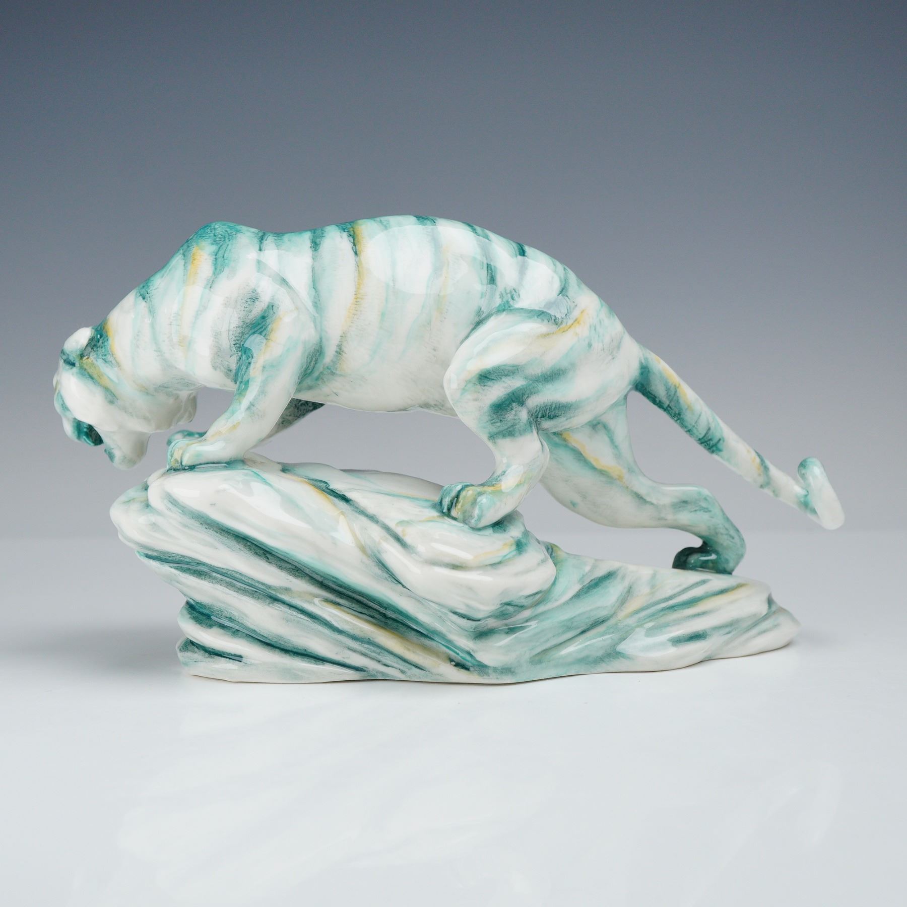 Lot 17 Royal Doulton Prototype Jade Glazed Figure, Tiger on Rock HN2639