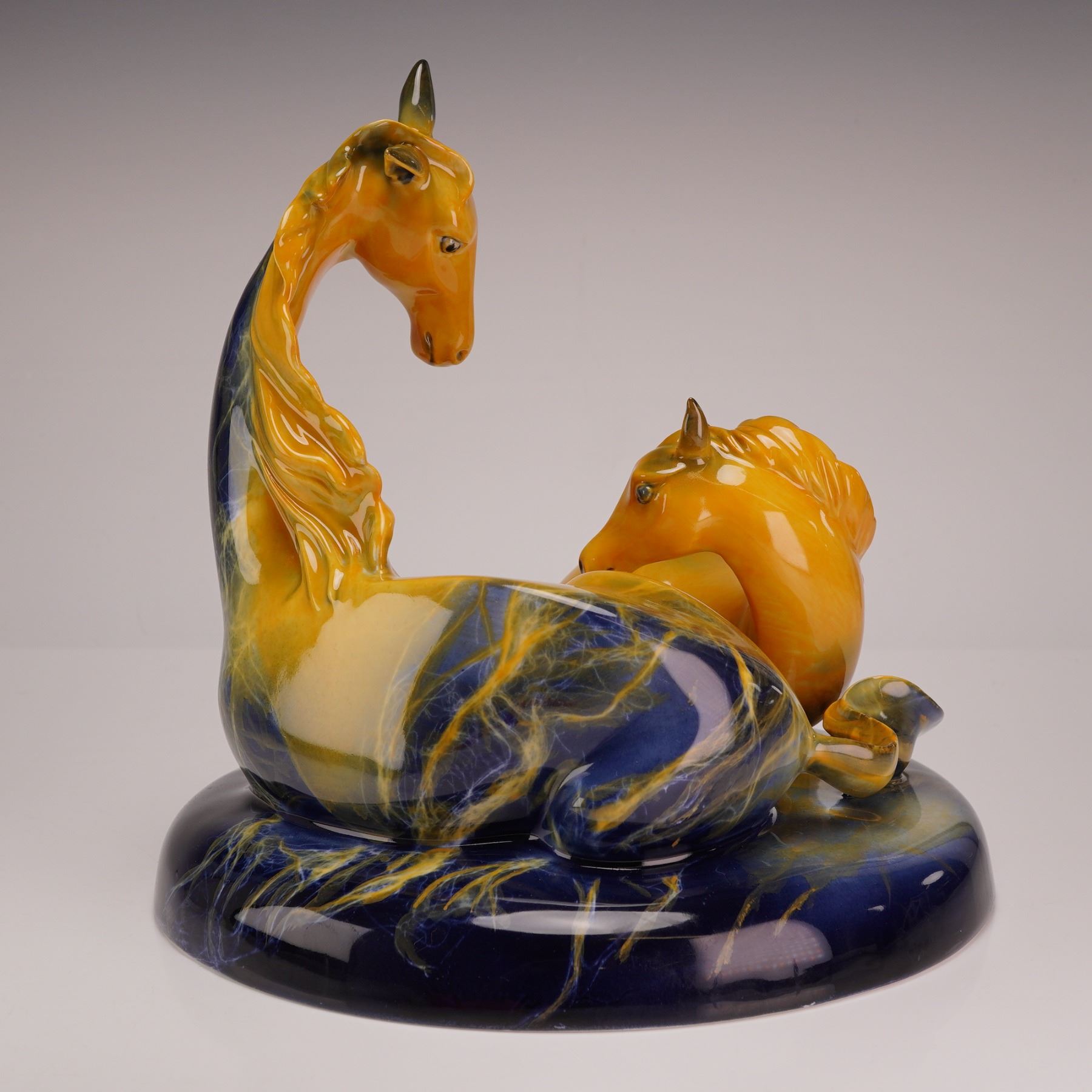 This Royal Doulton ceramic sculpture is titled Gift of Life and belongs to the Images of Fire collection. The piece depicts a stylized mare and foal in a reclining pose, characterized by the elongated and modernistic lines of the Images series. The sculpture is finished in a high-gloss transmutation glaze that transitions from a deep cobalt blue at the base to vibrant amber and yellow tones across the bodies of the horses. The glaze features intricate flame-like marbling and veining throughout the surface. The base contains the Royal Doulton backstamp.