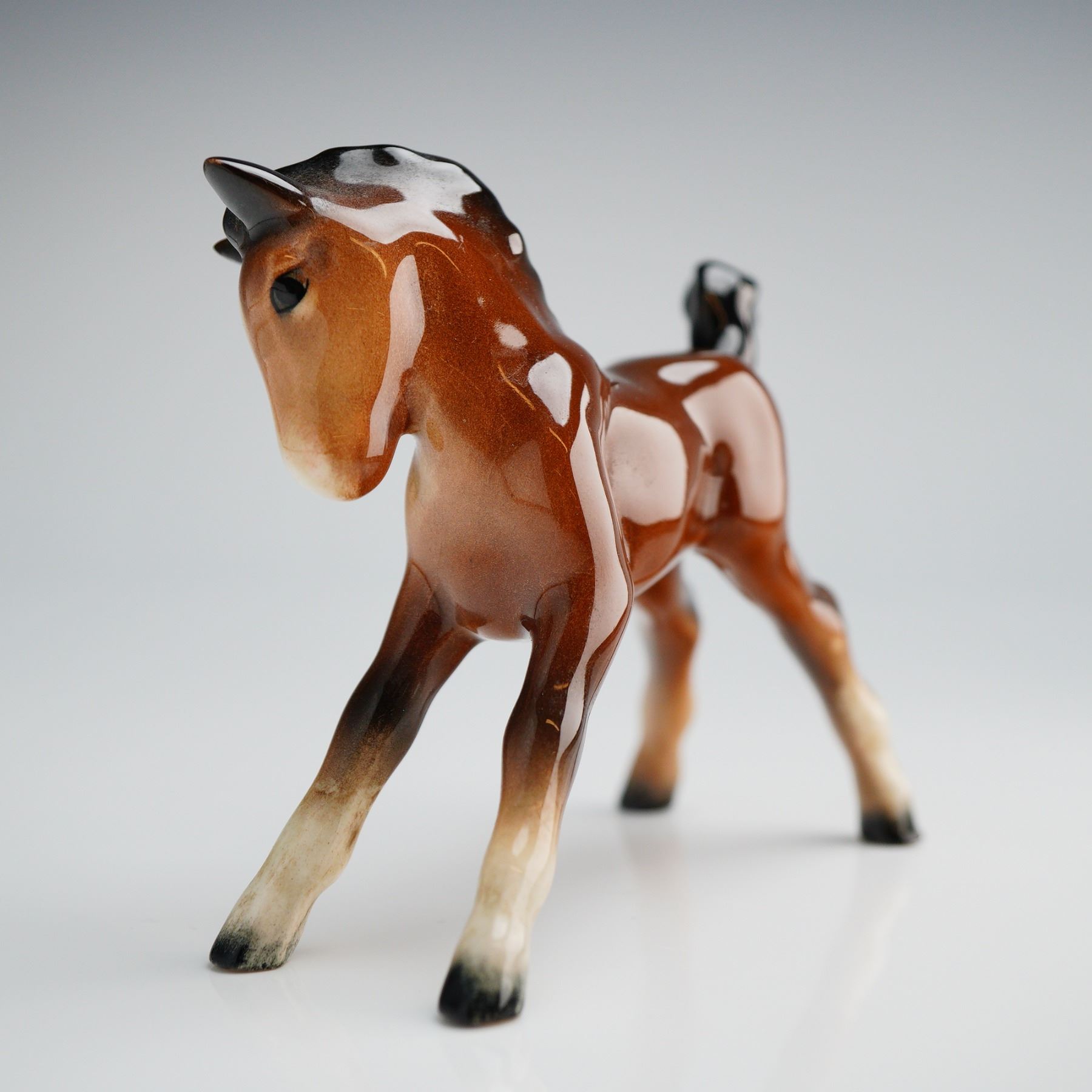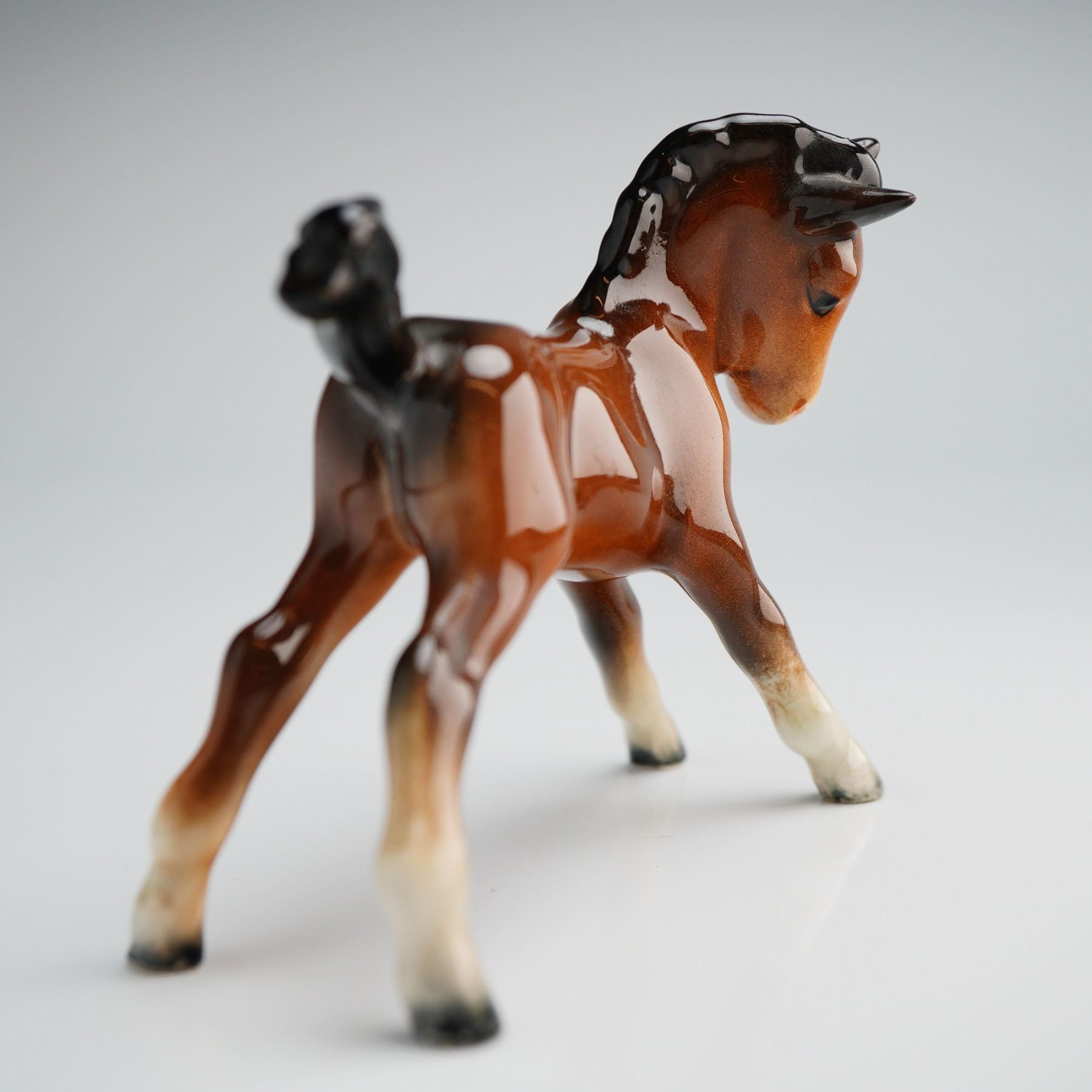 A single ceramic figurine attributed to Beswick, England, commonly identified as Model 996, depicting a young horse (foal). The piece is executed in a naturalistic style with a high-gloss glaze finish over porcelain or ceramic material. The coloring features a rich reddish-brown body (bay or chestnut), contrasted by black coloring on the mane, tail, and lower hooves. White markings are present on the socks and muzzle. The foal is posed mid-stride with the head turned slightly to the side. No factory stamps or impressed marks are visible on the exterior surfaces.