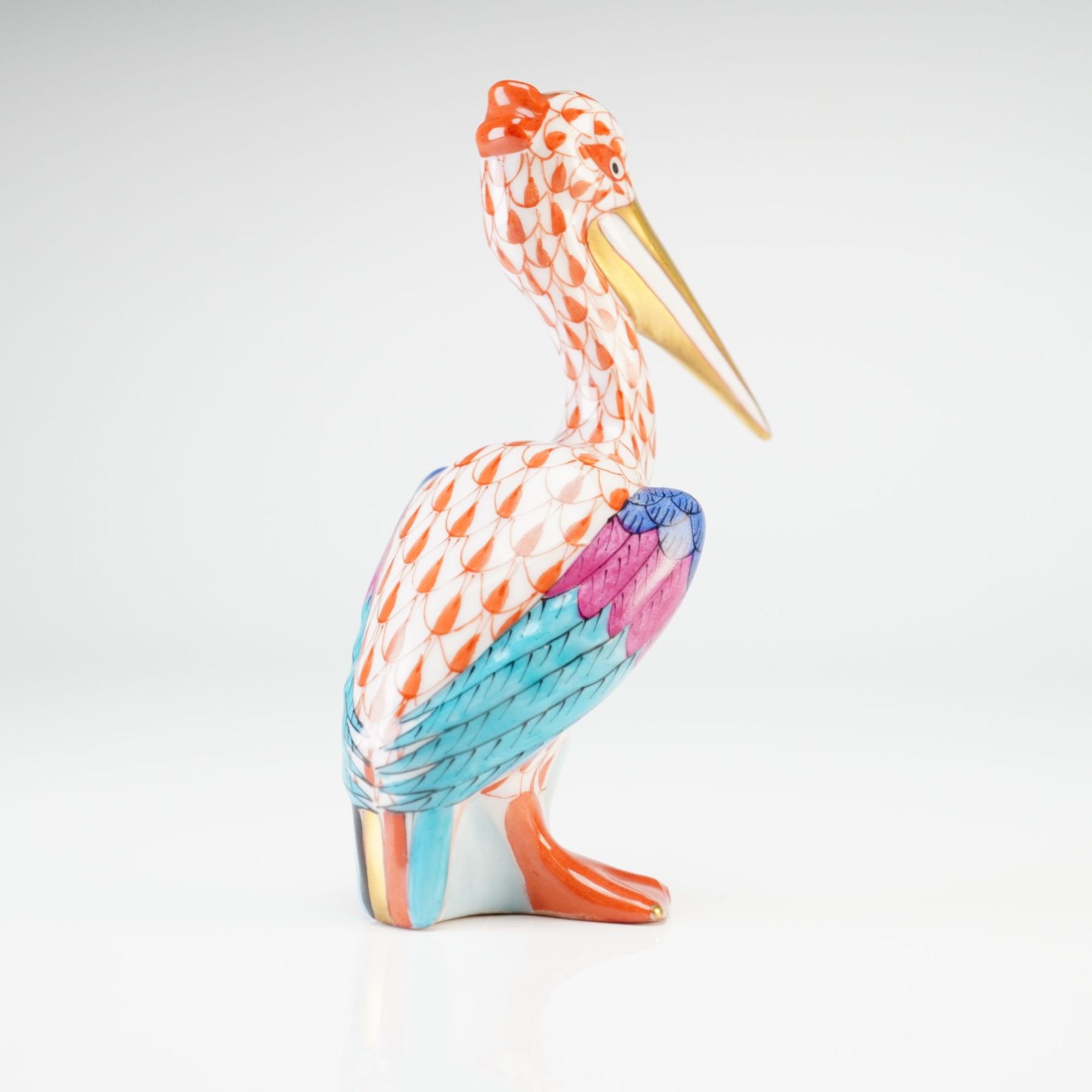 A Herend hand-painted porcelain figurine of a small pelican. The piece is decorated in the traditional Herend fishnet pattern in rust across the body, neck, and head. The wings are accented with multi-colored plumage in shades of blue, magenta, and turquoise. The bill and feet feature gilded highlights. The base bears the blue underglaze Herend backstamp.