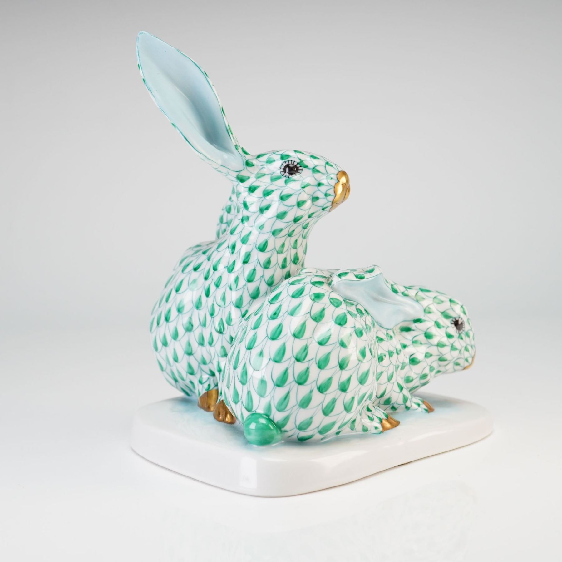 A pair of rabbits decorated in the signature green fishnet pattern. The model depicts one upright rabbit and one smaller crouching rabbit on a white oval base. The figures include gilded accents on the noses and paws, with light blue shading in the ears and on the base. The underside displays Herend backstamp.