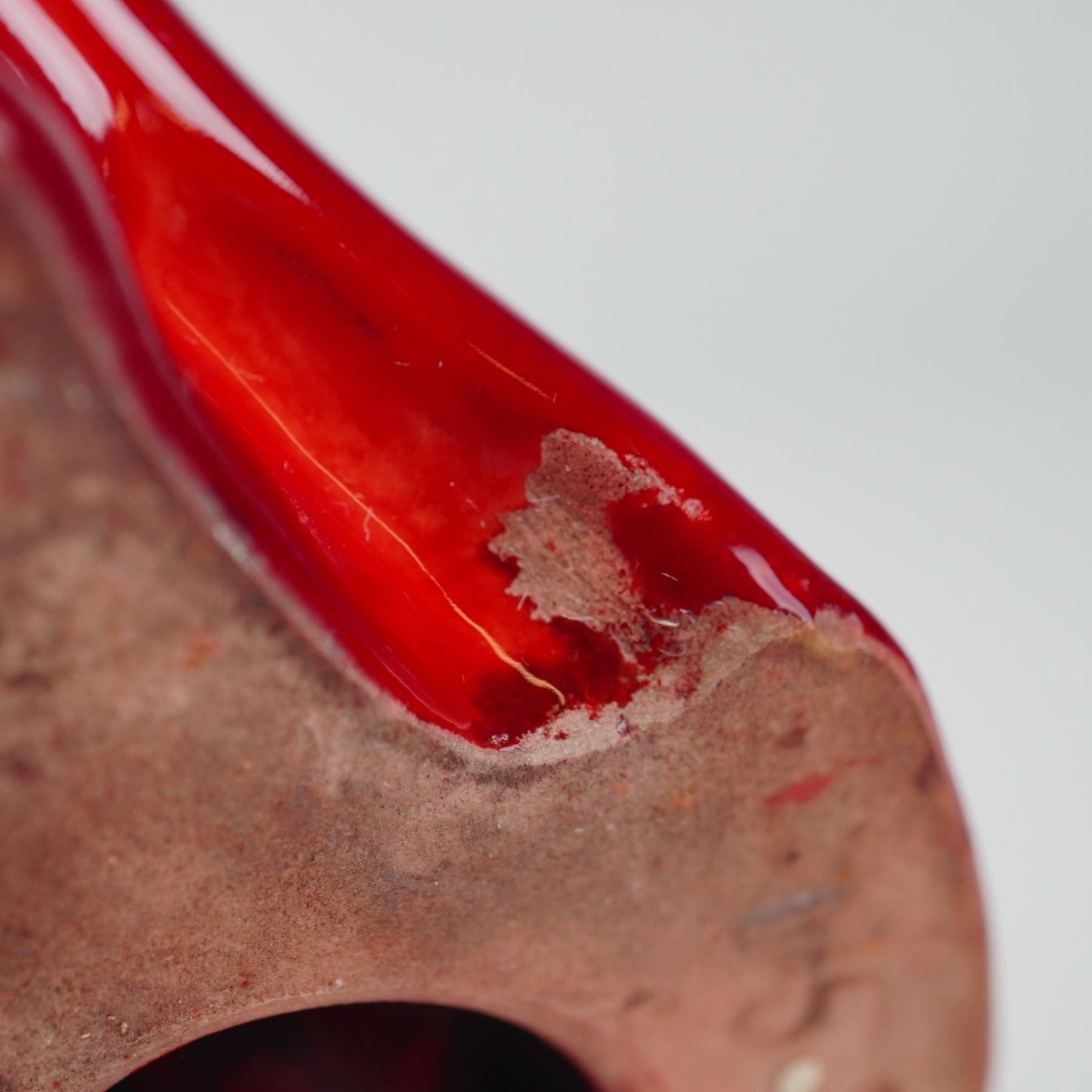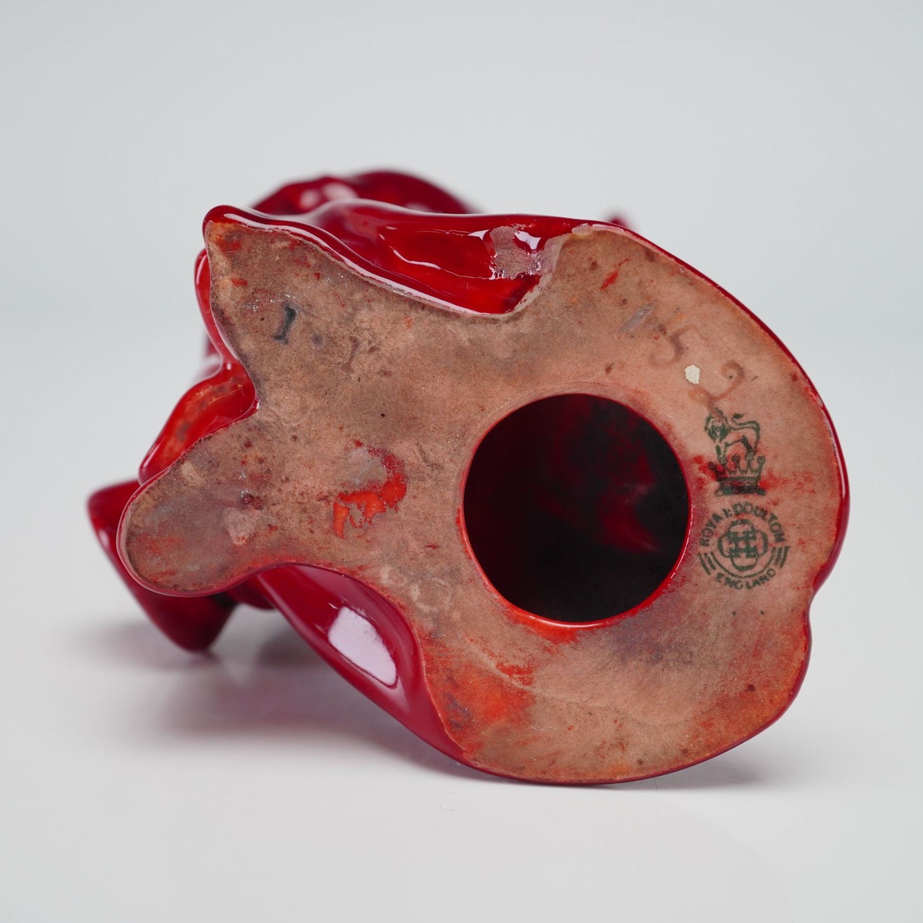 Depicts an anthropomorphic gentleman rabbit, also known as Hare in White Coat (HN102). The figure is modeled standing in a formal tailcoat and holds a top hat in its right paw. The piece is finished in a deep red flambe glaze, characterized by darker mottling and pooled color in the recessed areas of the mold. The underside bears the Royal Doulton backstamp.