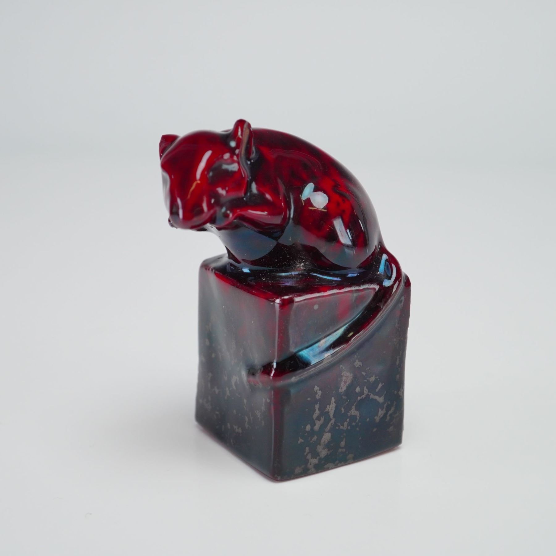 Designed by Charles Noke, the figure depicts a mouse positioned atop a rectangular block base. The piece is finished in the characteristic flambe glaze, displaying a deep oxblood red color with dark blue and black mottling and a high-gloss surface. The dark blue and black mottling finish is what makes the glaze experimental. The rodent is depicted in a hunched pose, with its tail wrapped around the corner of the plinth. The underside is marked Royal Doulton Flambe.