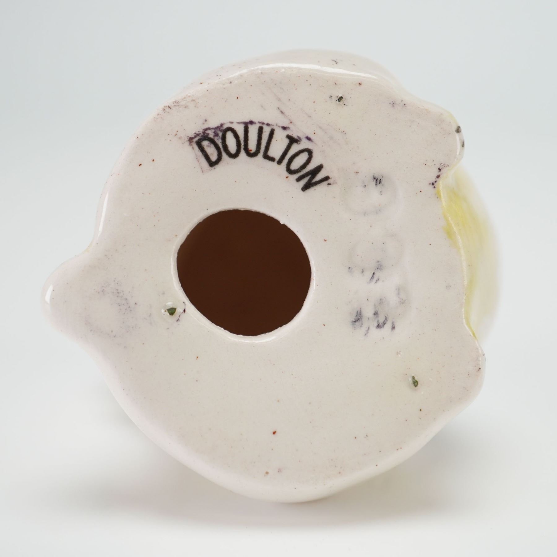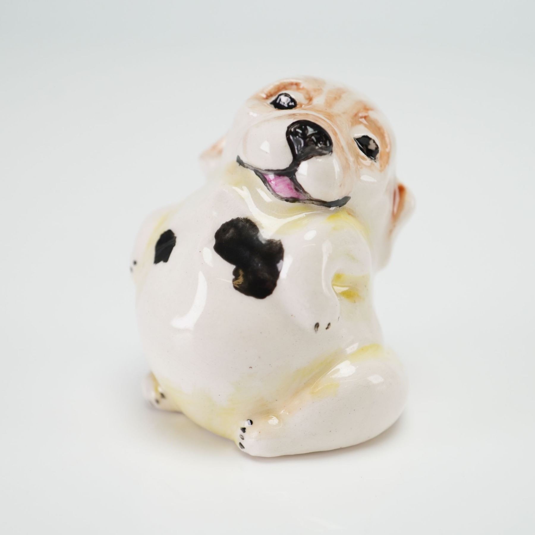 Designed by Charles Noke in Style Three, Model No. 387, this figurine depicts a seated bulldog puppy with spots. The piece is crafted from glazed ceramic with a white ground and features hand-painted black spots on the chest and side. The figure includes yellow-shaded highlights and a detailed face with brown eyes, a black nose, and a pink tongue. The underside is marked Doulton.