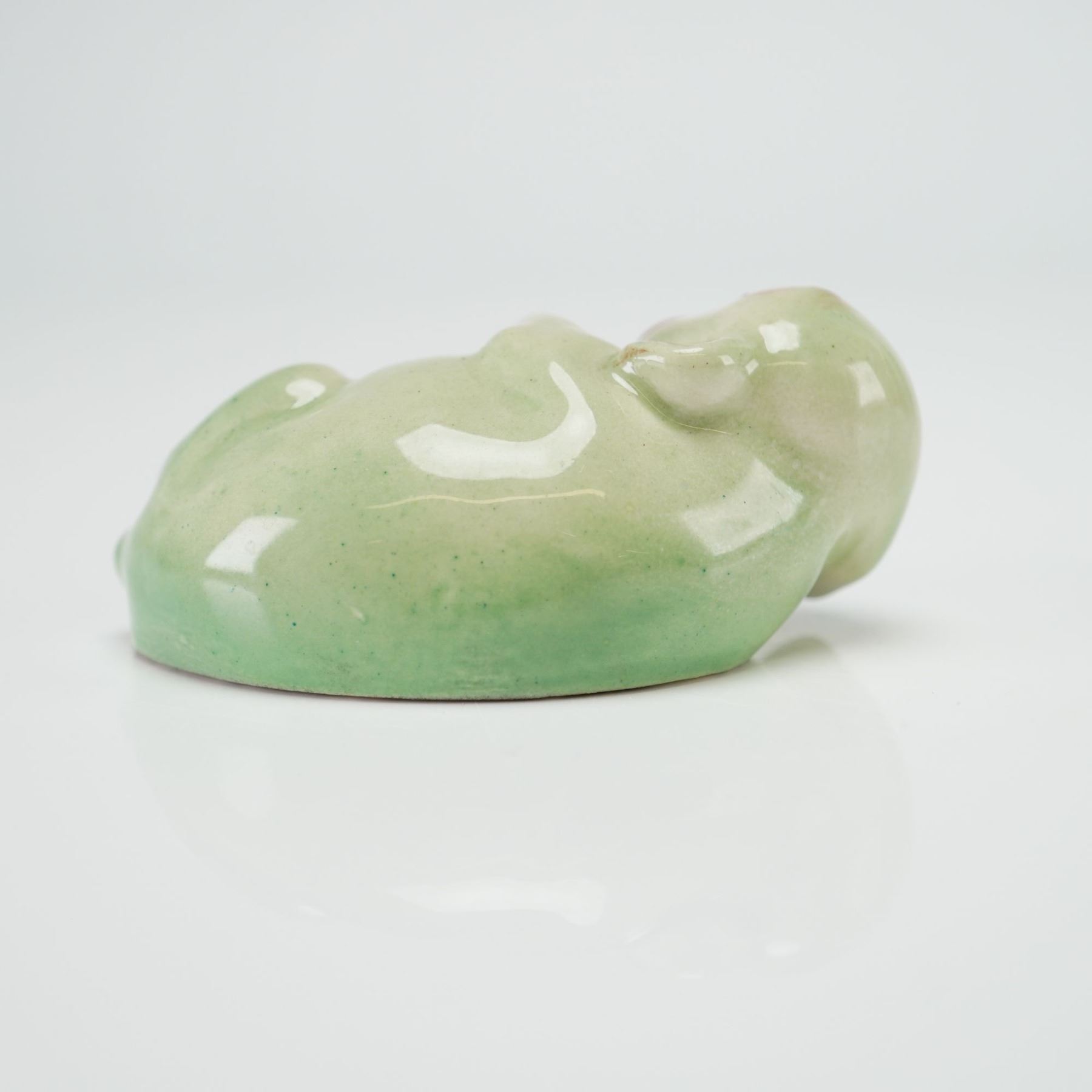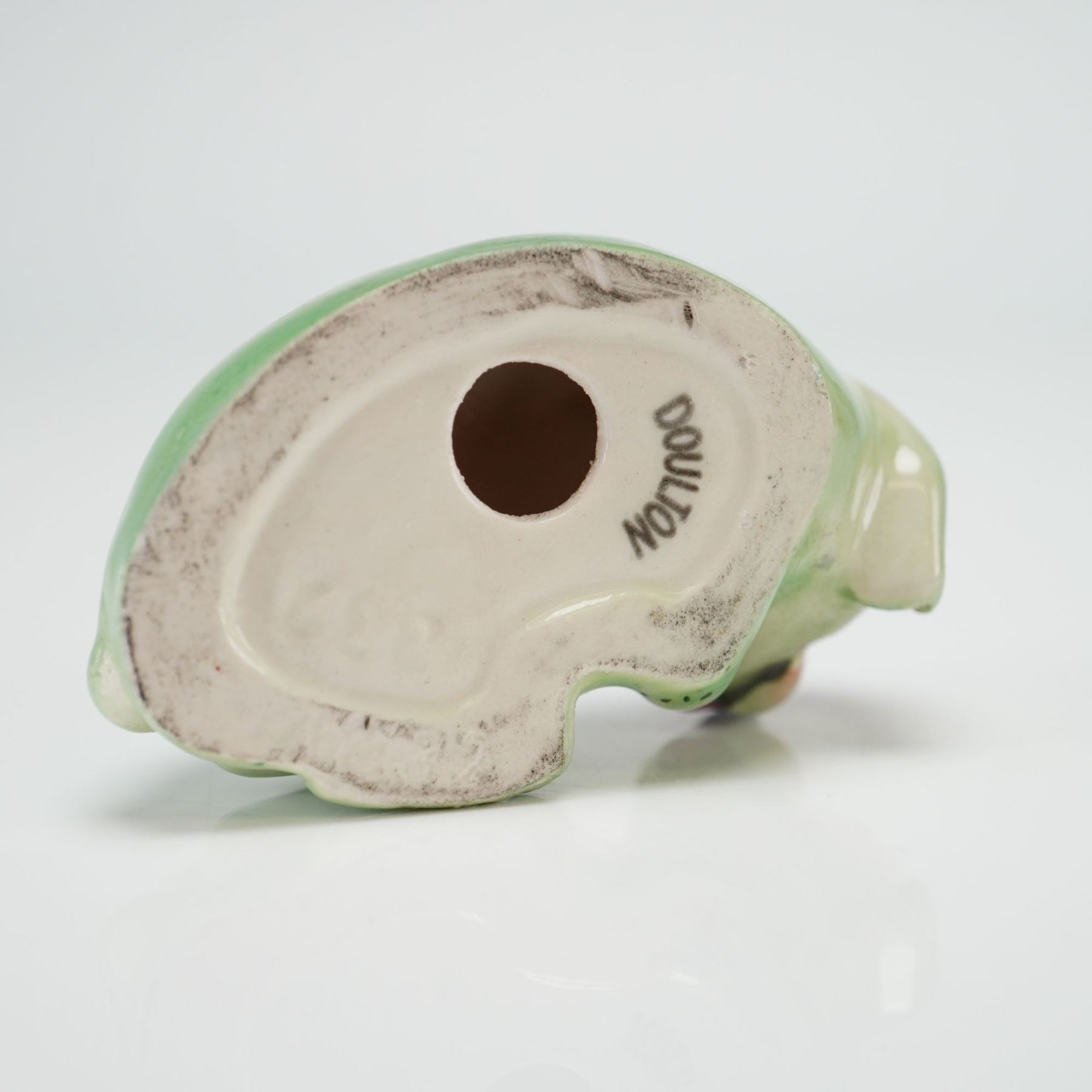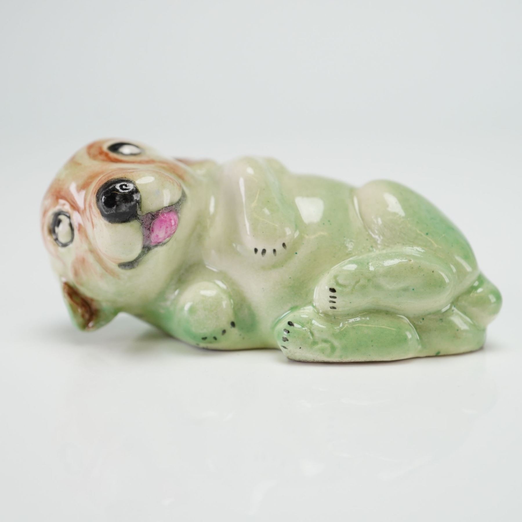 Designed by Charles Noke in Style One, Model No. 392, this figurine depicts a dog reclining on its back with its paws raised and tongue out. The piece features a pale green body with brown patches on the head. The eyes are rendered in black and white, the nose in black, and the tongue in pink, with small black dots indicating the claws. The underside is marked Doulton.