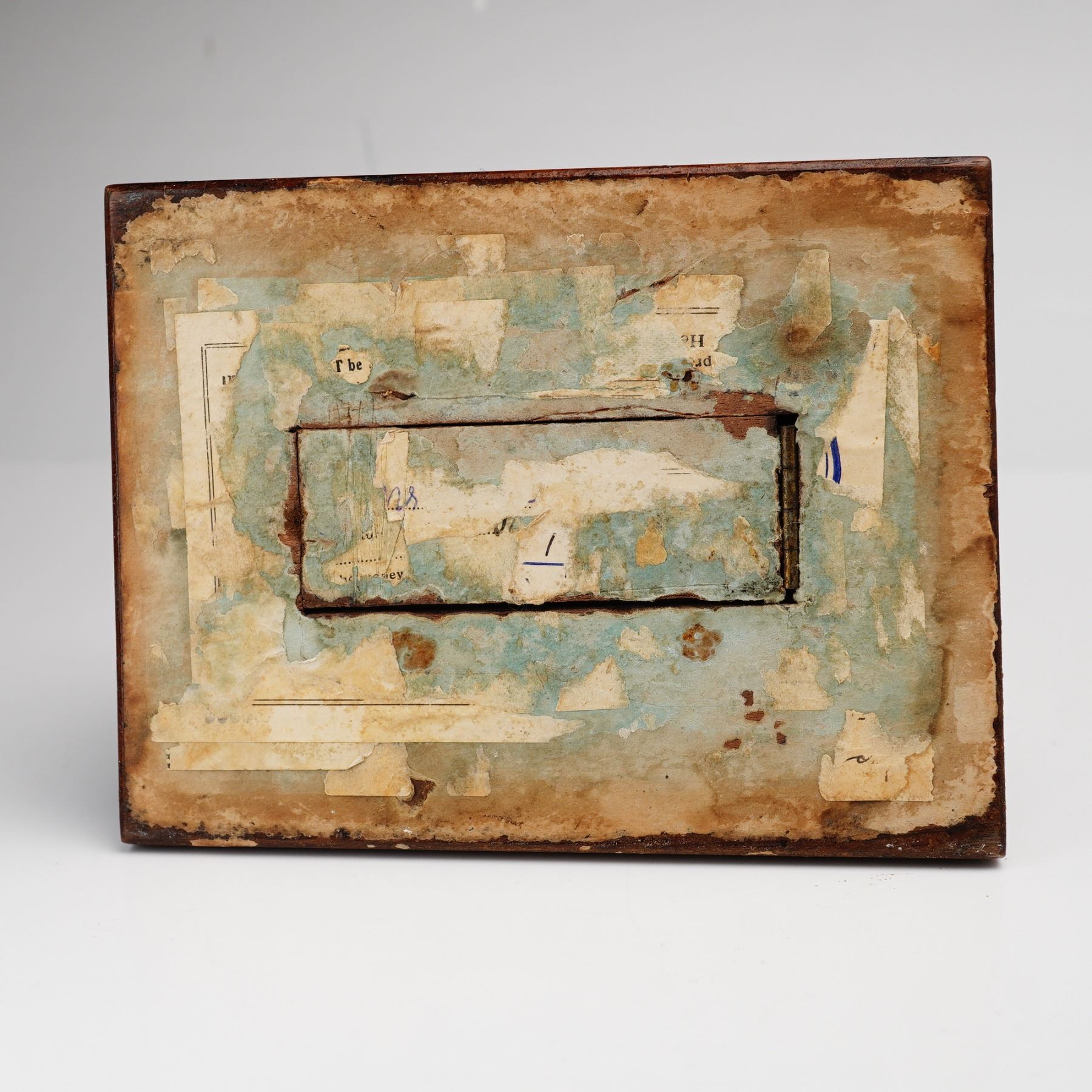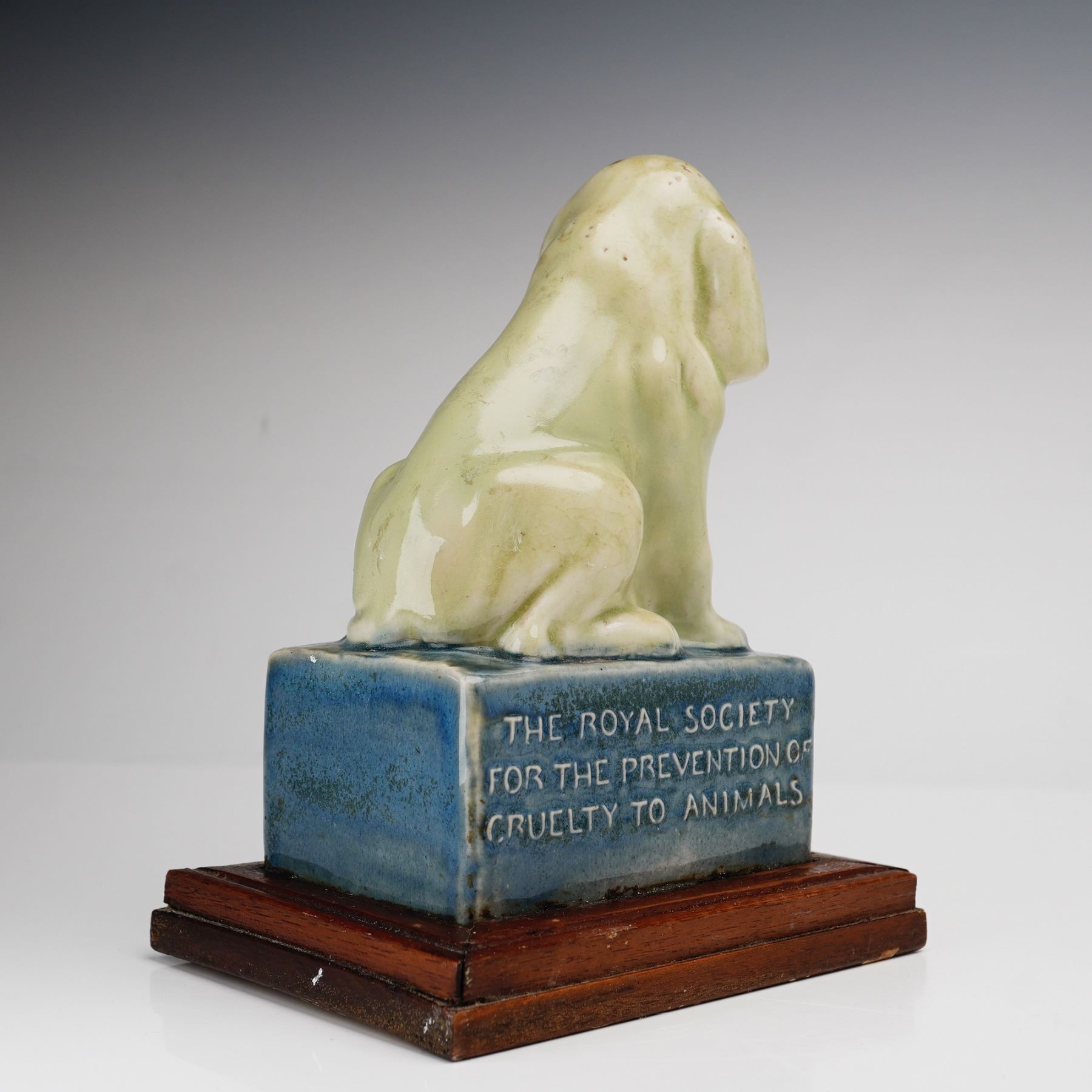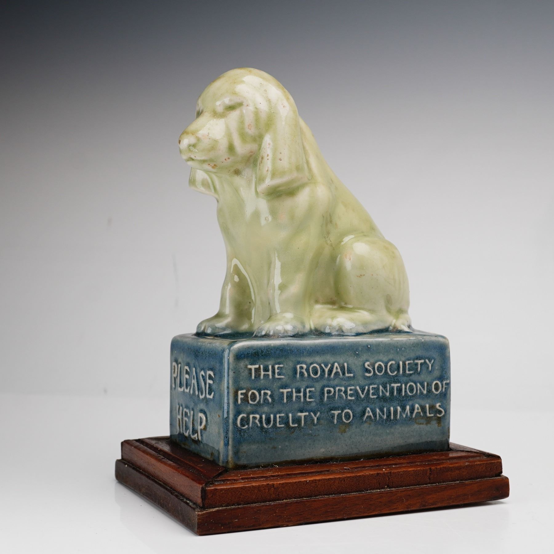 A Doulton Lambeth stoneware collecting box created for the Royal Society for the Prevention of Cruelty to Animals. The item features a modeled figure of a seated dog, rendered with a simplified, rounded form and finished in a mottled, pale celadon-green glaze. The dog sits atop a rectangular plinth with a mottled blue-gray glaze. The plinth features raised, molded lettering on all four sides. The front and back of the ceramic base read THE ROYAL SOCIETY FOR THE PREVENTION OF CRUELTY TO ANIMALS, while the sides read PLEASE HELP. The ceramic portion is mounted to a tiered wooden base with a dark mahogany finish. The underside of the wood base includes a small, metal-hinged trapdoor for the removal of coins. The underside retains fragments of old, degraded paper with partial printed letters including T be, He, ud, and ey. Handwritten inventory marks in blue ink on the underside include the number 128 and a diagonal slash mark.