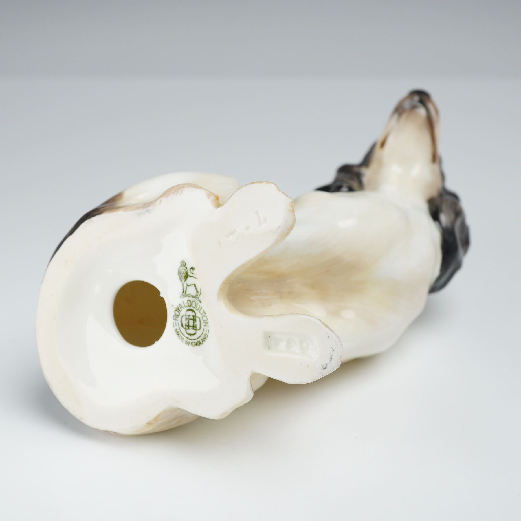 This Royal Doulton porcelain figurine depicts a seated King Charles Spaniel. The figure is crafted from glazed porcelain and features hand-painted black and white markings with brown eyes. The underside of the piece bears a green underglaze factory mark featuring a lion standing atop a crown, positioned above a circular stamp containing an interlocking monogram and the words Royal Doulton and Made in England. An impressed model number 1720 is visible on the underside of one paw. Additionally, the underside of another paw contains faint incised decorator marks appearing as the letters ZL.