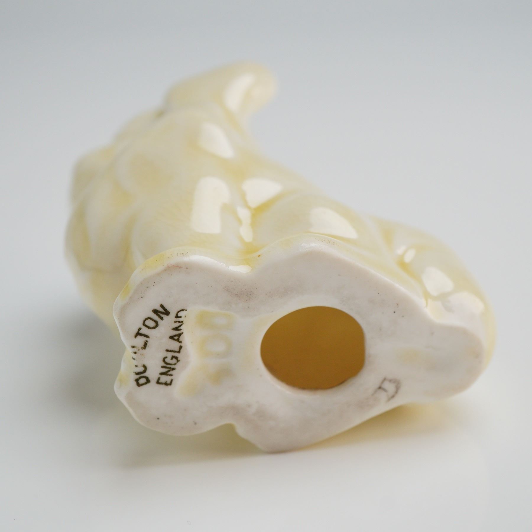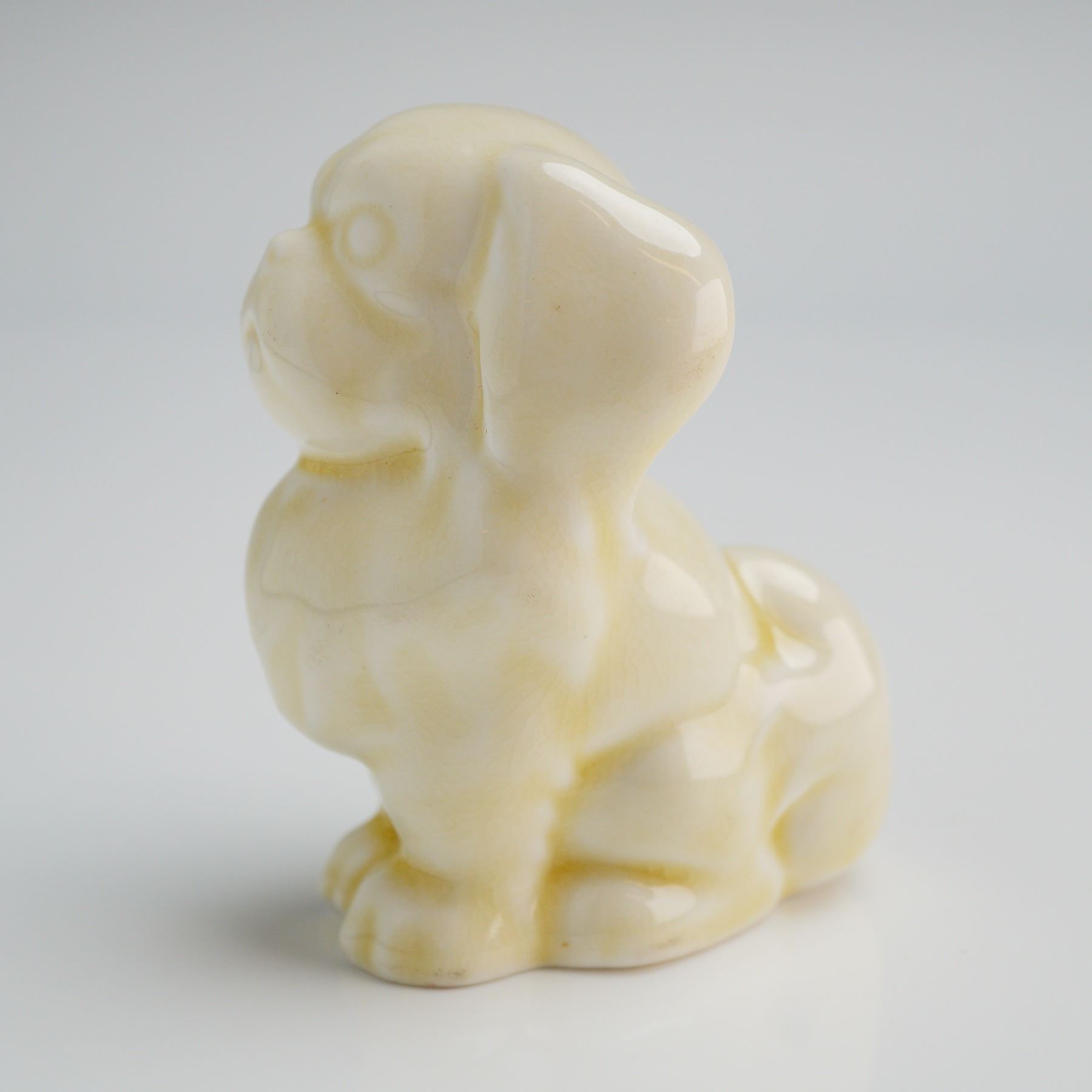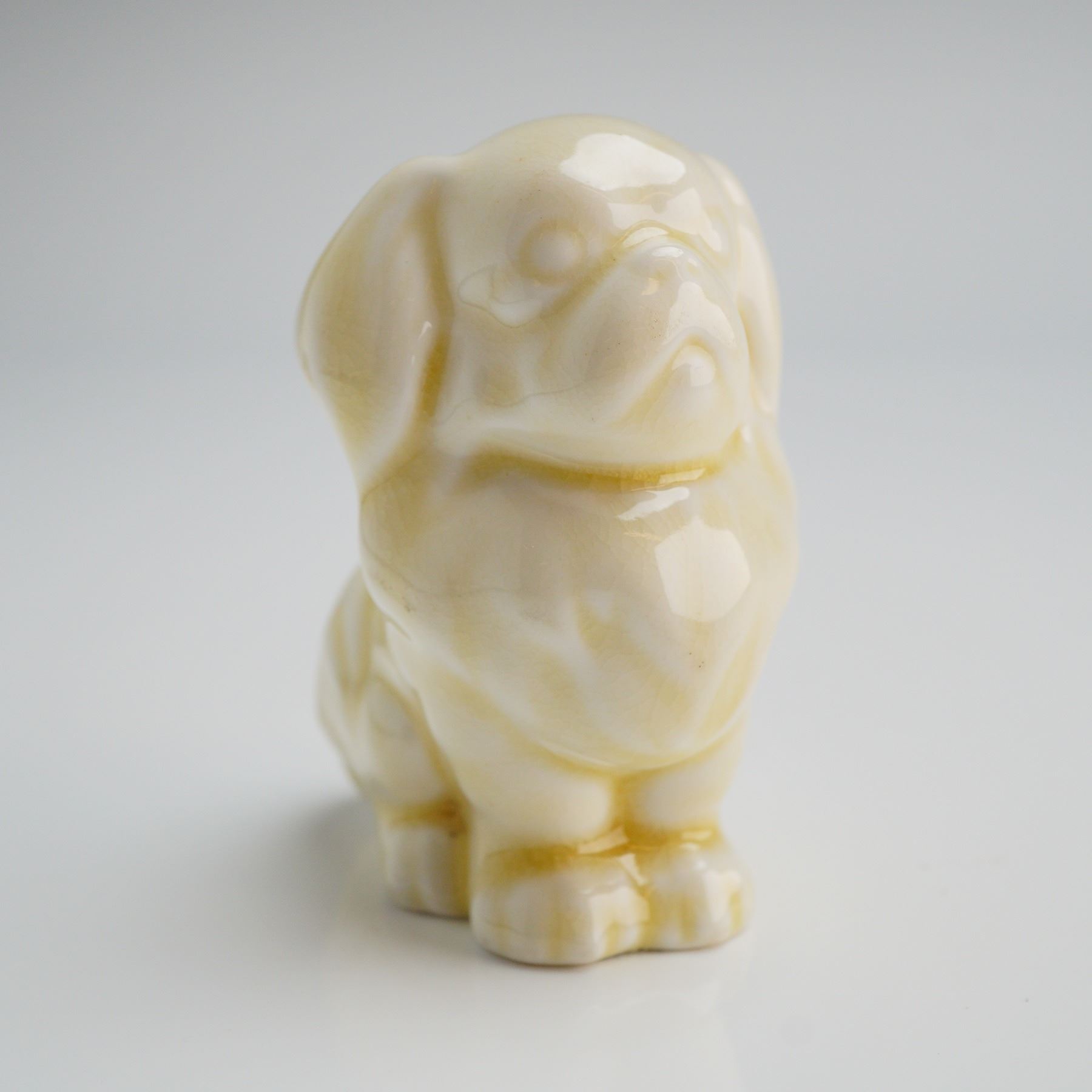 A single glazed ceramic figurine manufactured by Doulton, England. The piece depicts a stylized sitting Pekinese dog. finished in a high-gloss, pale cream or buttery yellow glaze. The glaze exhibits subtle tonal variations. The base features a central vent hole and visible manufacturer marks. Markings include a black stamped transfer reading DOULTON ENGLAND and impressed number.