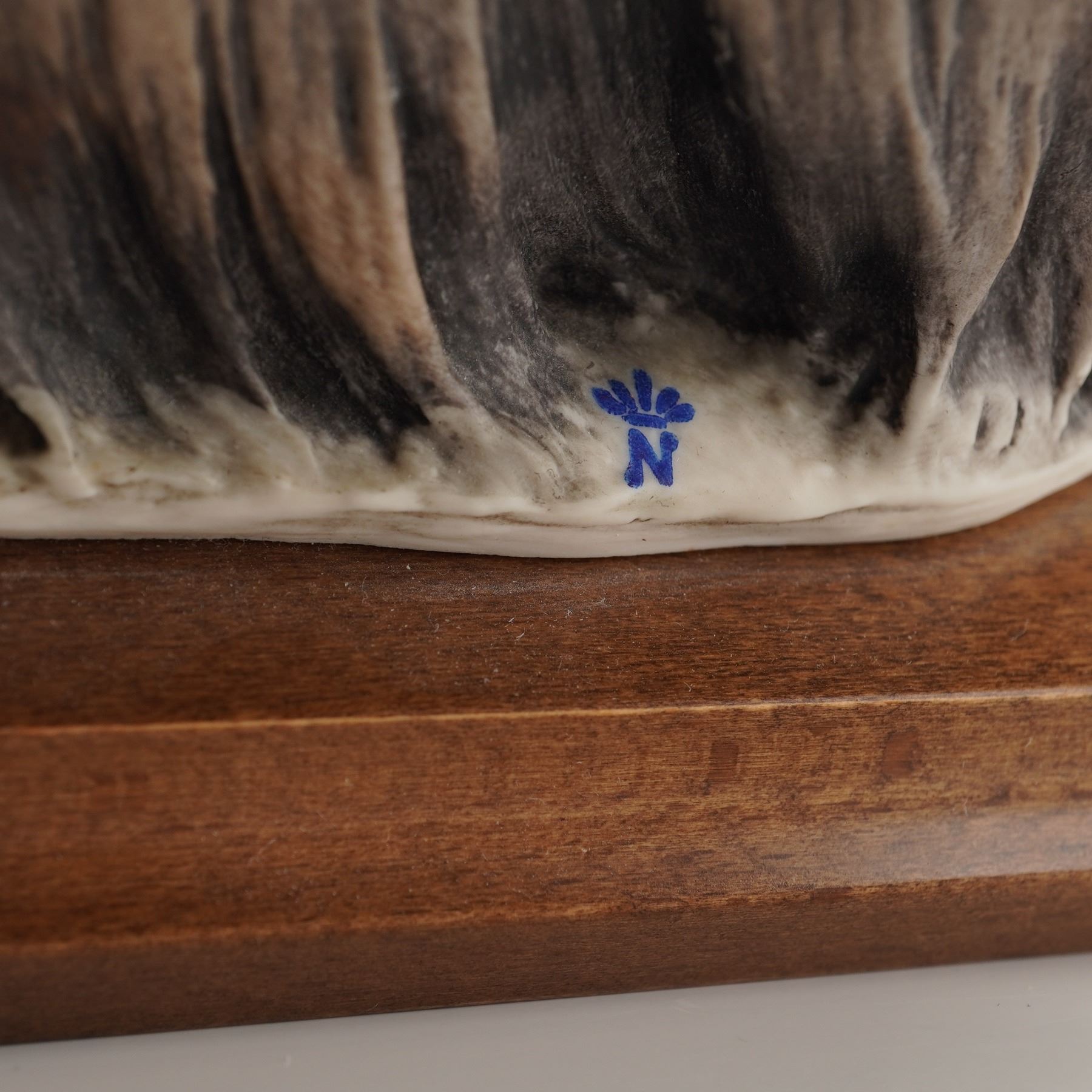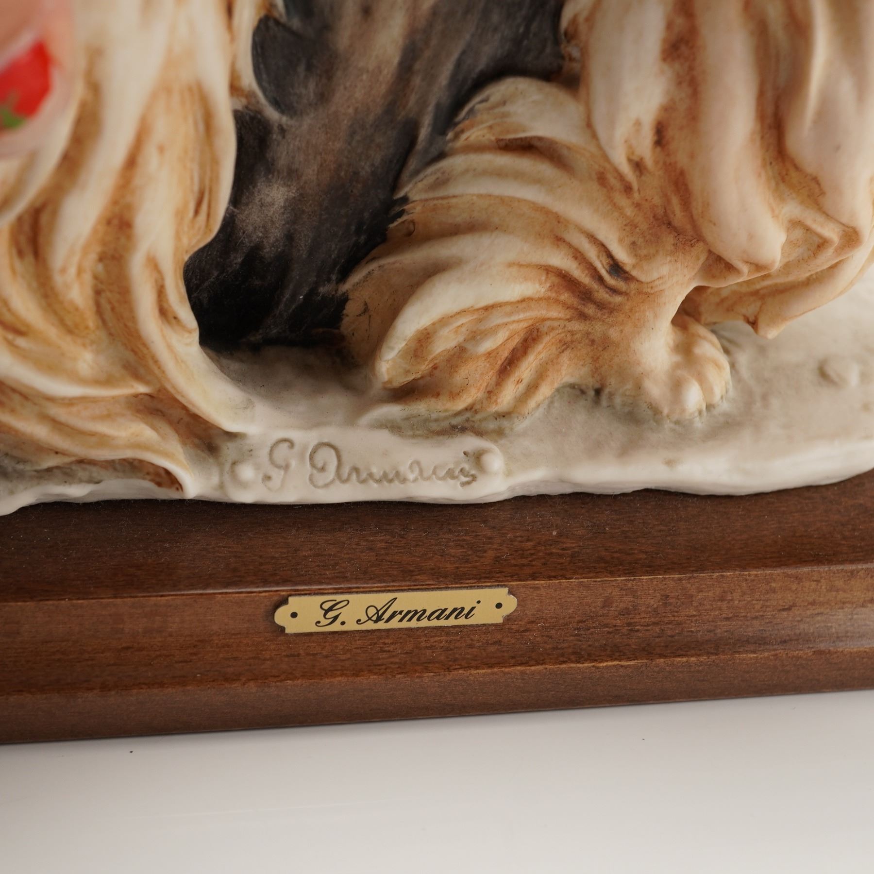 The figurine is rendered in a naturalistic style with highly detailed, flowing fur painted in shades of tan, brown, and cream over a darker body color. The Pekingese is attached to a rectangular, stained wooden plinth base. The porcelain base is impressed signed "G. Armani" in script. A blue transfer mark depicting a stylized crown above the letter 'N' is visible on the ceramic base. A brass-toned plaque affixed to the front of the wooden base is inscribed "G. Armani."