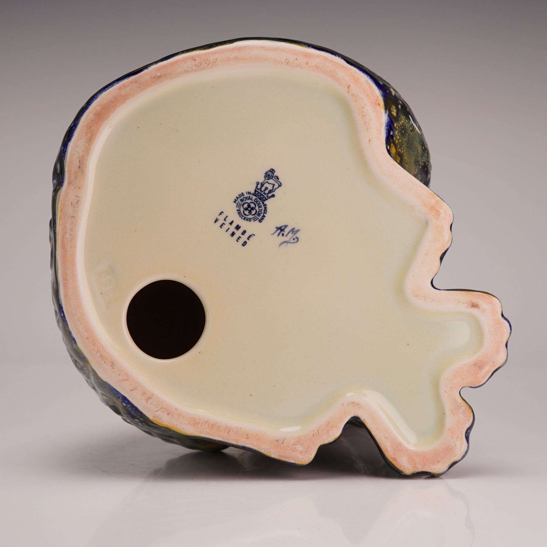The figure is depicted in an attentive pose with prominent inset green glass-style eyes. It features the Flambe Veined glaze technique, characterized by a warm ochre-yellow color on the head and ruff that transitions into a deep, mottled midnight blue and black body with lighter speckled tones. The underside bears the Royal Doulton Flambe Veined backstamp.