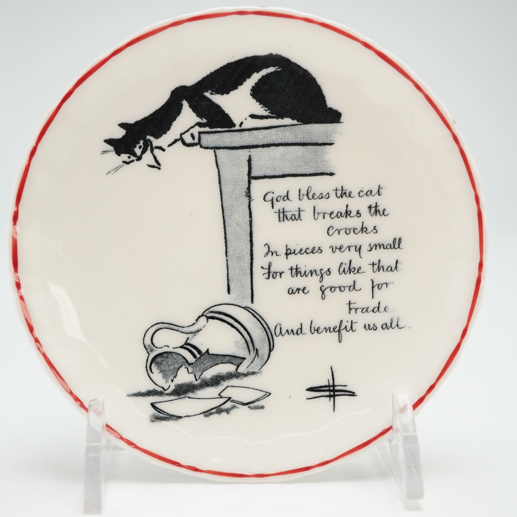 This dish features a graphic illustration by artist David Henry Souter depicting a black and white cat positioned atop a table while observing a fractured ceramic jug on the floor. The composition includes the scripted inscription, "God bless the cat that breaks the crocks in pieces very small, for things like that are good for trade and benefit us all," alongside a secondary commercial inscription for "Williams for reliable Glass & China Richdale & Worthington." The ceramic piece bears the artist's signature within the transfer and is finished with the official Royal Doulton backstamp to the underside.