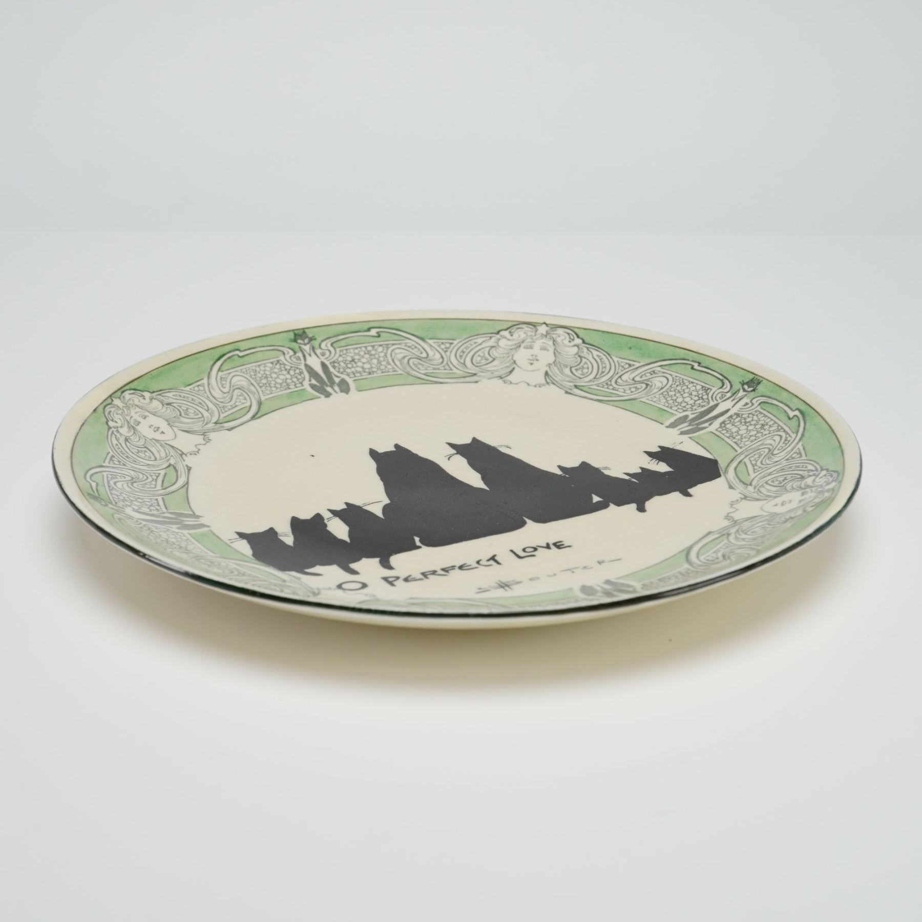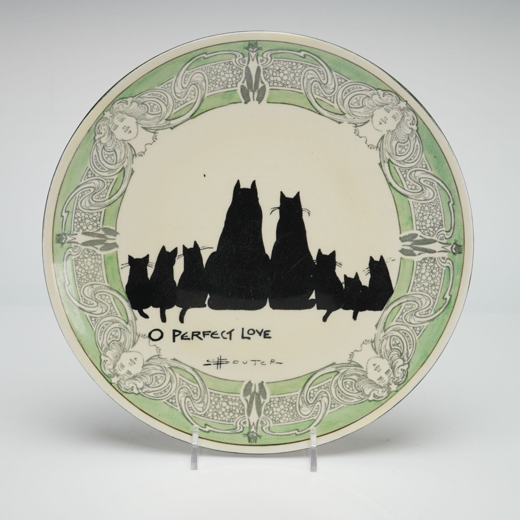 This earthenware display plate was manufactured by Royal Doulton in England and features designs by Australian illustrator David Henry Souter. The piece is part of the Souter Cats series, also known as Kateroo seriesware. The central decoration consists of a black transfer-printed silhouette of eight cats in various sizes, titled below in block lettering O PERFECT LOVE. The artist signature SOUTER and his distinctive monogram are printed directly below the title. The wide rim is decorated with an elaborate Art Nouveau border in shades of sage green and gray, depicting four stylized female heads with flowing hair intertwined with whiplash curves, mosaic patterns, and small cat motifs. The reverse bears a green underglaze Royal Doulton factory mark.