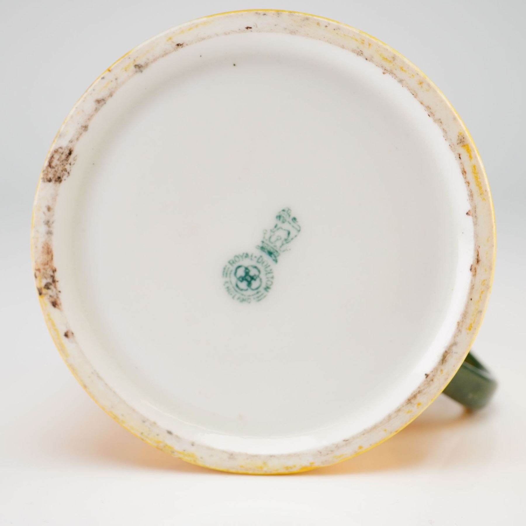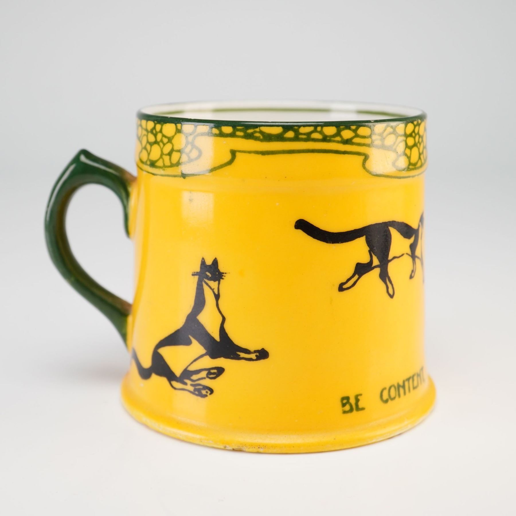 A Royal Doulton glazed earthenware cup from the Souter Cats series ware line, designed by artist David Henry Souter. The cylindrical form features a slightly flared base and a simple D-shaped handle. The decoration consists of a bright yellow ground with black transfer-printed illustrations of whimsical cats in various poses. The phrases 'Be Content the Sea Hath Fish Enough' are printed on the body. A dark green honeycomb pattern border is applied to the rim, and the handle is finished in a dark green glaze. The body of the cup bears the stylized signature of David Henry Souter, featuring a double cross symbol followed by the name Souter. The base bears the Royal Doulton backstamp.